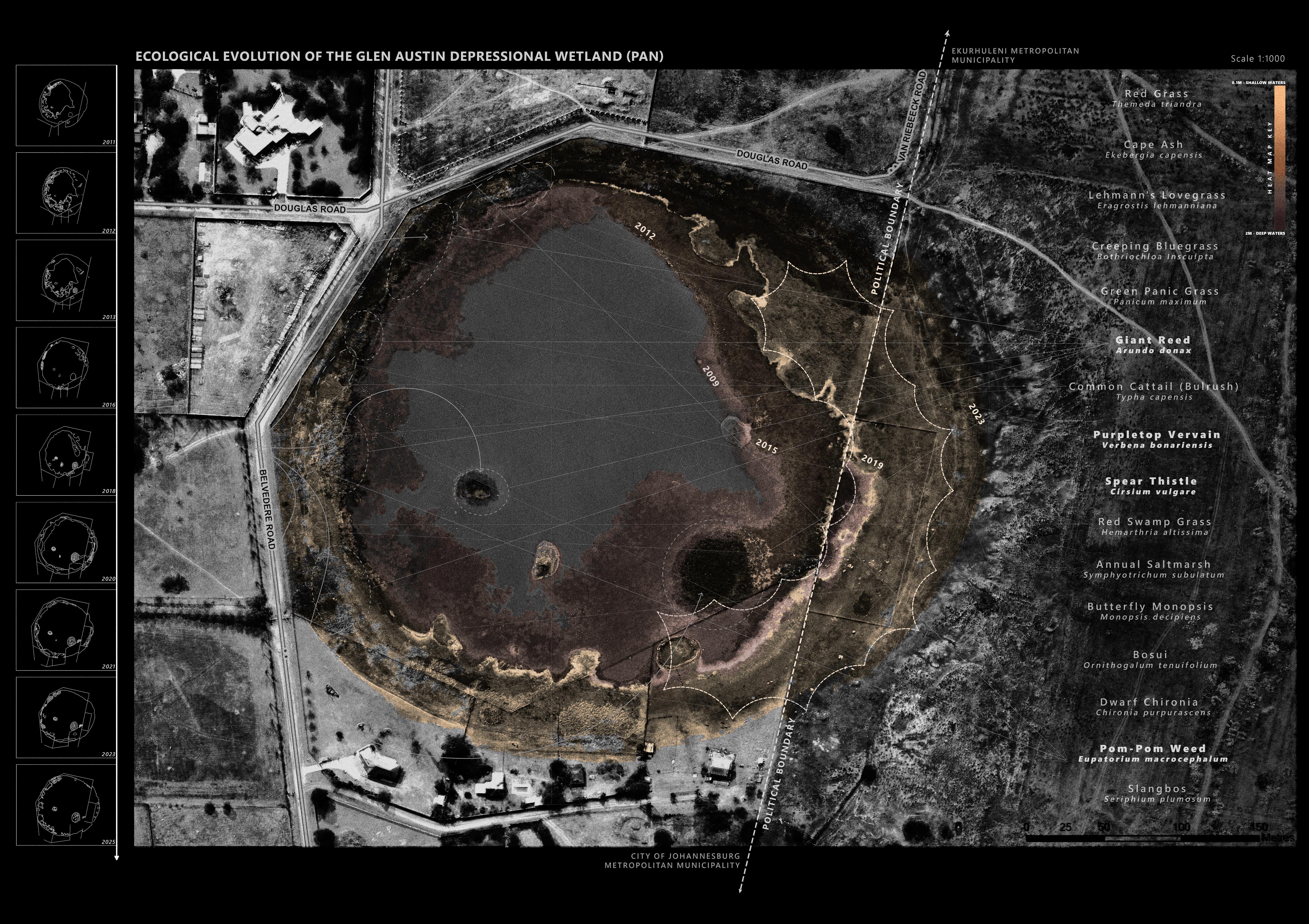 complex physiological system will provide me conceptual and practical inspiration that can be translated into an architectural intervention, helping people engage with the complex ecological systems of the site found in air and water. This mosquito species reproduces in hot and humid climates, a possible future climate for Johannesburg. Climate change could increase the probability of mosquito-borne diseases that have as of now been contained due to the city’s cooler, dryer climate. This assumption will be tested by a review of academic literature on the subject. The outcomes of this review will be used as an inspiration point to explore architectural interventions centered on the Glen Austin bullfrog pan that aim to engage with future mosquito breeding grounds in urban environments, and how it may be possible to utilize depressional wetlands (pans) as points of programmatic engagement.