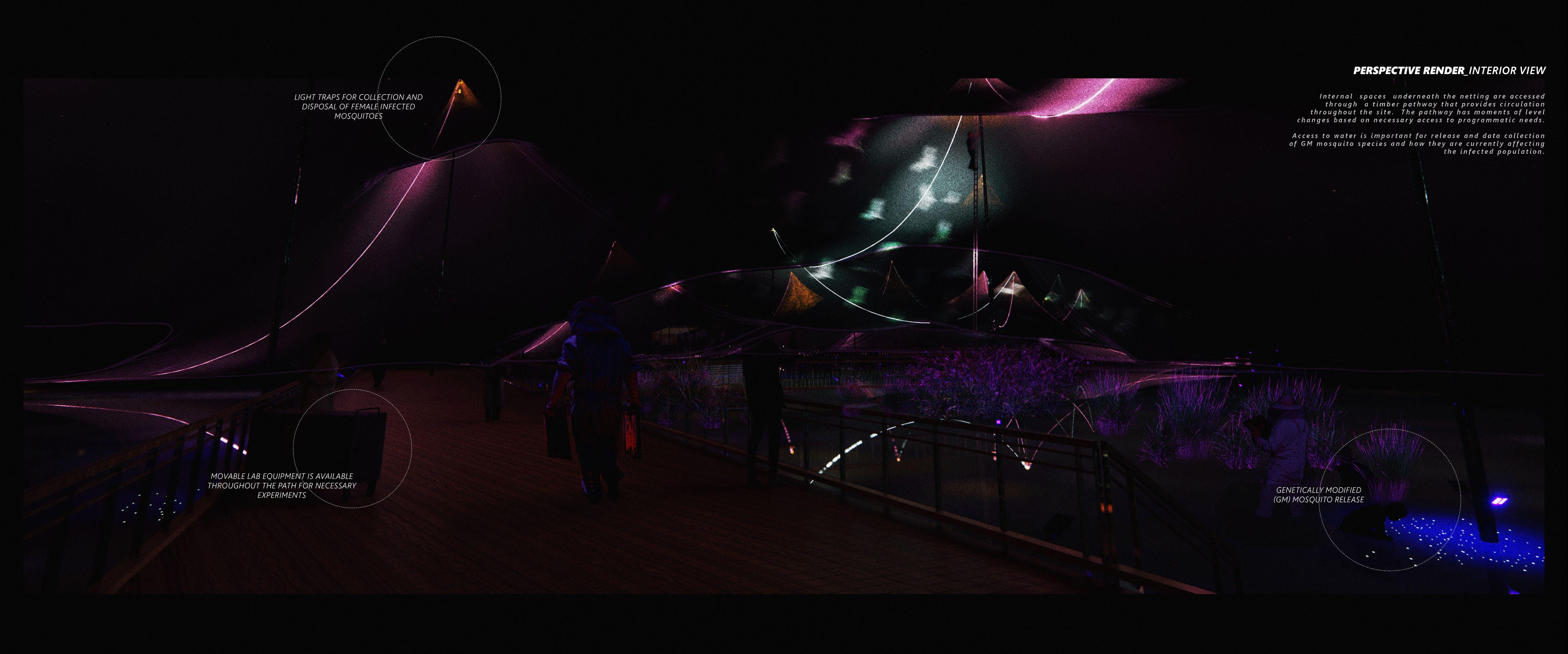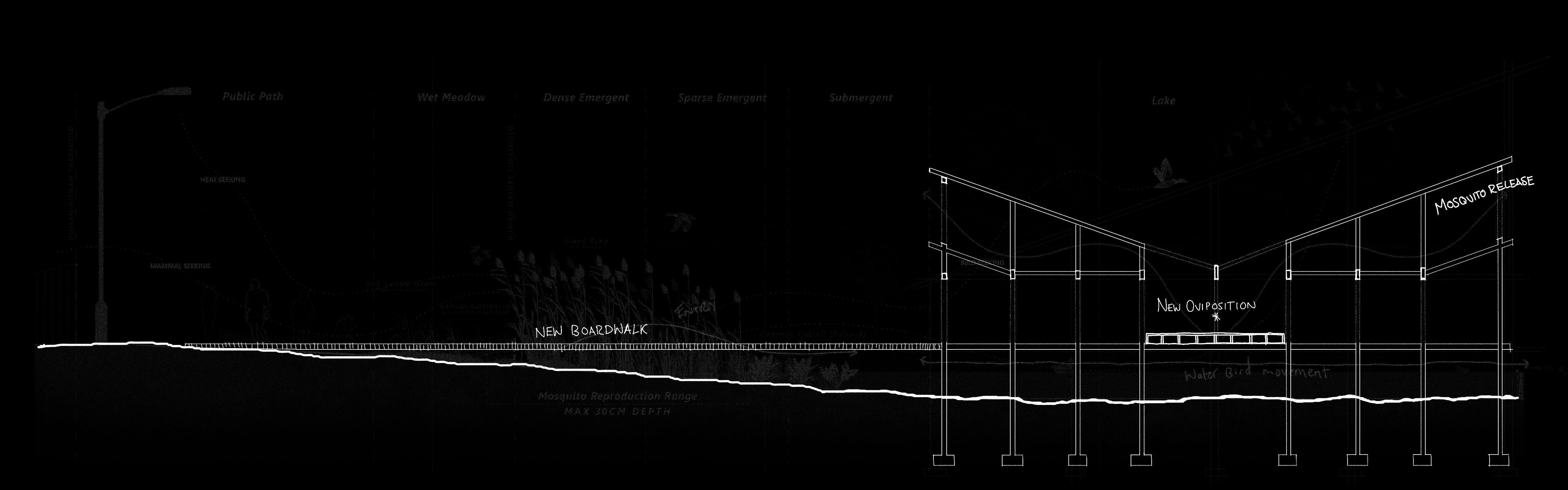 This research project aims to understand the microbiology and life cycle of the mosquito to inform an architectural design that will prevent the spread of mosquito-borne disease on the ecologically threatened Glen Austin Bullfrog highveld pan in Midrand, Johannesburg.