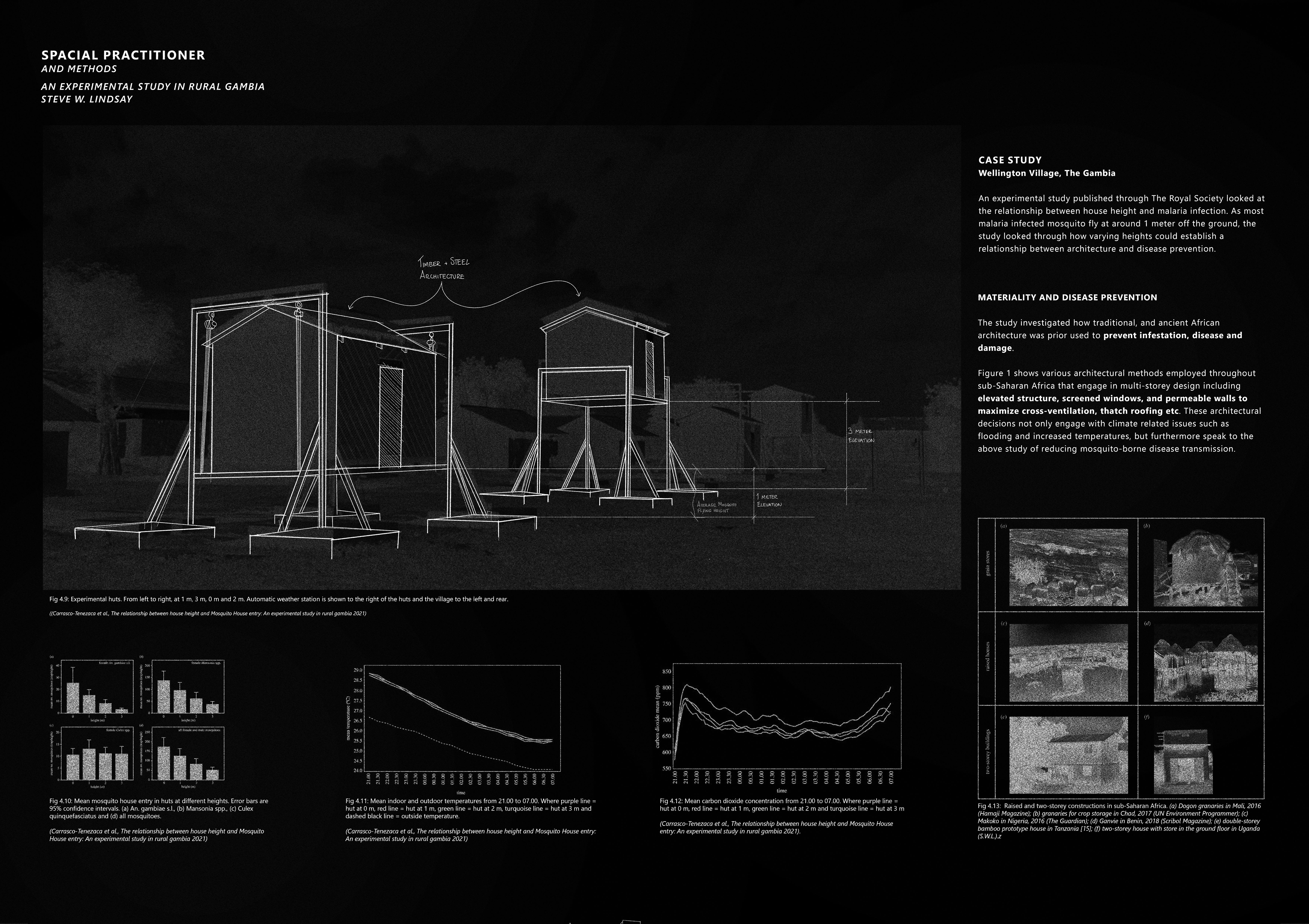 Quarter 3 was a turning point in refining both the conceptual depth and architectural clarity of my project. Feedback from my Q2 review emphasized the importance of situating mosquitoes within broader ecological systems, examining not only the insect itself but also its relationships with predators, humans, and the landscape. This ecological lens expanded my focus beyond the mosquito, positioning architecture as an orchestrator of multi-species interactions. Moreover, I was told to begin engaging with various precedents that may help me better understand how existing architecture has been utilized to combat outbreaks of malaria in other affected countries, and how my research and literature can be used to fill in gaps I may find within the research.