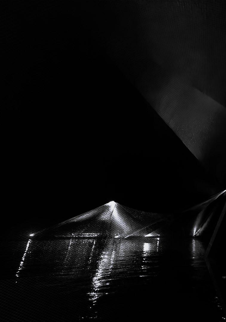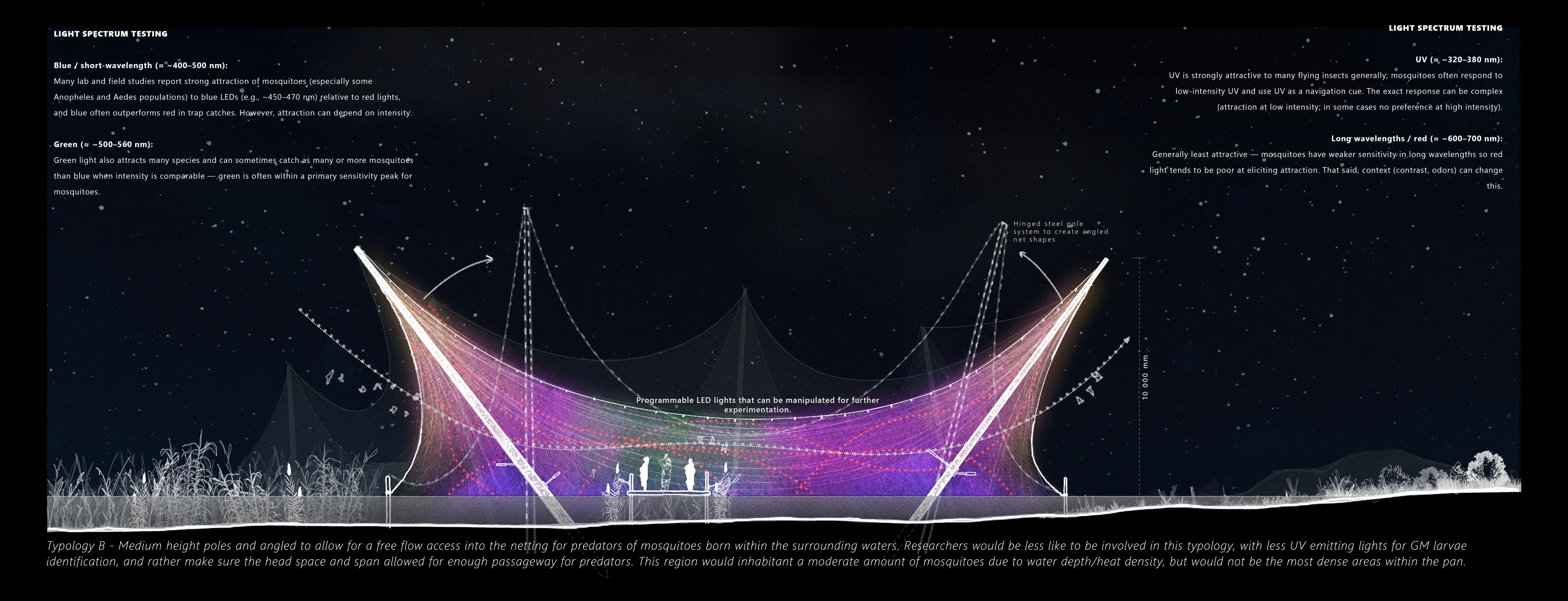For the Making aspect of Q3, I began looking into the interaction between tensile materiality and light waves of different spectrum lengths, and which combination I could use to best attract mosquitoes while reducing light pollution into the surrounding context that could potentially affect the ecosystem around it. These experiments were guided through my research into mosquitoes and similar species behaviour in the presence of artificial lighting. Towards the end of the Quarter, I continued to work on the realization of my design, landing upon a large tensile structure, made from polyester netting and spanning across high breeding areas within the pan. Running along the netting would be small LED lights that emit various colours depending on how I wanted mosquitoes to react within each specific section.