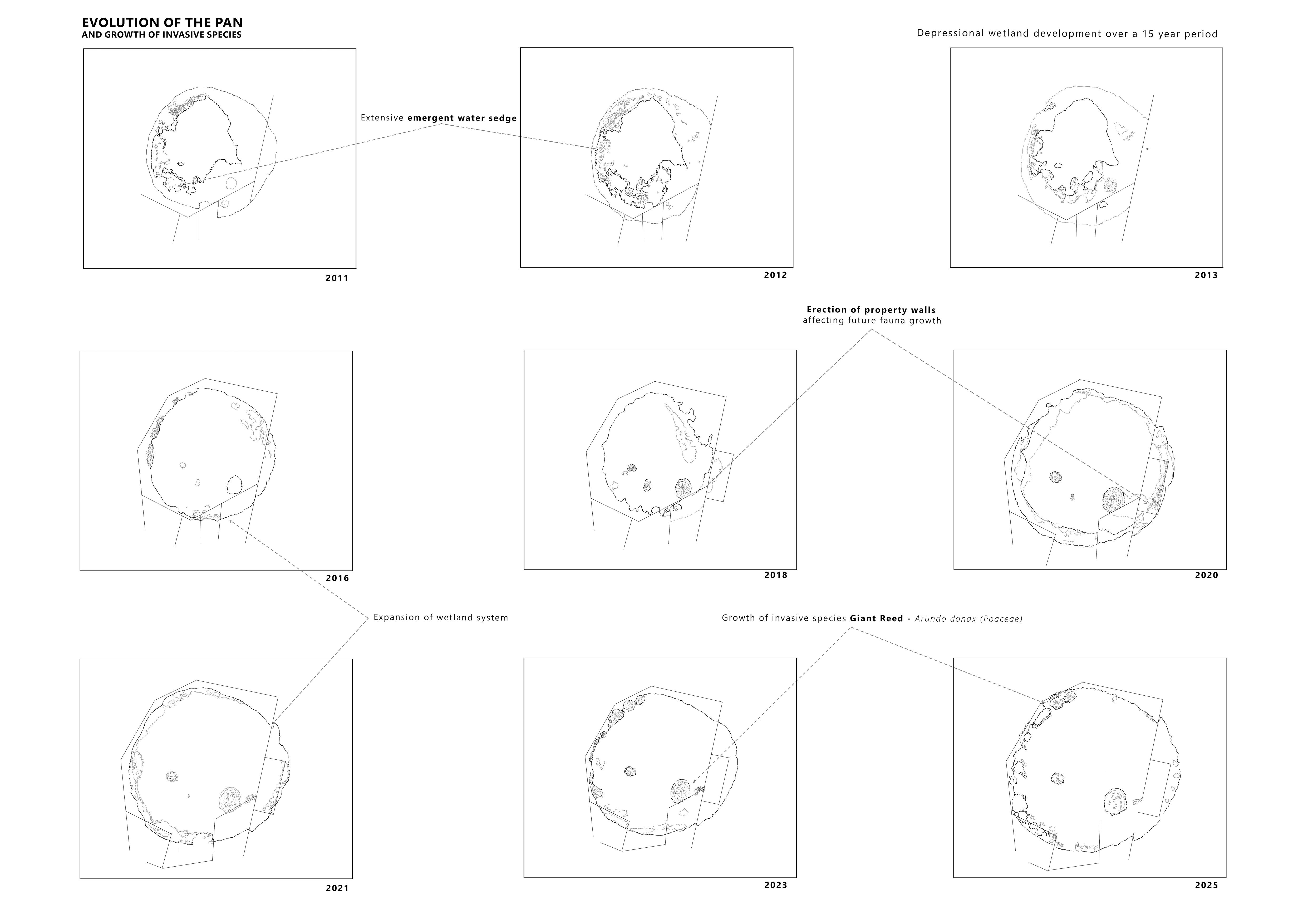 throughout the years, looking deeply into the change in water depth, flora growth and fauna development (Figure 1). Through a series of posters, I researched and analysed these aspects of the site in depth which allowed me to understand the ecological aspects of the site and potentially speculate how it may change in the future due to climate change. My findings through this analysis found that the site was in a state of constant flux, with changing water levels, plant variety and density and new fauna engaging and using the land in differing ways. It also found that a great number of invasive species of flora, most noticeably the giant reed, was overtaking the natural Egoli granite grassland of the site, which invited new species onto the wetland, and ultimately intrinsically changes the way in which the ecosystem functioned over time. I felt that although my research had depth and was well sourced which came across through my posters and graphic language, I fell flat in my attempts to create a physical artefact. I found it difficult to translate cultural perceptions of the mosquito into a physical model, which ultimately meant my progress regarding the Making requirement of the brief were not being met. From my Q1 Review, I was told to use making as a way to more deeply explore the physiological aspects of the mosquito larvae through my physical model design, which would prove to be a far more pragmatic approach to the artefact exploration. I then went into Quarter 2 with this goal.