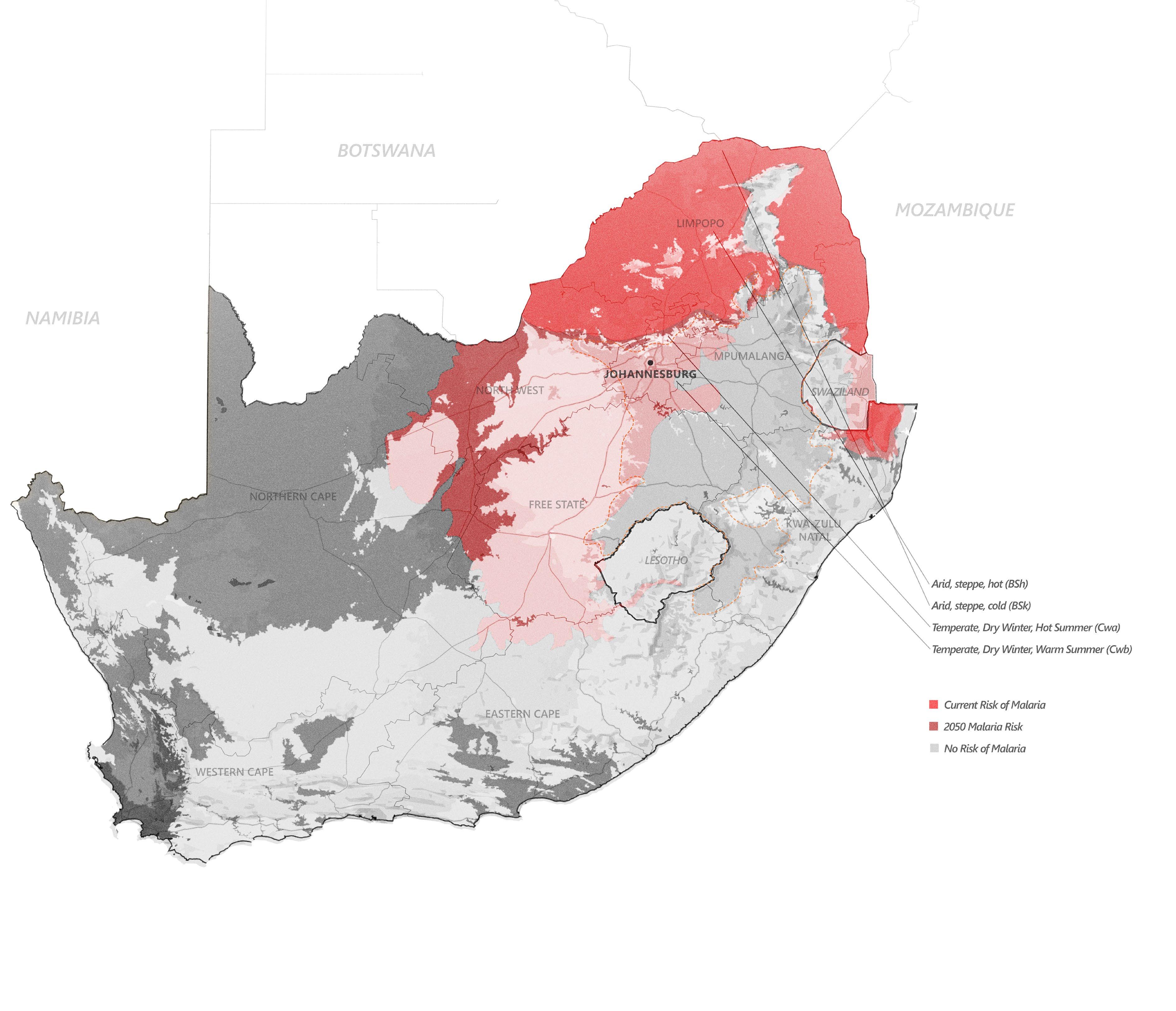 With rising temperatures and shifting climates, a dramatic rise in disease-infected species reproduction in stagnant water bodies, such as pans, lakes, swamps etc. is increasing in likeliness. Africa has historically been significantly affected by multiple vector-borne diseases. ( World Bank Group , 2013). This research project is anticipating this future climatic shift and using it as a lens to engage with how architecture could be implemented to combat or dissipate the potential ecosystem disservices that Johannesburg is set to face due to climate change.