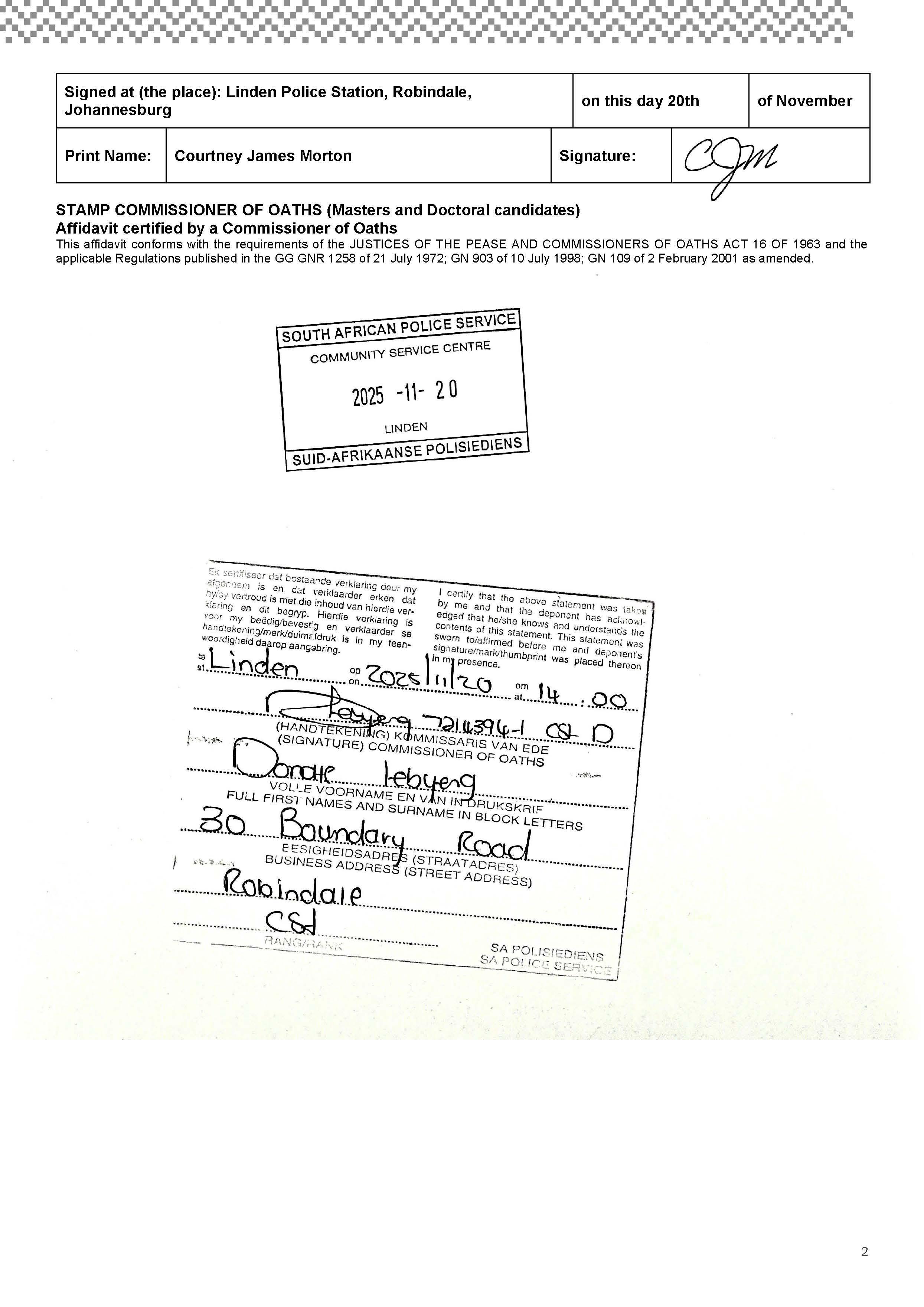 This affidavit conforms to the requirements of the JUSTICES OF THE PEACE AND COMMISSIONERS OF OATHS ACT 16 OF 1963 and the applicable Regulations published in the GG GNR 1258 of 21 July 1972; GN 903 of 10 July 1998; GN 109 of 2 February 20 01 as amended.