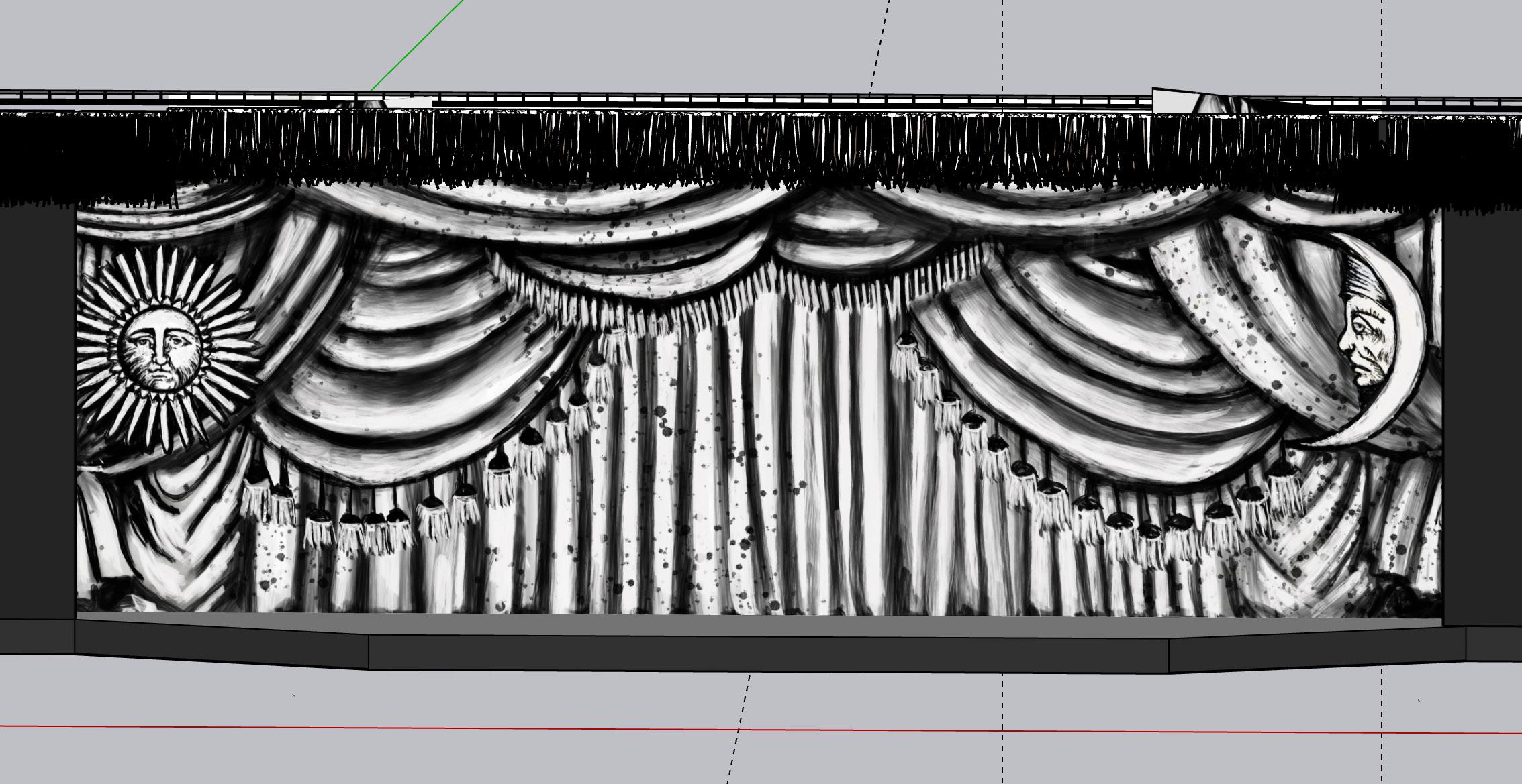 environment to the next with the turn of a page worked well for us. Having it on wheels and fully mobile allows it to travel off stage into the wings creating room for large choreographic numbers and moments for us to change props within it away from audience view. We liked the idea of using flat curtains to help jump us from place to place, three full scale 2D printed curtains anchor us in the overall visual aesthetic, hand drawn, splattery and inky they quickly move us between scenes and allow some fun reveals when we want to surprise and delight the audience.