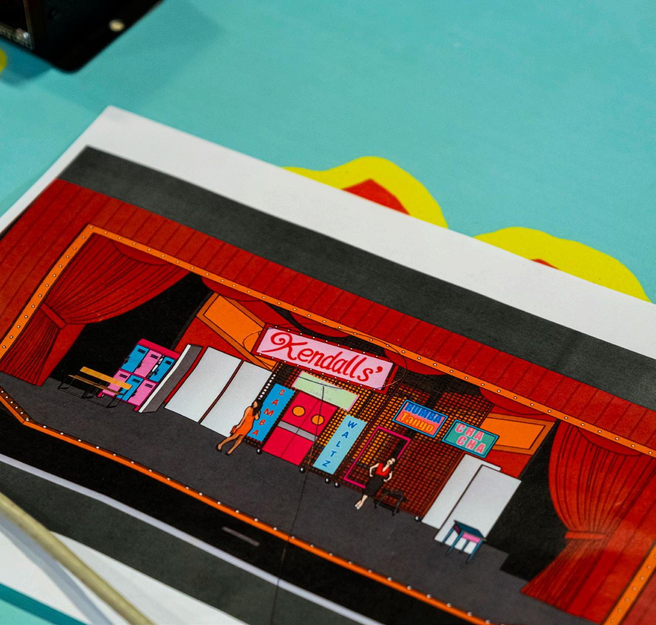 Strictly Ballroom The Musical marks the end of an era for The Court Theatre. It’s the final show in The Shed and I wanted to mark this special moment in full scale. The driving force behind the design for this production is in fact The Court Theatre itself. When beginning the process, I was inspired by the foyer, its textures, colours, materials, and quality. On stage you will see the iconic shipping container box office represented within the vibrant red proscenium arch with recognisable lightbulb frame, a motif we have carried throughout the whole show. Also nods to the bar’s rusty steel mesh, concrete floors, corrugated iron exterior, and internal brick walls, all significant elements that make up that beautiful foyer outside the auditorium doors.