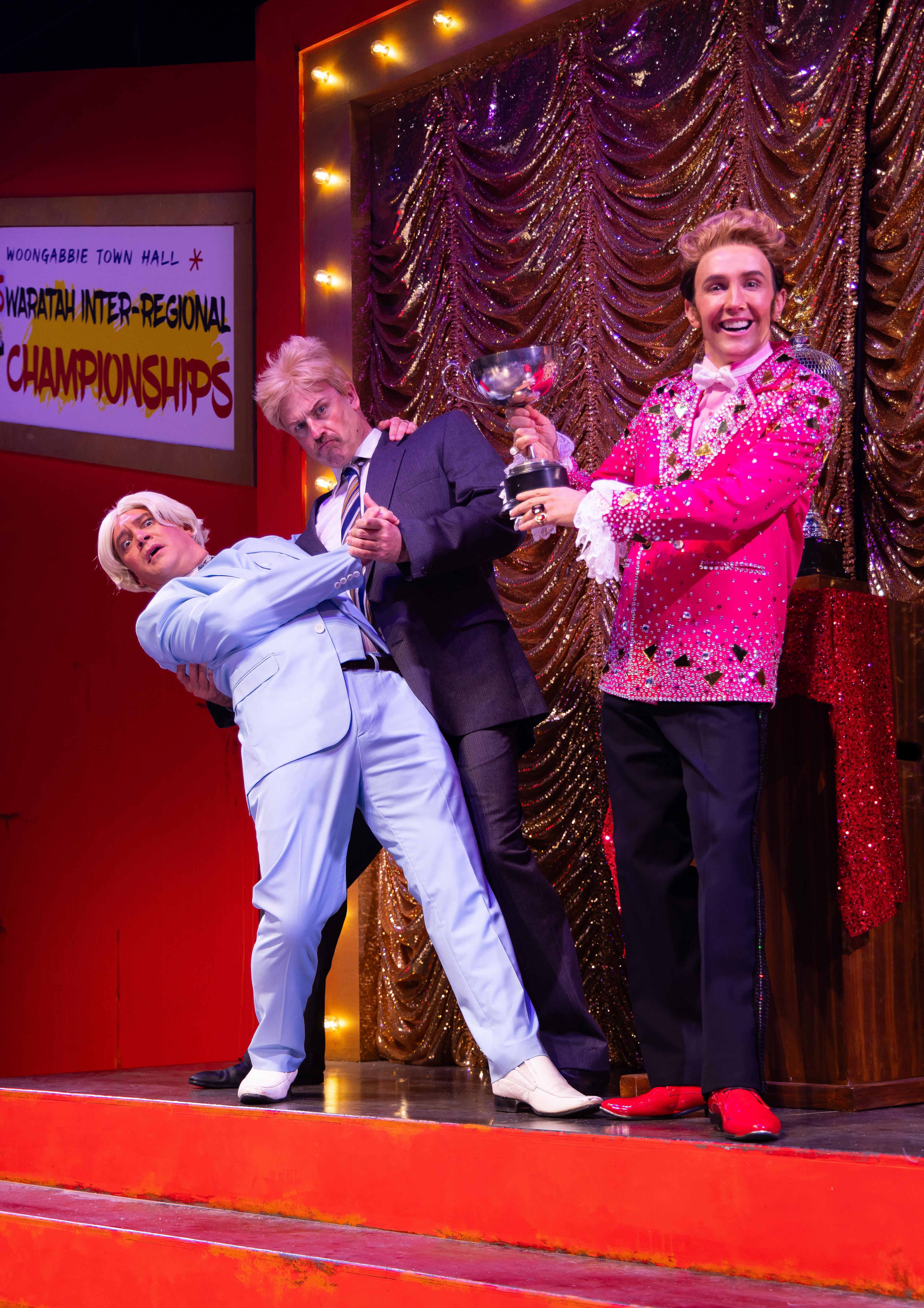 Baz Luhrmann’s classic films have a special place in our hearts, his iconic Red Curtain Trilogy: Strictly Ballroom, Romeo + Juliet, and Moulin Rouge are some of our favourite films to date. His aesthetic is characterised by a bold and eclectic visual style that blends theatrical opulence with contemporary iconography. He often uses vibrant colours with a mix of modern and historical elements to create immersive worlds. We wanted our design to embody a Baz Luhrmann aesthetic, taking inspiration from all of his films. We have built a heightened world dripping in sequins, ruffles, sparkles, fringing, advertising, branding, spandex, and feathers, set against a rural Australian 1980s backdrop. When we began this journey, we kept coming back to Strictly Ballroom, taking reference and inspiration directly from the movie in order to stay true to the period, but also to add some fun “Easter eggs” for audiences who know and love the film. We approached this project knowing we would need to collect a vast amount of ballroom dresses. A traditional waltz gown normally costs a few thousand dollars, so we had to build the vision from a different angle as that was just not in our budget. Many of the garments we sourced from Thailand, China, and Australia, and then we added glitz and glamour to them as well as some pieces made in house. The glorious men’s Latin jumpsuits were made by our fabulous team, and Shirley’s frocks were also handmade. There are about 165 full costumes in the show, 58 wigs, 28 headpieces, 62 pairs of shoes, and approximately 70 understudy garments standing by in the wings.