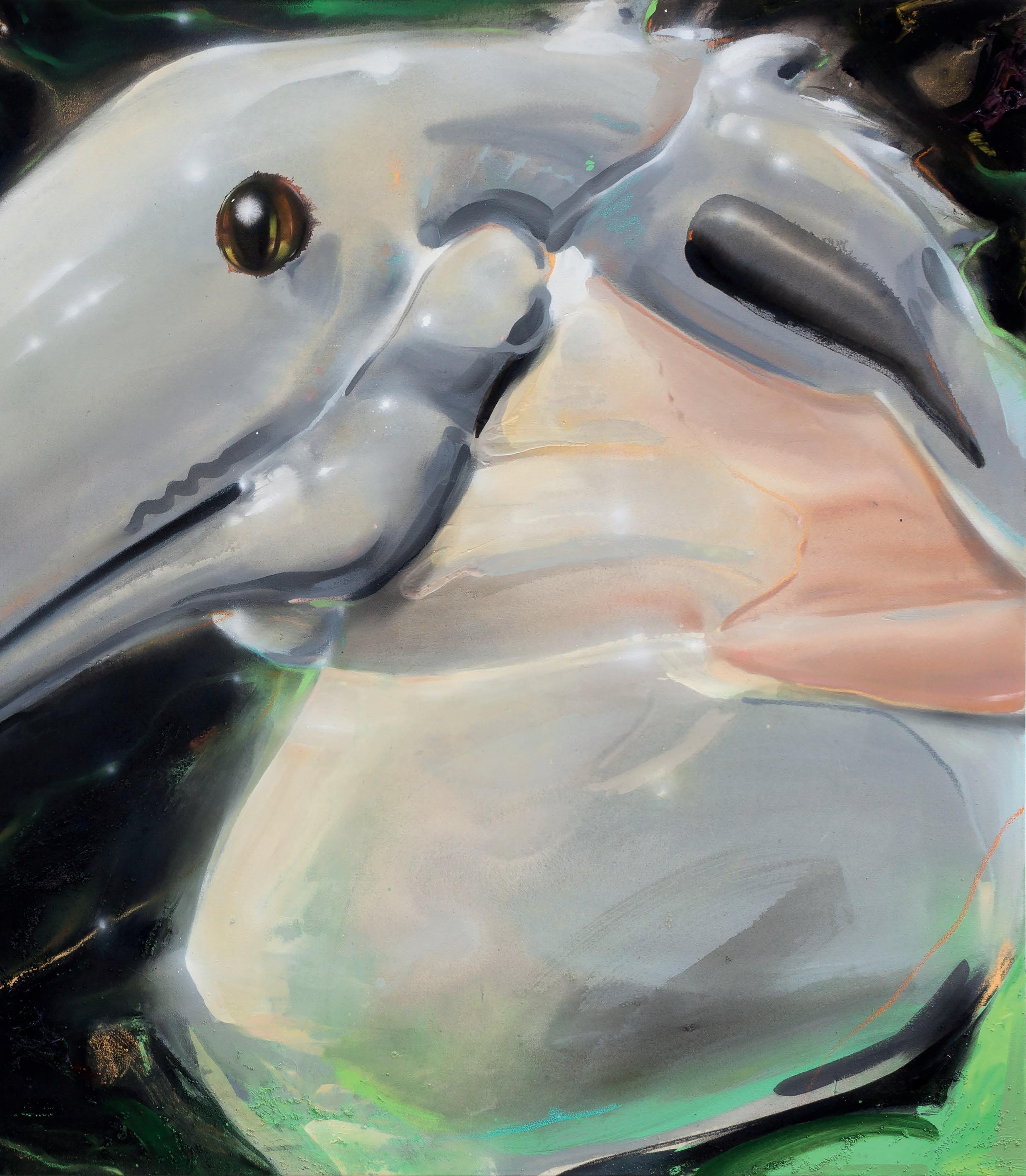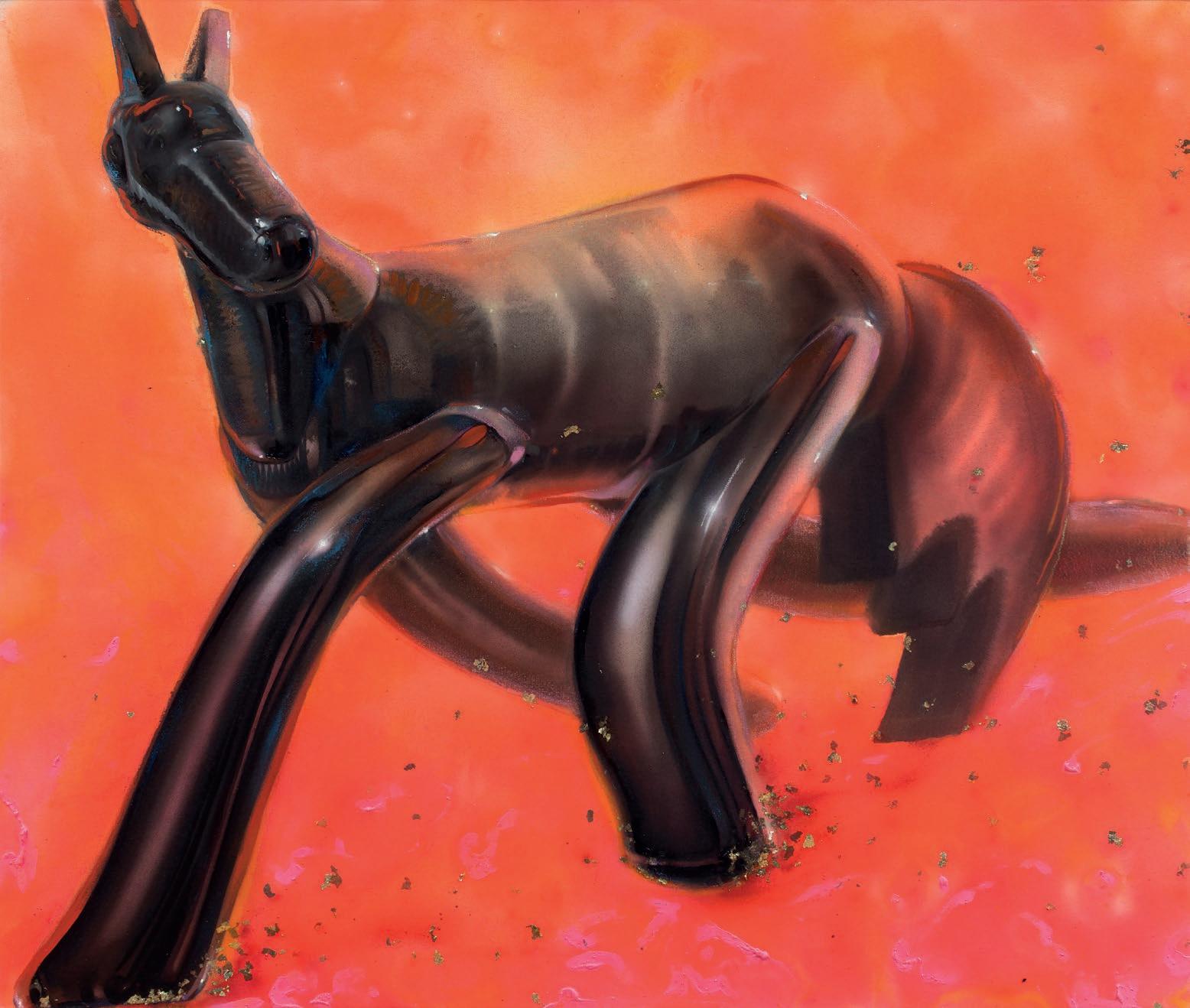 Despite the kitschy tone and powerful highlights almost contrasting with classical iconography, the choice of a glossy and plastic appearance precisely emphasizes the irony underlying Cegani's paintings.