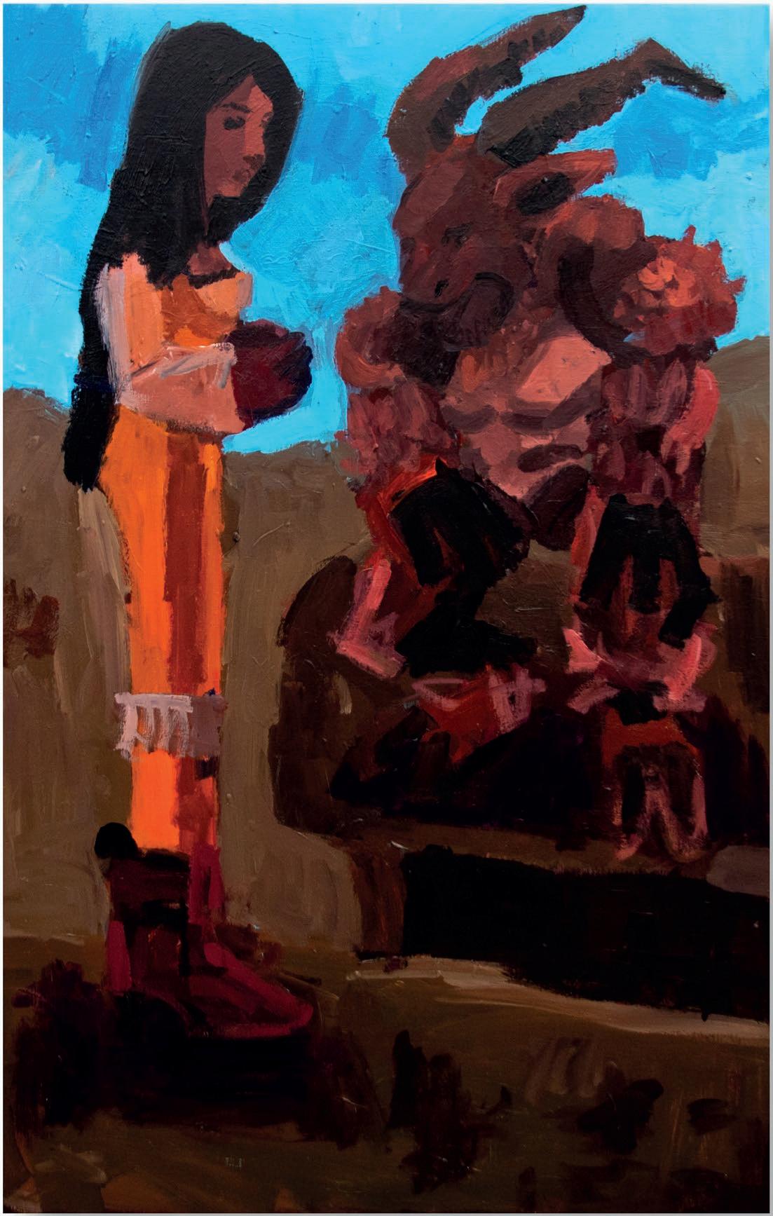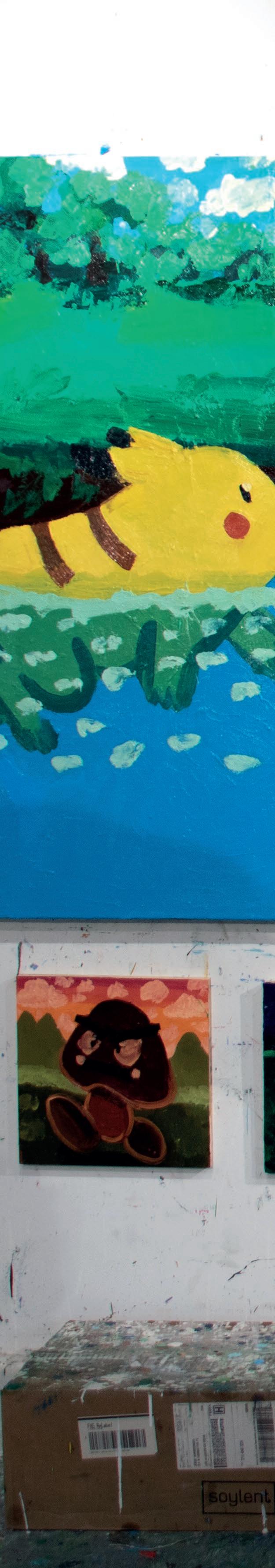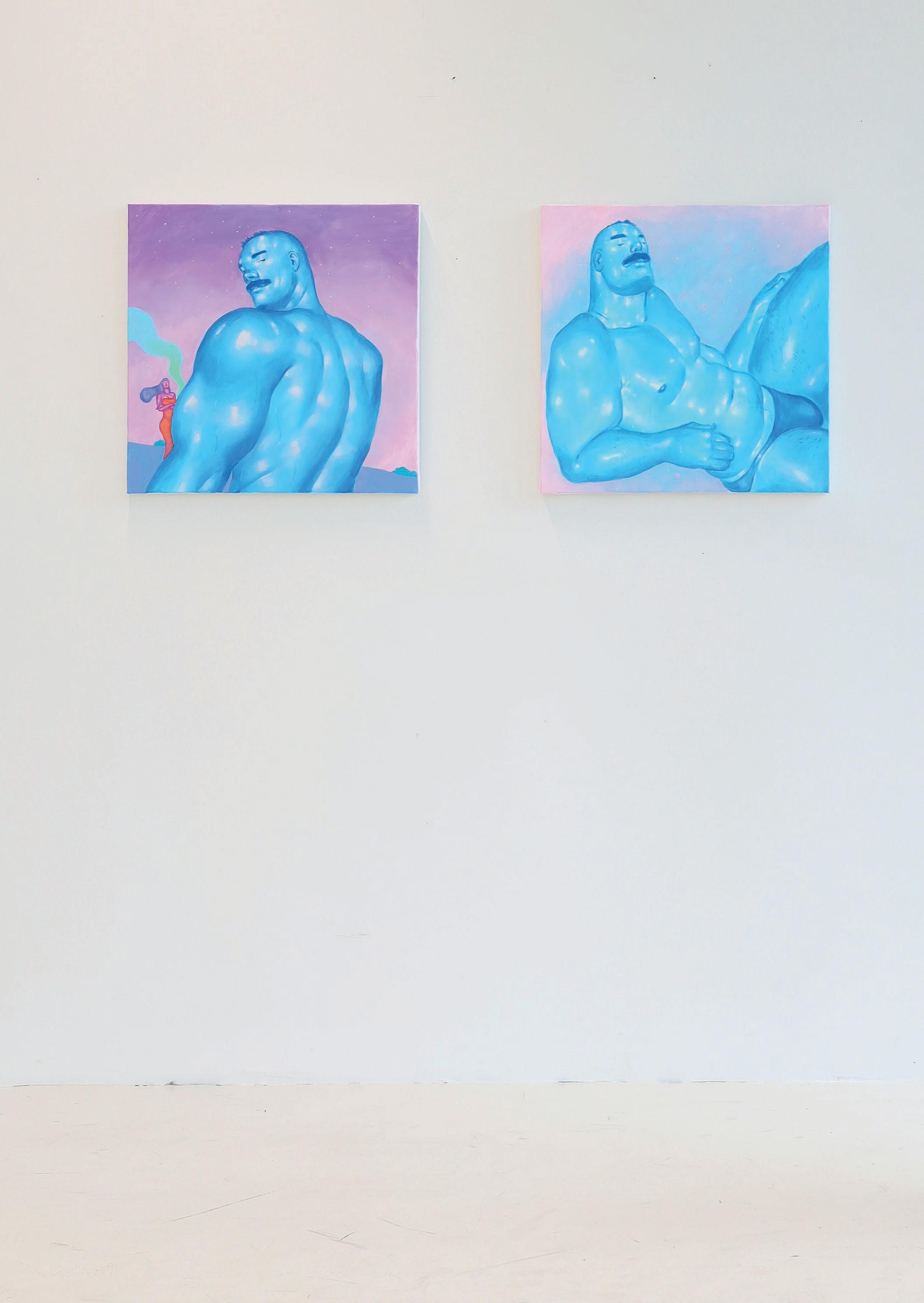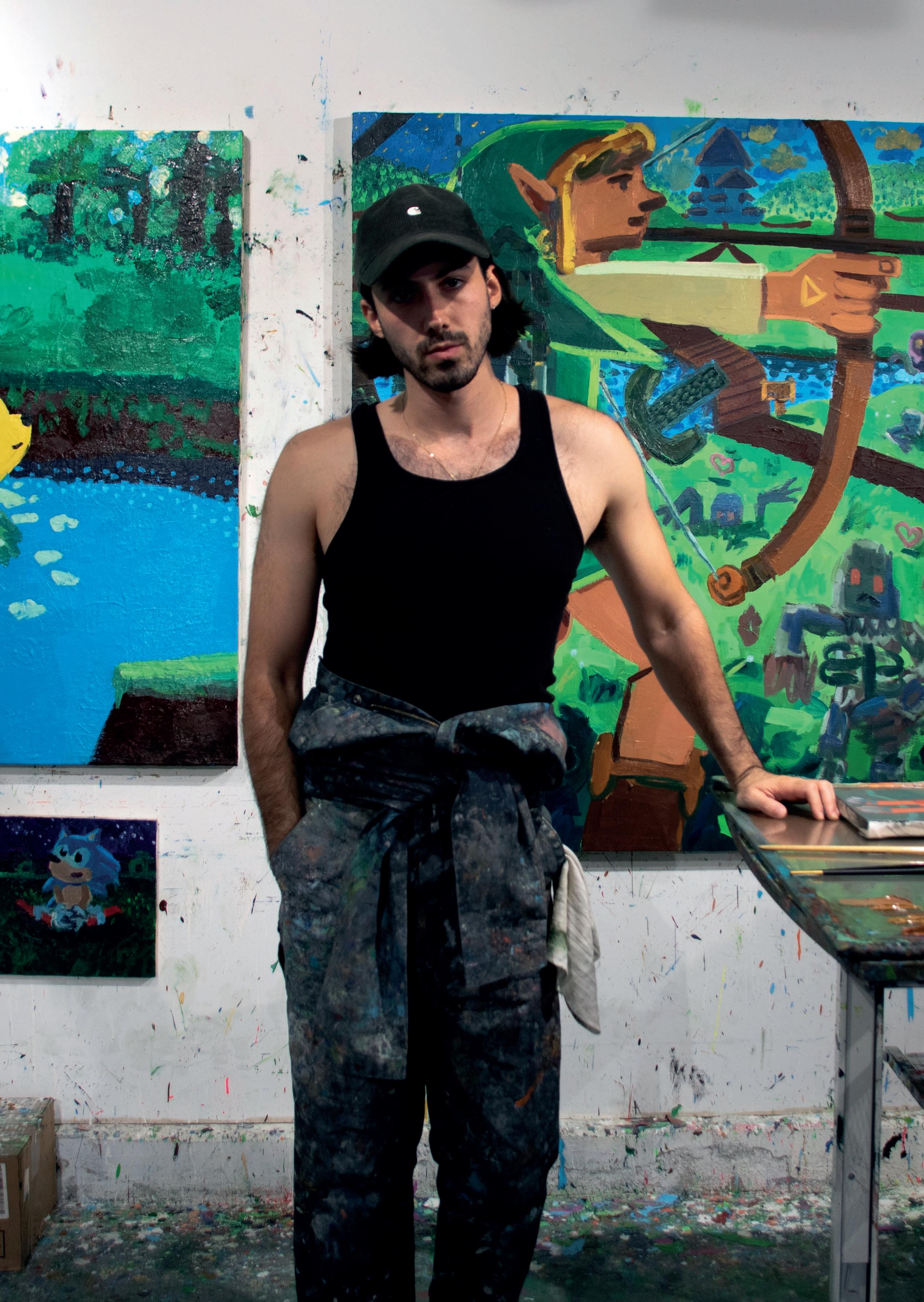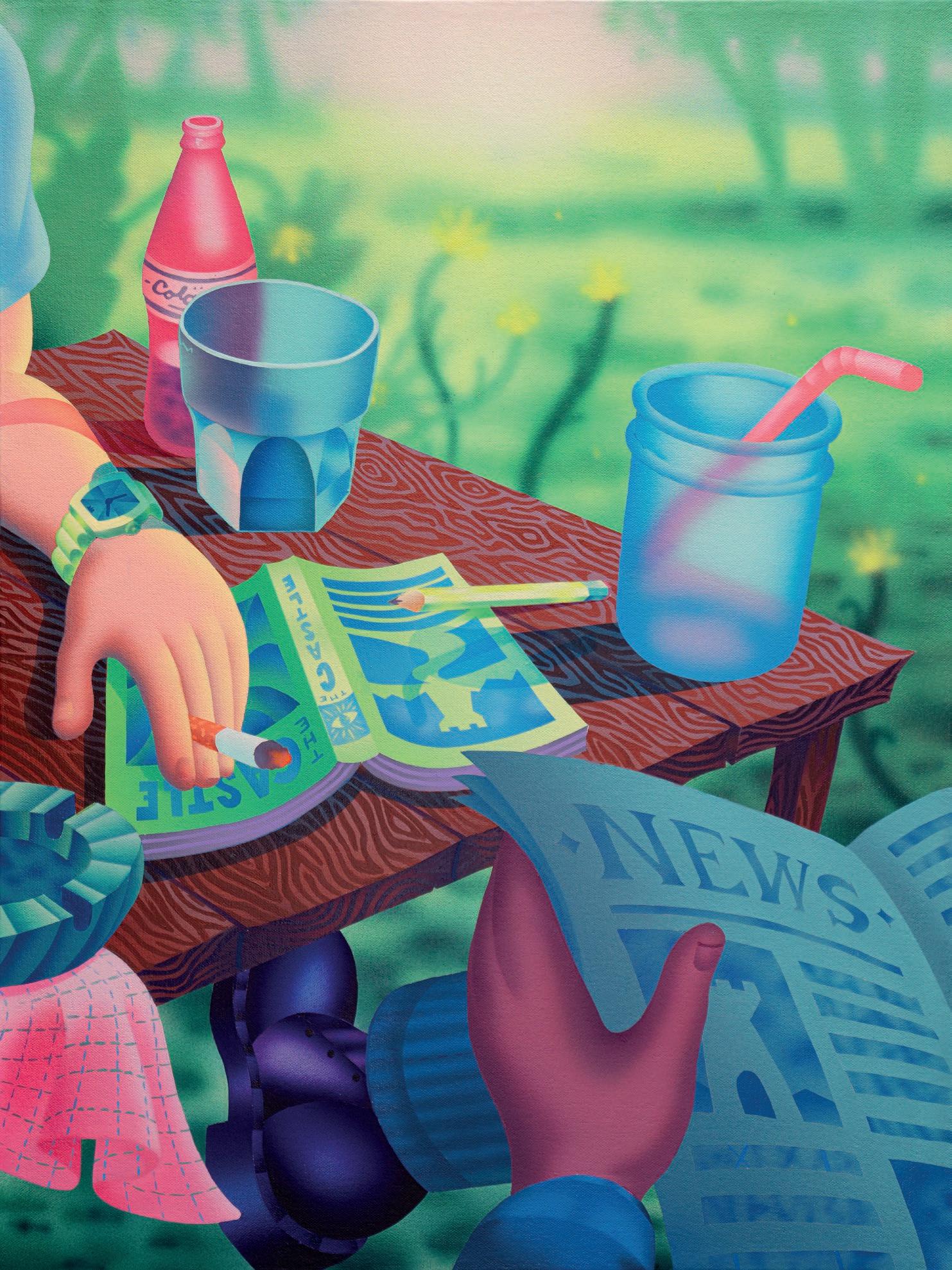 Characters recurrently inhabit a synthetic, dreamy landscape in his paintings, inviting the viewer to partake in an experience that is both universal and personal.