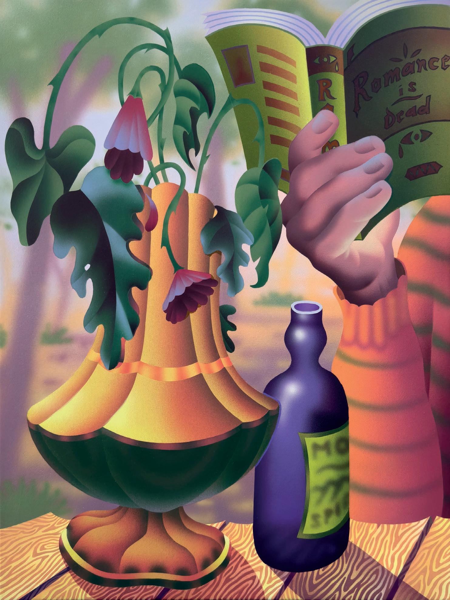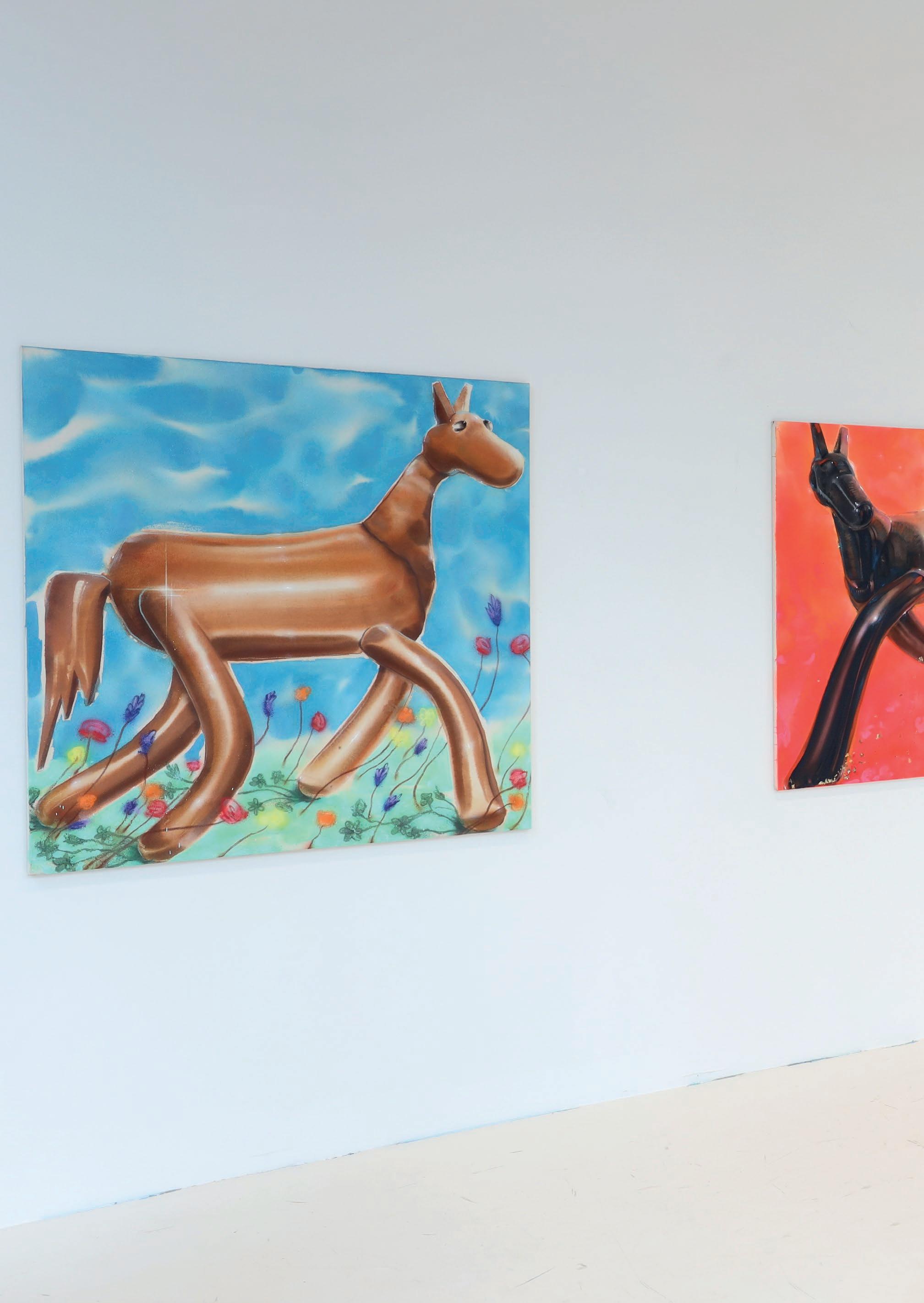 Hyvönen specializes in crafting post-digital paintings that seamlessly blend bright, uplifting visuals with profound themes. Using tragicomic humour, he delves into subjects like ending relationships, loss of a loved one, and environmental crises.