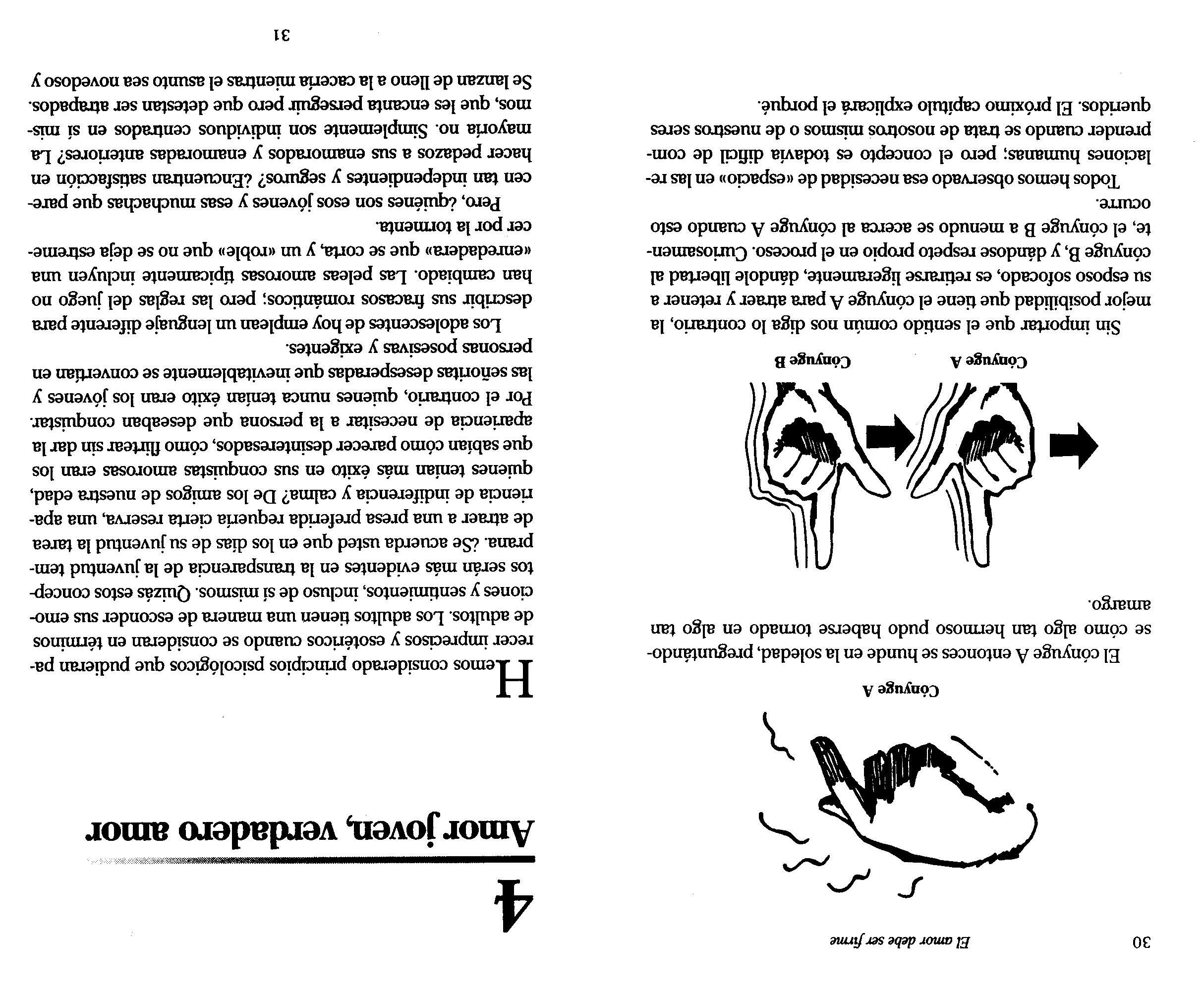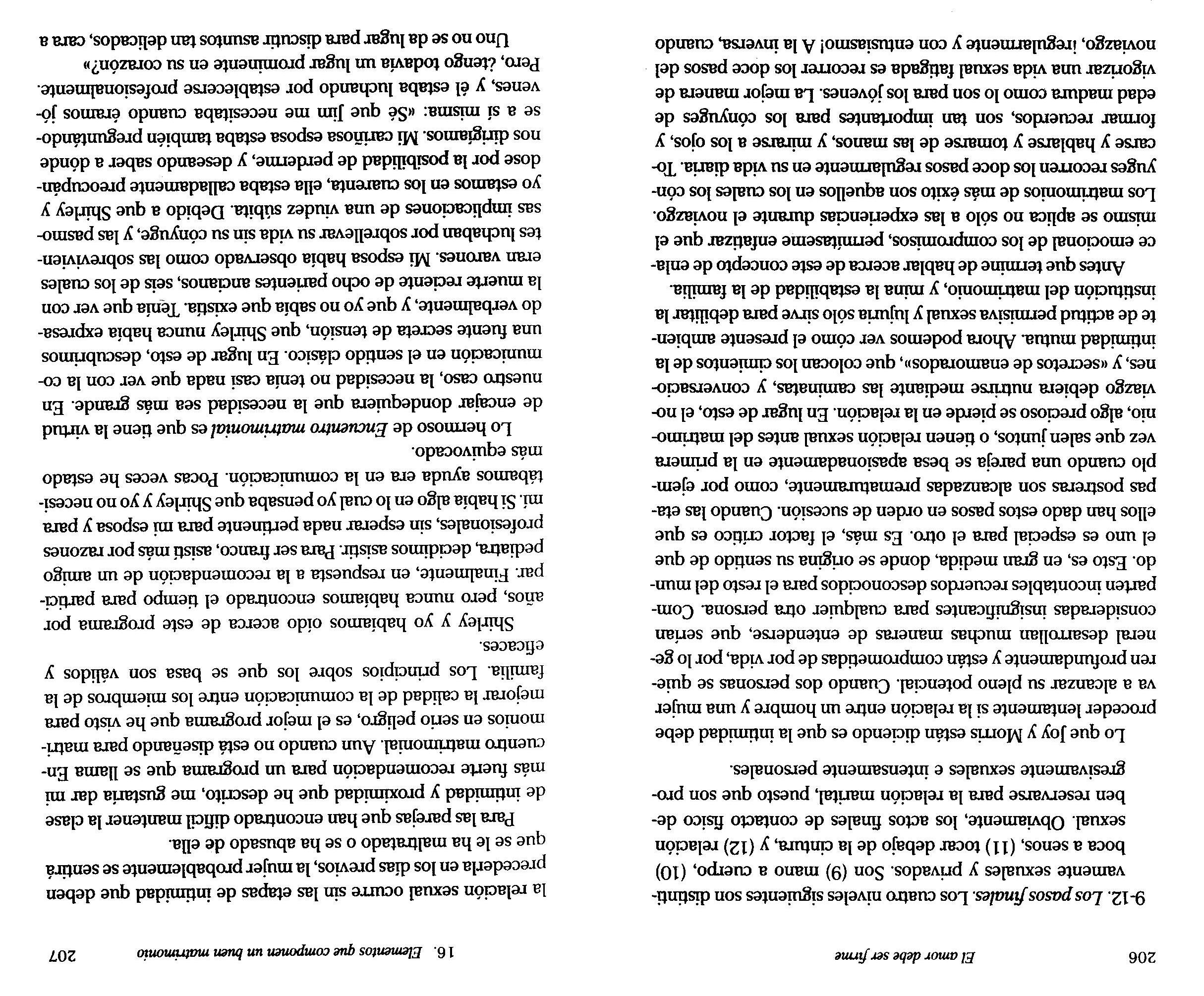 Lo que Joy y Morris están diciendo es que la intimidad debe proceder lentamente si la relación entre un hombre y una mujer va a alcanzar su pleno potencial. Cuando dos personas se quierenprofundamente y están comprometidas de por vida, por lo general desarrollan muchas maneras de entenderse, que serian consideradas insignificantes para cualquier otra persona Comparten incontables recuerdos desconocidos para el resto del mundo. Esto es, en gran medida, donde se origina su sentido de que el uno es especial para el otro. Es más, el factor critico es que ellos han dado estos pasos en orden de sucesión. Cuando las etapas postreras son alcanzadas prematuramente, como por ejemplo cuando una pareja se besa apasionadamente en la primera vez que salen juntos, o tienen relación sexual antes del matrimonio, algo precioso se pierde en la relación. En lugar de esto, el noviazgo debiera nutrirse mediante las caminatas, y conversaciones, y «secretos de enamorados)), que colocan los cimientos de la intimidad mutua Ahora podemos ver cómo el presente ambiente de actitud permisiva sexual y lujuria sólo sirve para debilitar la institución del matrimonio, y mina la estabilidad de la familia. Antes que termine de hablar acerca de este concepto de enlace emocional de los compromisos, permitaseme enfatizar que el mismo se aplica no sólo a las experiencias durante el noviazgo. Los matrimonios de más éxito son aquellos en los cuales los cónyuges recorren los doce pasos regularmente en su vida diaria. Tocarse y hablarse y tomarse de las manos, y mirarse a los ojos, y formar recuerdos, son tan importantes para los cónyuges de edad madura como 10 son para los jóvenes. La mejor manera de vigorizar una vida sexual fatigada es recorrer los doce pasos del noviazgo, ¡regularmente y con entusiasmo! A la inversa, cuando