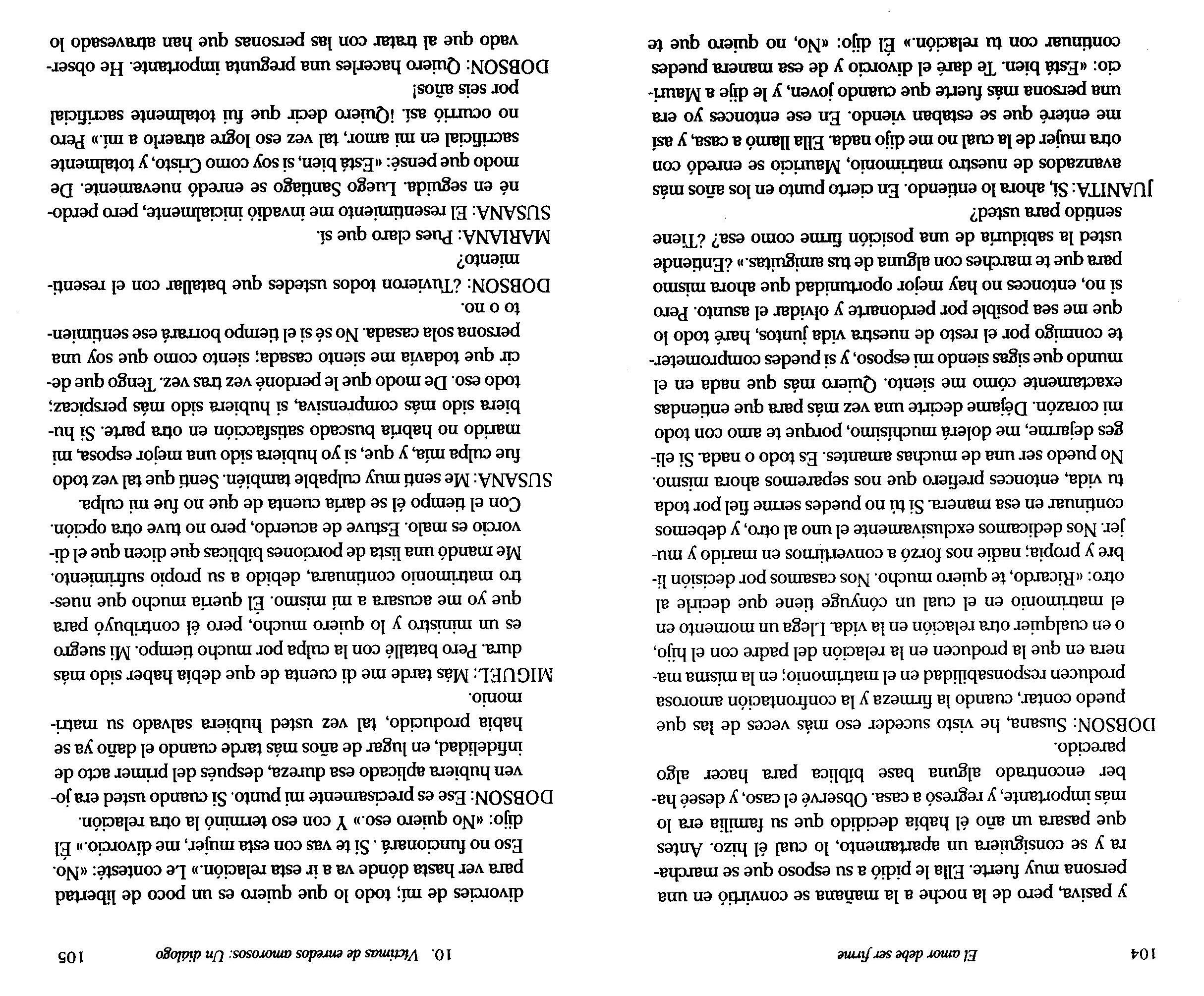 ComenCé este libro con una expresión de amor y simpatía por los hombres y mujeres que han atravesado severas crisis familiares y sufrimiento personal. Me gustaria concluir mi comentario hablando directo a las mismas personas que desesperadamente necesitan el consejo que he ofrecido. Sé que este no ha sido un libro fácil de leer. Francamente, yo mismo lo encontré dificil de escribir. No he tenido ningún placer en describir los sórdidos detalles de la infidelidad, el maltrato de niños o esposas, la homosexualidad, el alcoholismo, el conflicto marital y el divorcio. ¡Pero así es la realidad! La mitad de las parejas de los Estados Unidos, de más de cuarenta años, ha experimentado enredos extramaritales en algún momento, y actualmente más divorcios tienen lugar que matrimonios. Esto se traduce en millones de personas que han atravesado el mismo trauma que usted. y es por eso que escribí este libro. Quería proporcionar algunos recursos y filosofia práctica con los cuales traer a su cónyuge de vuelta al compromiso ya la responsabilidad. iEs mi oración que así ocurra!