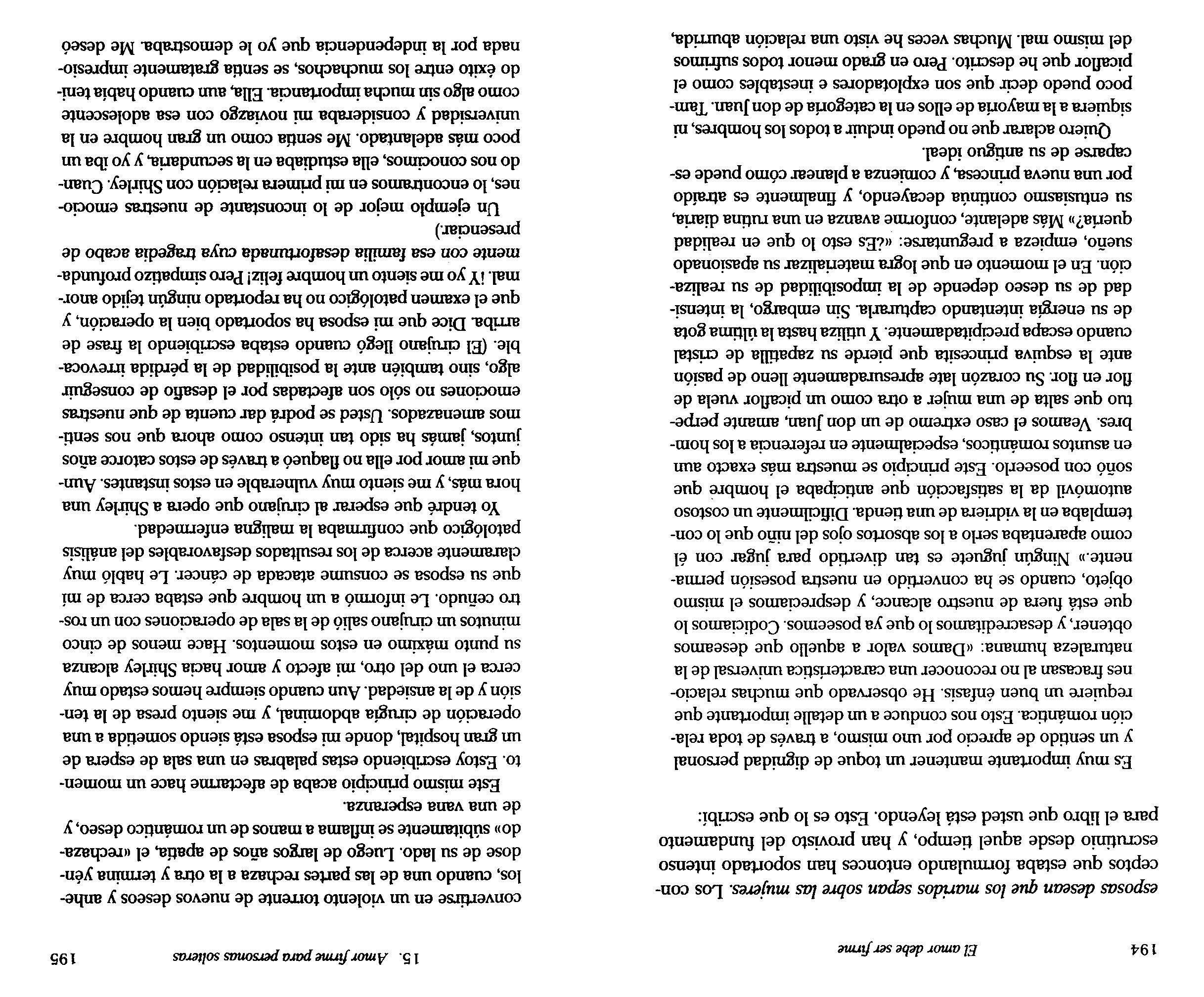 De modo que te pregunto: ¿Quién va a tomar tu lugar en mi vida? Tú te has convertido en mí y yo me he convertido en ti. Somos inseparables. Ya he pasado el cuarenta yseis por ciento de mi vida contigo, y casi ni puedo recordar el primer cincuenta y cuatro por ciento. Ninguna de las experiencias que he anotado pueden ser comprendidas por nadie, excepto por la mujer que las ha vivido junto a mí. Aquellos días ya se han ido, pero su aroma todavía queda en nuestras mentes. Y con cada suceso durante estos veinticuatro años, nuestras vidas se han entrelazado más ymás, fundiéndose con el tiempo en este increíble cariño que siento por ti ahora.