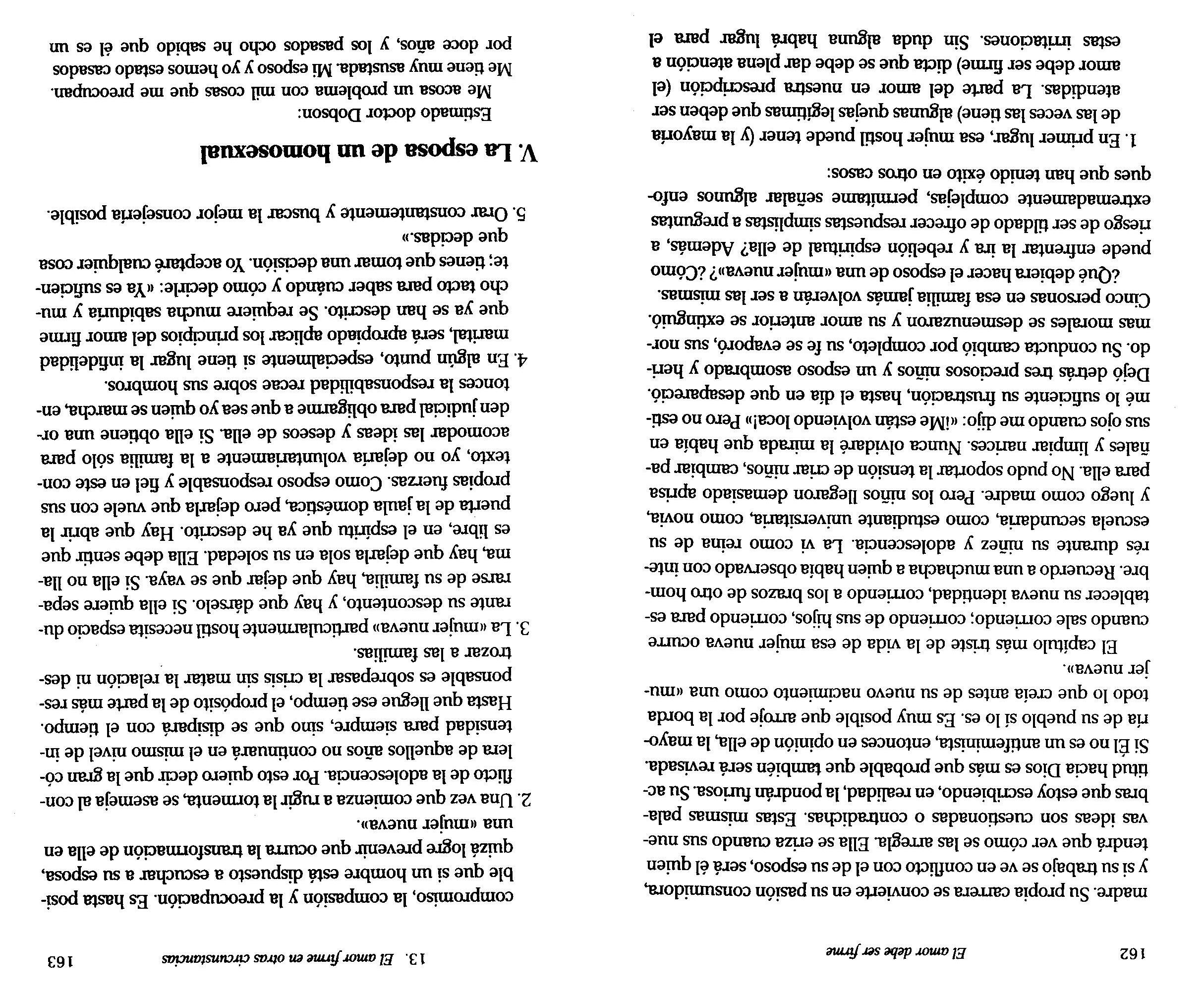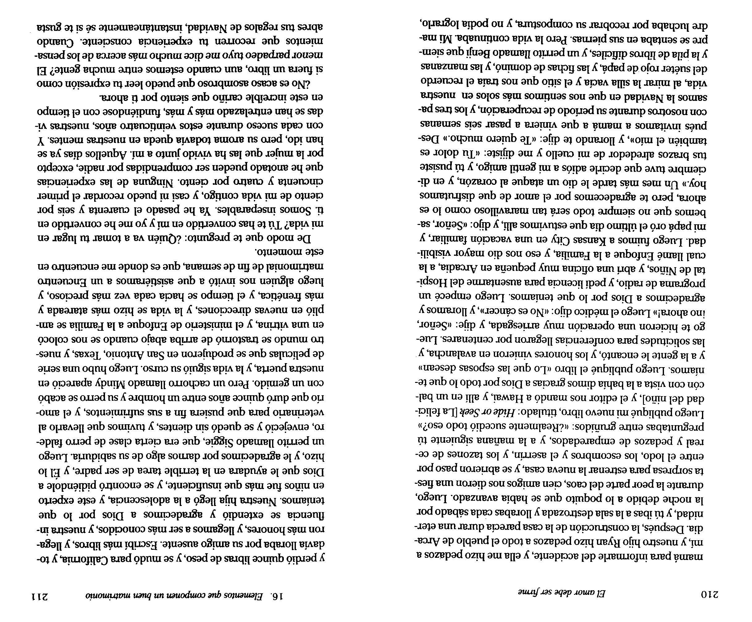 mamá para informarle del accidente, y ella me hizo pedazos a mí, y nuestro hijo Ryan hizo pedazos a todo el pueblo de Arcadia. Después, la construcción de la casa parecia durar una eternidad, y tú ibas a la sala destrozada y llorabas cada sábado por lanoche debido a lo poquito que se habia avanzado. Luego, durante la peor parte del caos, cien amígos nos dieron una fiesta sorpresa para estrenar la nueva casa, y se abrieron paso por entre el lodo, los escombros y el aserrin, y los tazones de cereal y pedazos de emparedados, ya la mañana siguiente tú preguntabas entre gruñidos: ((mealmente sucedió todo eso?» Luego publiqué mi nuevo libro, titulado: Hide or Seek [La felicidad del niño], y el editor nos mandó a Hawai, y alli en un balcóncon vista a la babia dimos gracias a Dios por todo lo que teniamos. Luego publiqué el libro ((Lo que las esposas desean» ya la gente le encantó, y los honores vinieron en avalancha, y las solicitudes para conferencias llegaron por centenares. Luego te hicieron una operación muy arriesgada, y dije: ((Señor, ino ahora!» Luego el médico dijo: ((No es cáncer)), y lloramos y agradecimos a Dios por lo que teniamos. Luego empecé un programa de radio, y pedi licencia para ausentarme del Hospital de Niños, y abri una oficina muy pequeña en Arcadia, a la cual llamé Enfoque a la Familia, yeso nos dio mayor visibilidad. Luego fuimos a Kansas City en una vacación familiar, y mi papá oró el último dia que estuvimos alli, y dijo: ((Señor, sabemos que no siempre todo será tan maravilloso como lo es ahora, pero te agradecemos por el amor de que disfrutamos hoy.)) Un mesmás tarde le dio un ataque al corazón, y en diciembre tuve que decirle adiós a mi gentil amígo, y tú pusiste tus brazos alrededor de mi cuello y me dijiste: ((Tu dolor es también el míOl), Y llorando te dije: ((Te quiero mucho.)) Después invitamos a mamá a que viniera a pasar seis semanas con nosotros durante su periodo de recuperación, y los tres pasamos la Navidad en que nos sentimos más solos en nuestra vida, al mirar la silla vacía y el sitio que nos traía el recuerdo del suéter rojo de papá, y las fichas de dominó, y las manzanas y la pila de libros dificiles, y un perrito llamado Benji que siempre se sentaba en sus piernas. Pero la vida continuaba. Mi madre luchaba por recobrar su compostura, y no podía lograrlo,