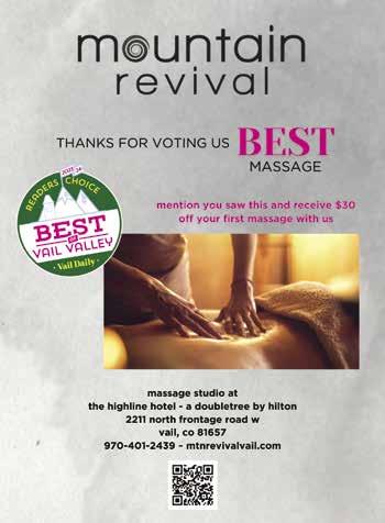 mental health care in our Valley and beyond (page 28). You’ll meet individuals who have charted their own meaningful courses — inspiring and creative entrepreneurs like Nora Fierman (page 30) and Johnny Weddle (page 66), and trailblazers like Micky Poage, Vail Valley’s very own “piano man” (page 58). Learn how Eagle Valley Wildland is leading the charge in wildfire mitigation (page 77), and how some local eateries are walking the uphill trail of sustainable practices with “green gastronomy” (page 84).