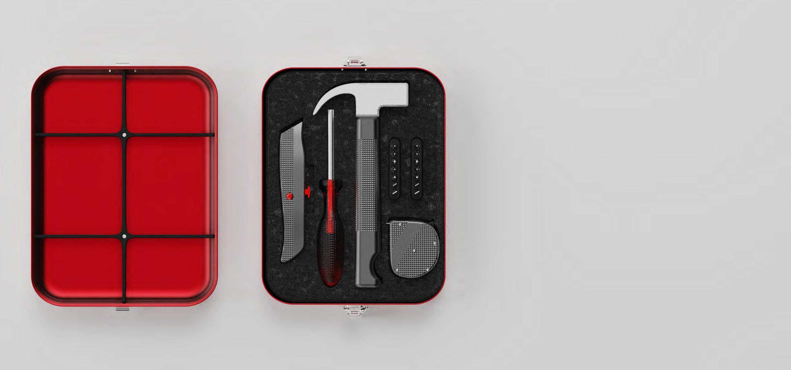 The Phaestus Toolset provides every tool a person may need to get started with using tools, in a form factor that is inviting rather than intimidating. The colours and finishing of the toolbox and the tools allow for the set to fit into any modern home, with matte finishes and a contrasting palette.