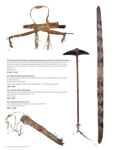374 Northern Plains Beaded and Painted Hide Bowcase and Quiver with Bow and Arrows sinew-sewn hide with lanes of white and dark blue beadwork; strap and bowcase further embellished with red and yellow painted designs, length of bowcase 38 in.; PLUS a sinewbacked recurve bow, length 41 in.; AND 11 arrows, five of which have metal tips, average length 27 in. 19th century $1,000 - $1,500 375 Mohave Polychrome Recurve Bow bow painted on both sides in red and blue diamond and hourglass pattern; notched tips, overall length 36 in. fourth quarter 19th century Collected by Thaddeus Stanton (1835-1900), known as “The Fighting Paymaster” $400 - $600 376 Southern Plains Hide Quiver utilitarian quiver composed of softly tanned hide and embellished with hide fringe along edge seam and opening, length 21.5 in. 19th century $500 - $700 377 Northern Plains Horn Club hide embellished with red pigment, overall length 28.5 in. fourth quarter 19th century $800 - $1,000