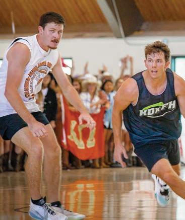Left: Alpha Gamma Rho member Gage Milner (left) and FarmHouse member Jack Smithton in the Basketball Bonanza tournament.