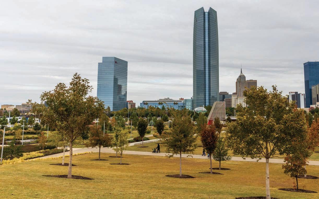 Opened in 2019, Scissortail Park offers a unique view of the downtown Oklahoma City skyline. Photo by Alyssa Hardaway.