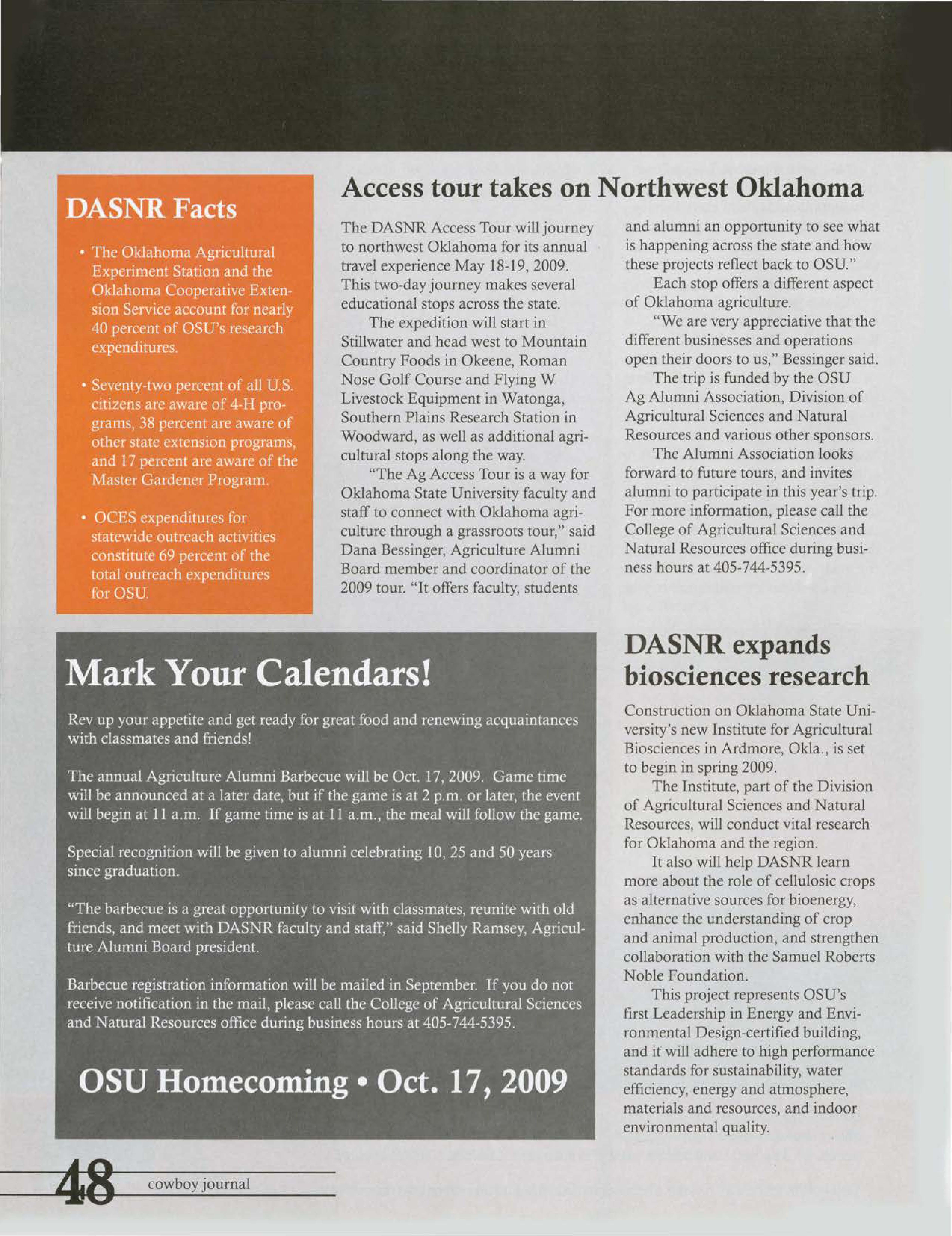 "The Ag Access Tour is a way for Oklahoma State University faculty and staff to connect with Oklahoma agriculture through a grassroots tour," said Dana Bessinger, Agriculture Alumni Board member and coordinator of the 2009 tour. "It offers faculty, students