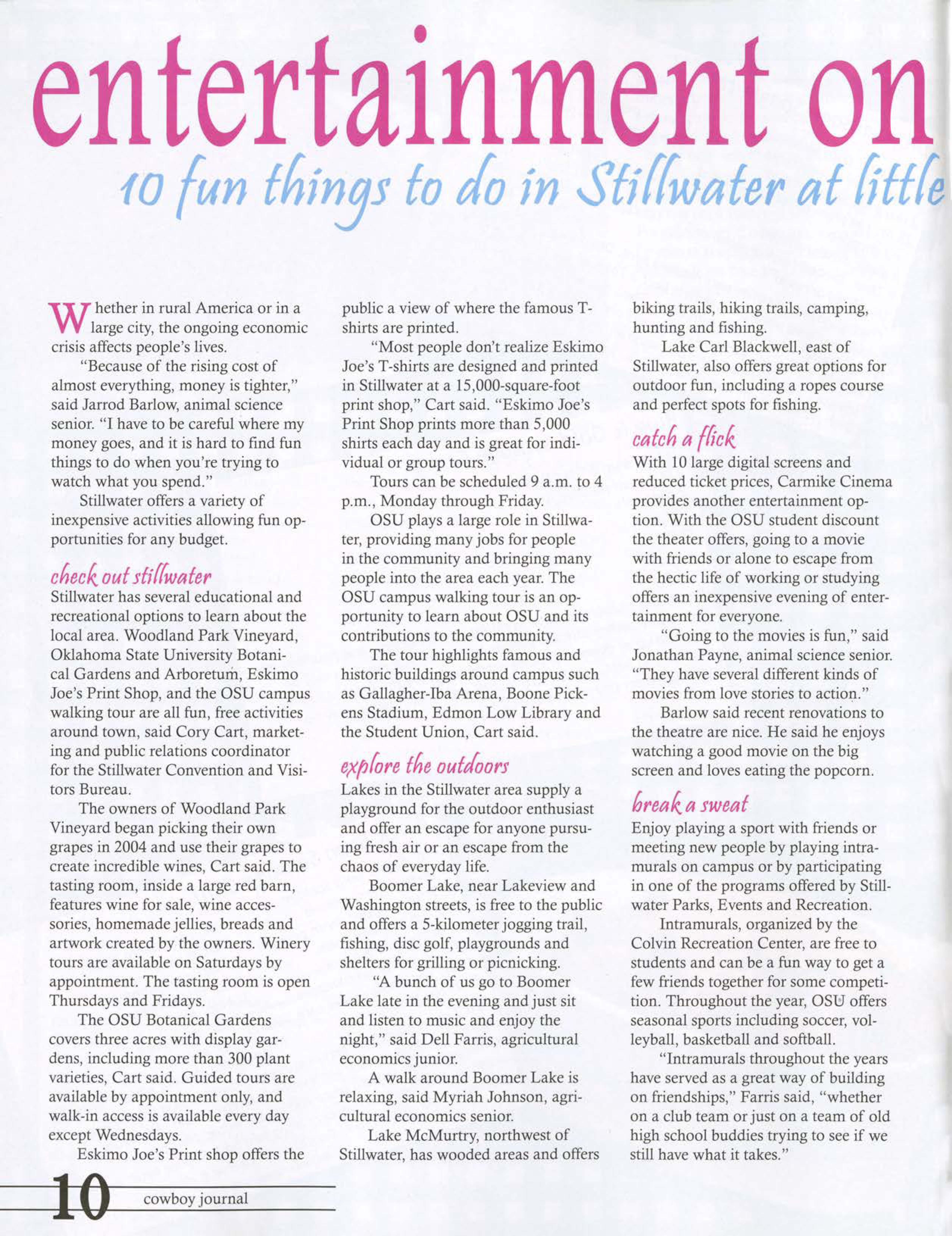 Stillwater has several educational and recreational options to learn about the local area. Woodland Park Vineyard, Oklahoma State University Botanical Gardens and Arboretum, Eskimo Joe's Print Shop, and the OSU campus walking tour are all fun, free activities around town, said Cory Cart, marketing and public relations coordinator for the Stillwater Convention and Visitors Bureau.
