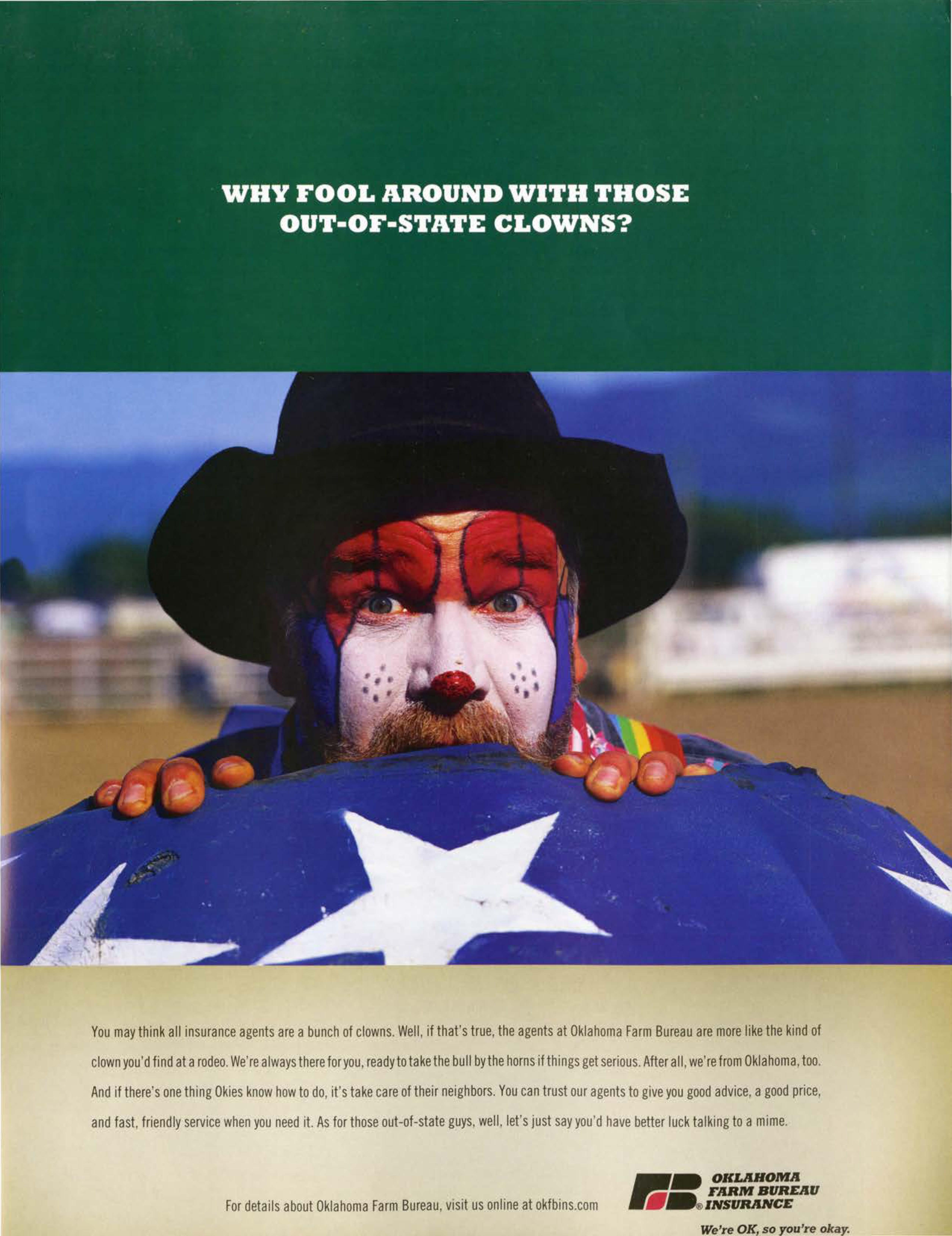 Youmaythinkall insuranceagentsarea bunchof clowns.Well,if that'strue,theagentsat OklahomaFarmBureauaremorelikethekindof clownyou'dfindata rodeo.We'realwaysthereforyou,readytotakethebullbythehorns if thingsgetserious.Afterall,we'refromOklahoma,too.