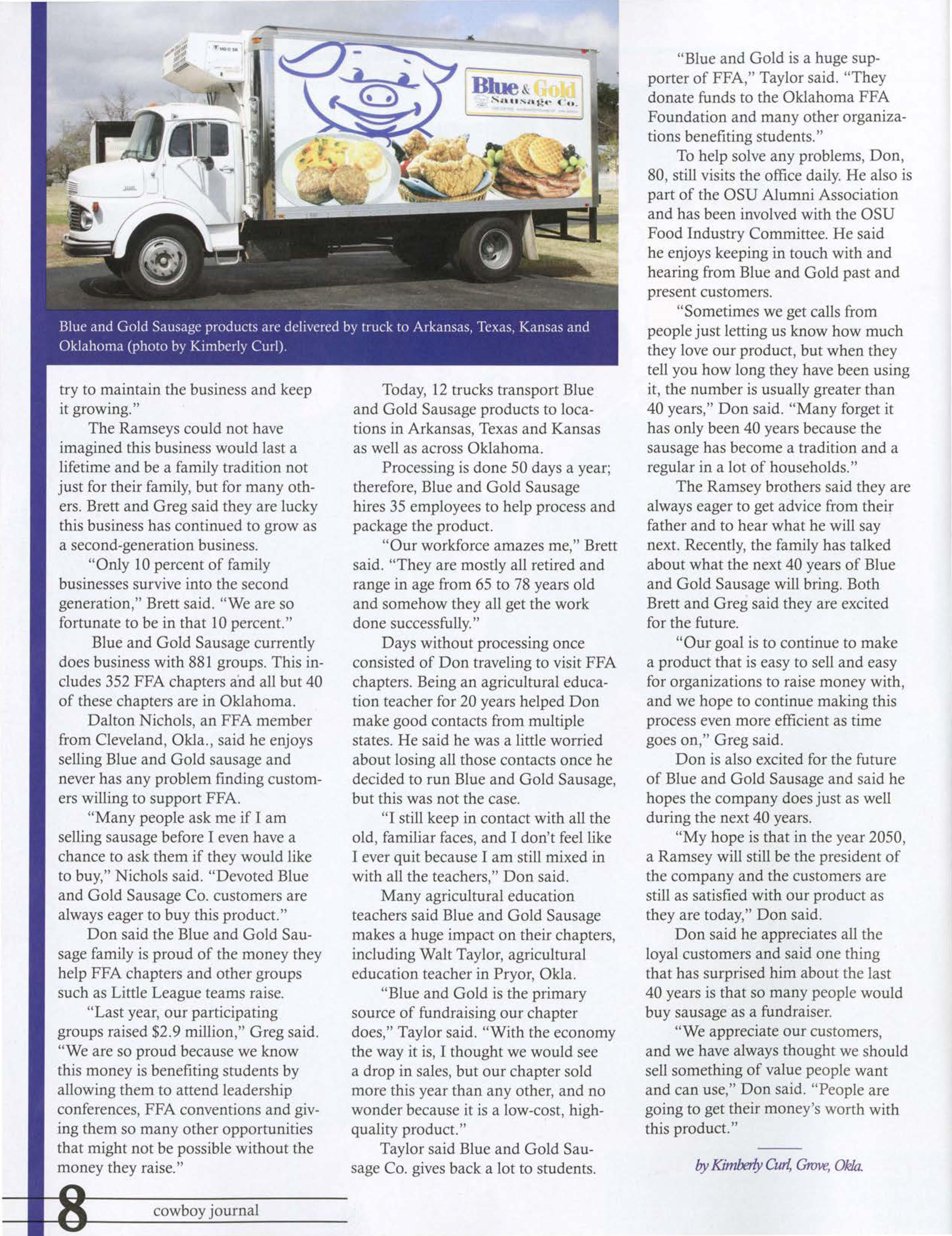 Blue and Gold Sausage began to spread to FFA chapters across Oklahoma. Today, the product is sold exclusively through school groups and other organizations.