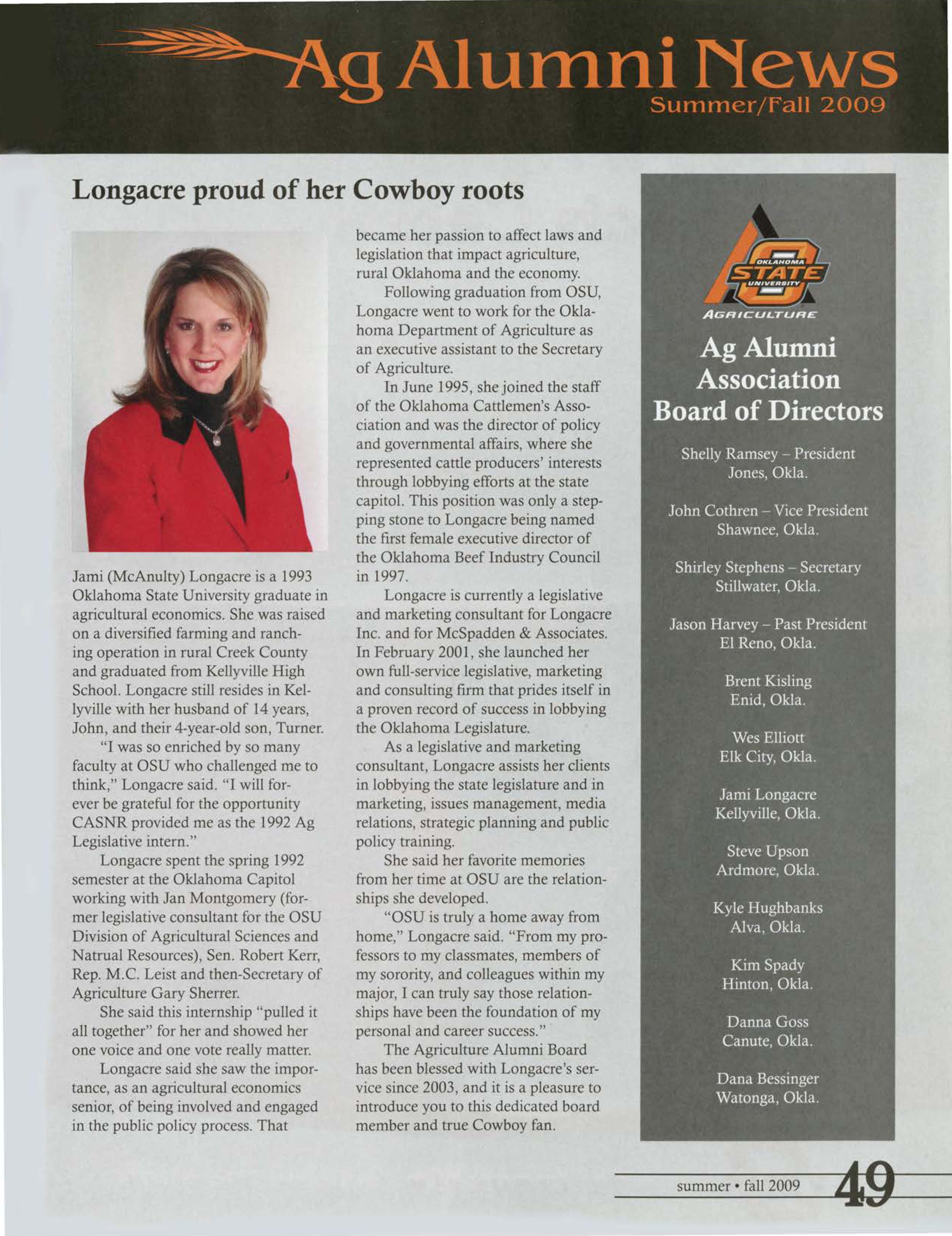 Jami (McAnulty) Longacre is a 1993 Oklahoma State University graduate in agricultural economics. She was raised on a diversified farming and ranching operation in rural Creek County and graduated from Kellyville High School. Longacre still resides in Kellyville with her hu band of 14 years, John, and their 4-year-old son, Turner.