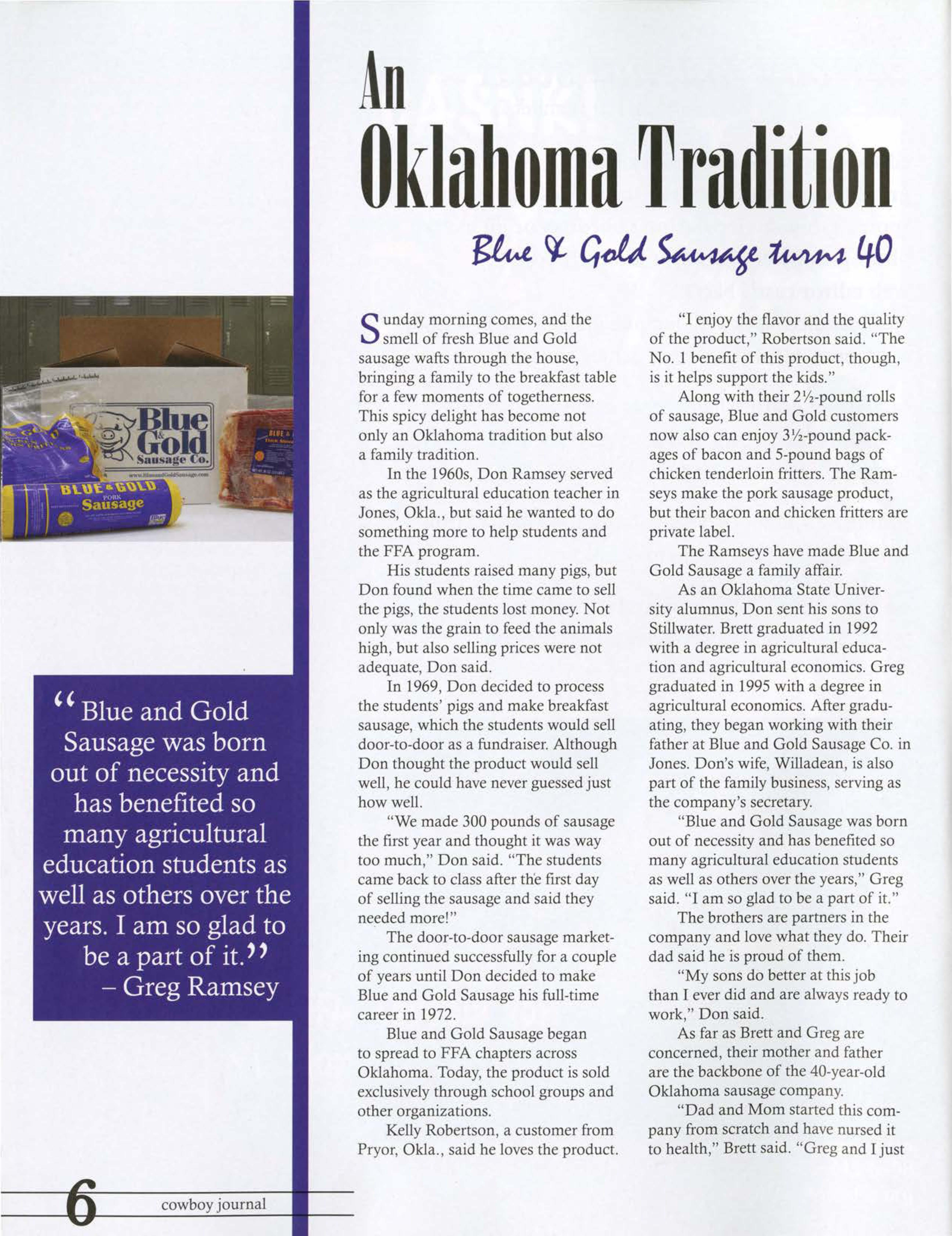 Sunday morning comes, and the smell of fresh Blue and Gold sausage wafts through the house, bringing a family to the breakfast table for a few moments of togetherness. This spicy delight bas become not only an Oklahoma tradition but also a family tradition.