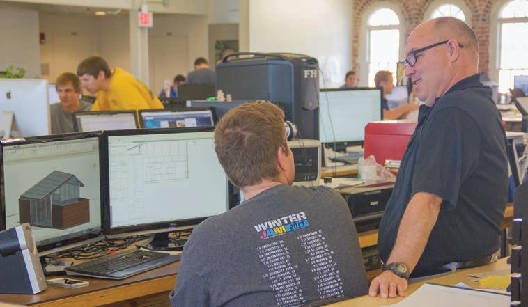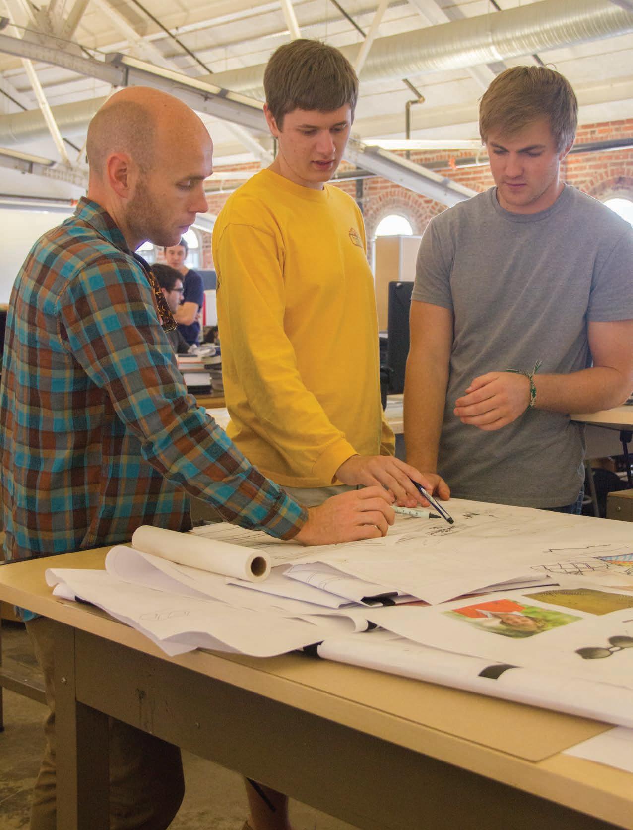 Above: Randy Seitsinger (right) critiques the on-screen design of Curtis Freeman, architecture student. The studio is located on the third floor of the School of Architecture building. Left: Chris Haverkamp (center), architecture student, and Jay Williams (right), landscape architecture student, receive advice from Nick Nelson. Photos by Tyler Price.