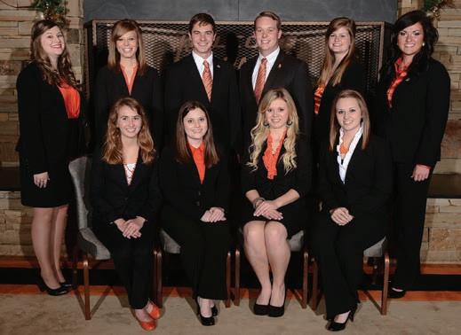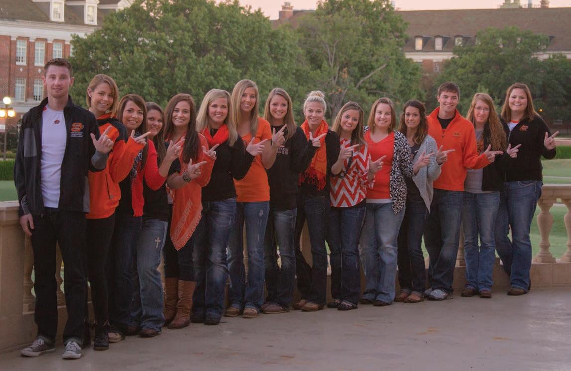 The Fall 2013 Cowboy Journal staff bleeds orange: Dakota Chambers (left), Danielle Robinson, Jamie Baumgardner, Kailey Sullins, Jordan Cash, Blaire Boyer, Rhonda Roberts, Carrie Horsley, Ivy Hill, Morgan Neilson, Alannah Castro, Kendsy Vincent, Tyler Price, Samantha Stanbery and Mindy Andres. Photo by Jake Gankofskie.
