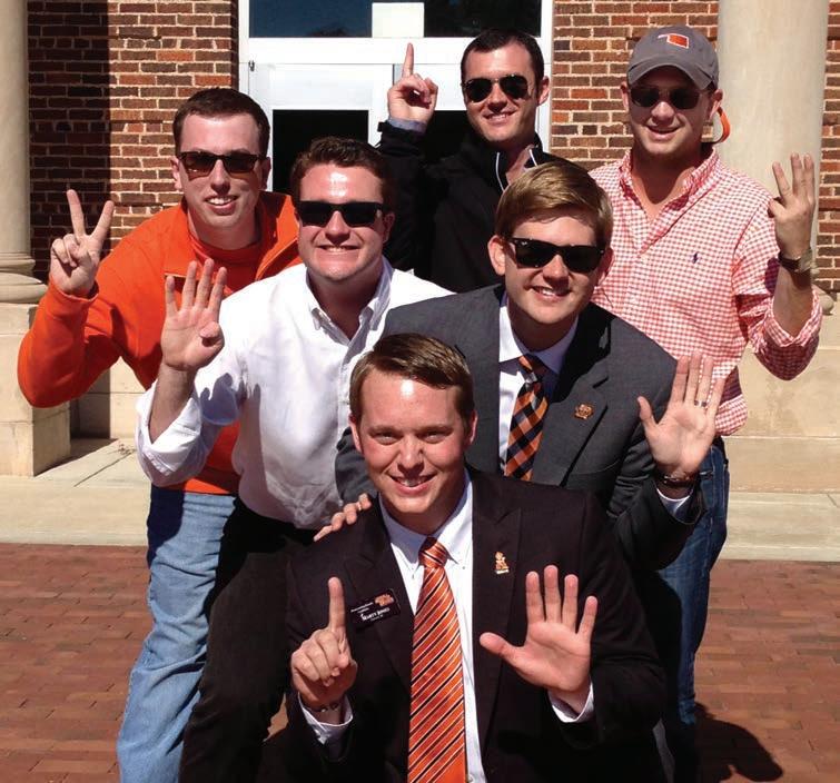 Marty Jones (front), agricultural education senior, became the sixth College of Agricultural Sciences and Natural Resources student and Alpha Gamma Rho member be to named OSU Homecoming King. Jones is joined by former kings (clockwise from back left): Tyler Powell (2009), Austin Horn (2008), Wyatt Swinford (2010), Riley Pagett (2012) and Randy Gordon (2011). Photo by Lauren Pagett.