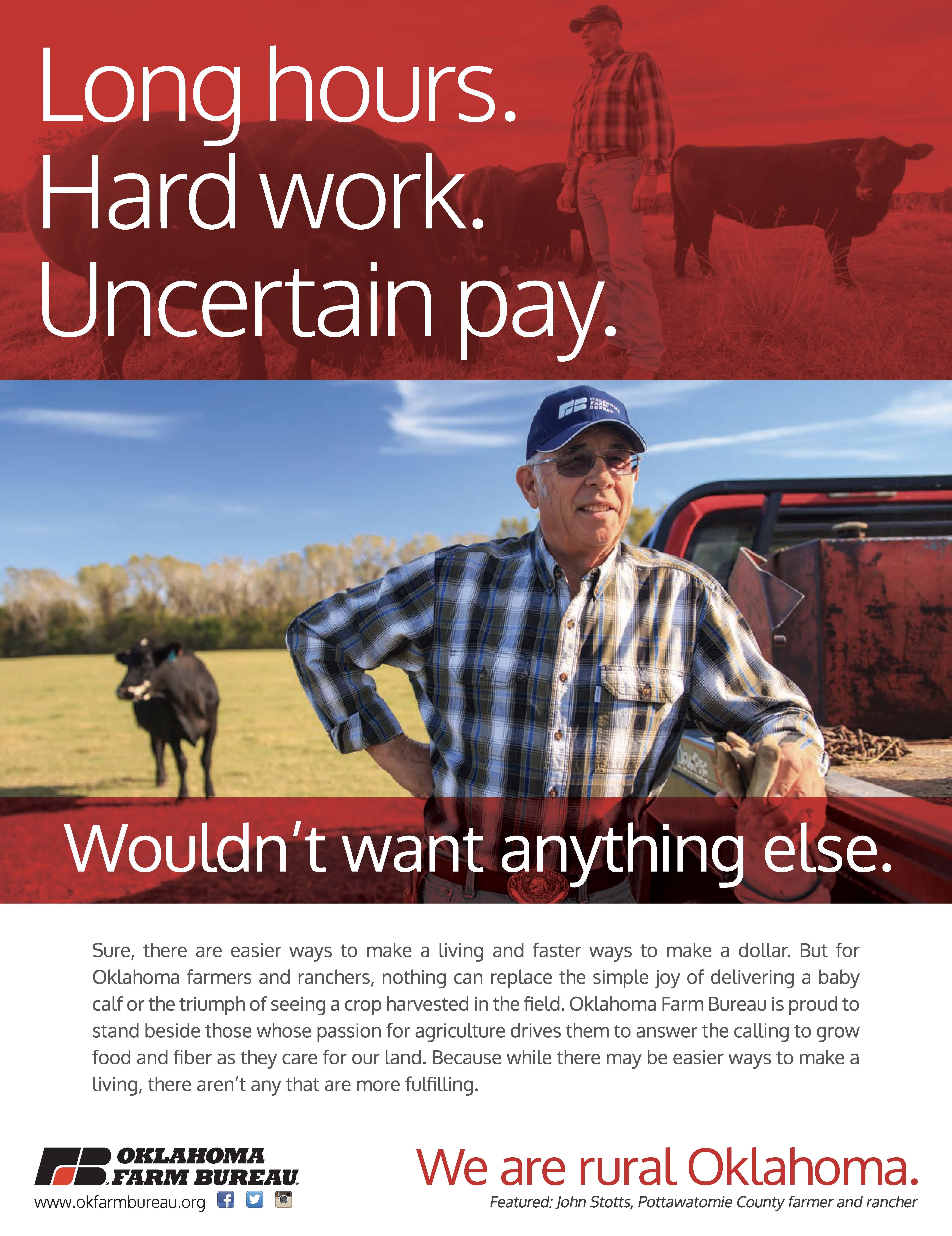 Sure, there are easier ways to make a living and faster ways to make a dollar. But for Oklahoma farmers and ranchers, nothing can replace the simple joy of delivering a baby calf or the triumph of seeing a crop harvested in the field. Oklahoma Farm Bureau is proud to stand beside those whose passion for agriculture drives them to answer the calling to grow food and fiber as they care for our Land.Becausewhile there may be easier ways to make a living, there aren't any that are more fulfilling.
