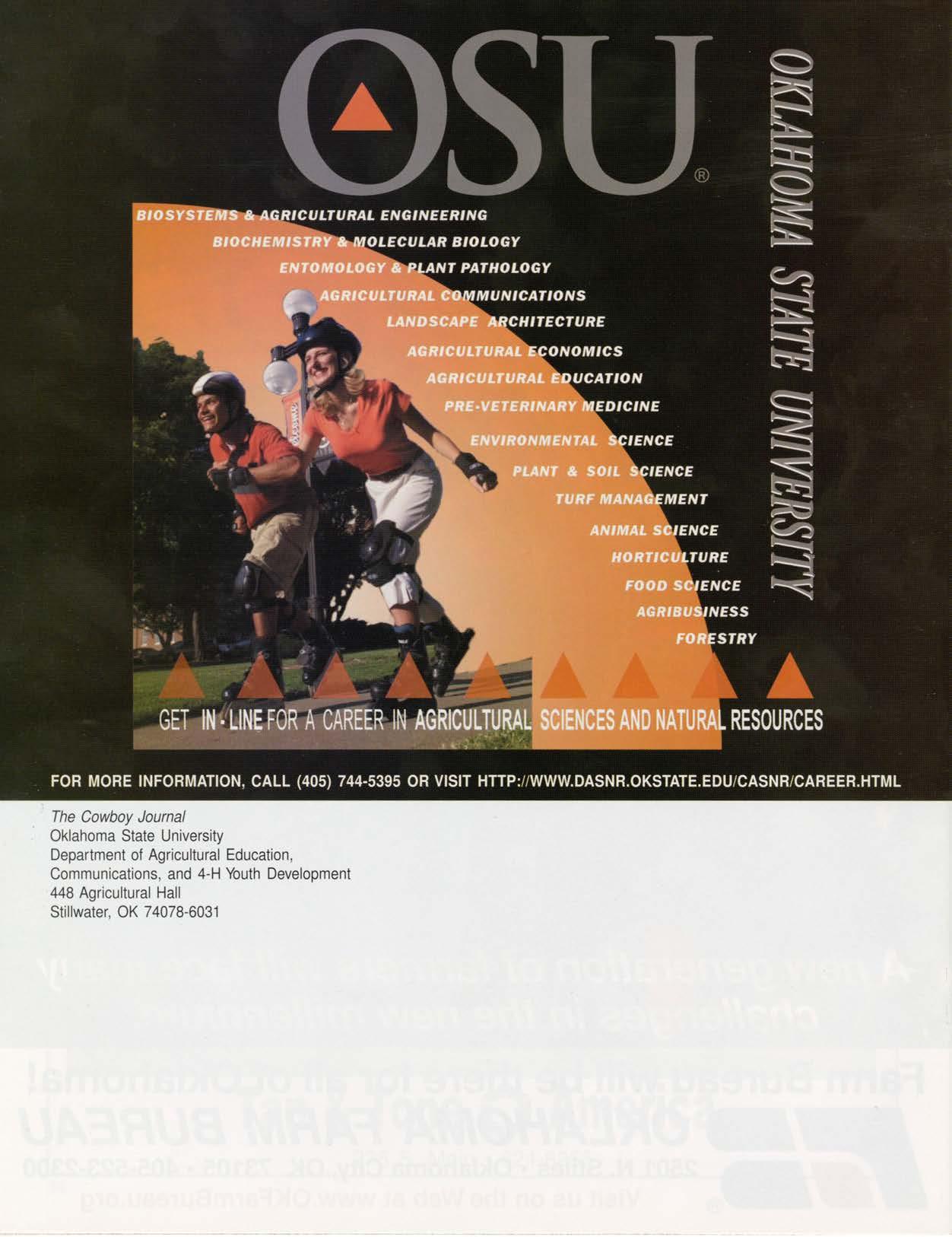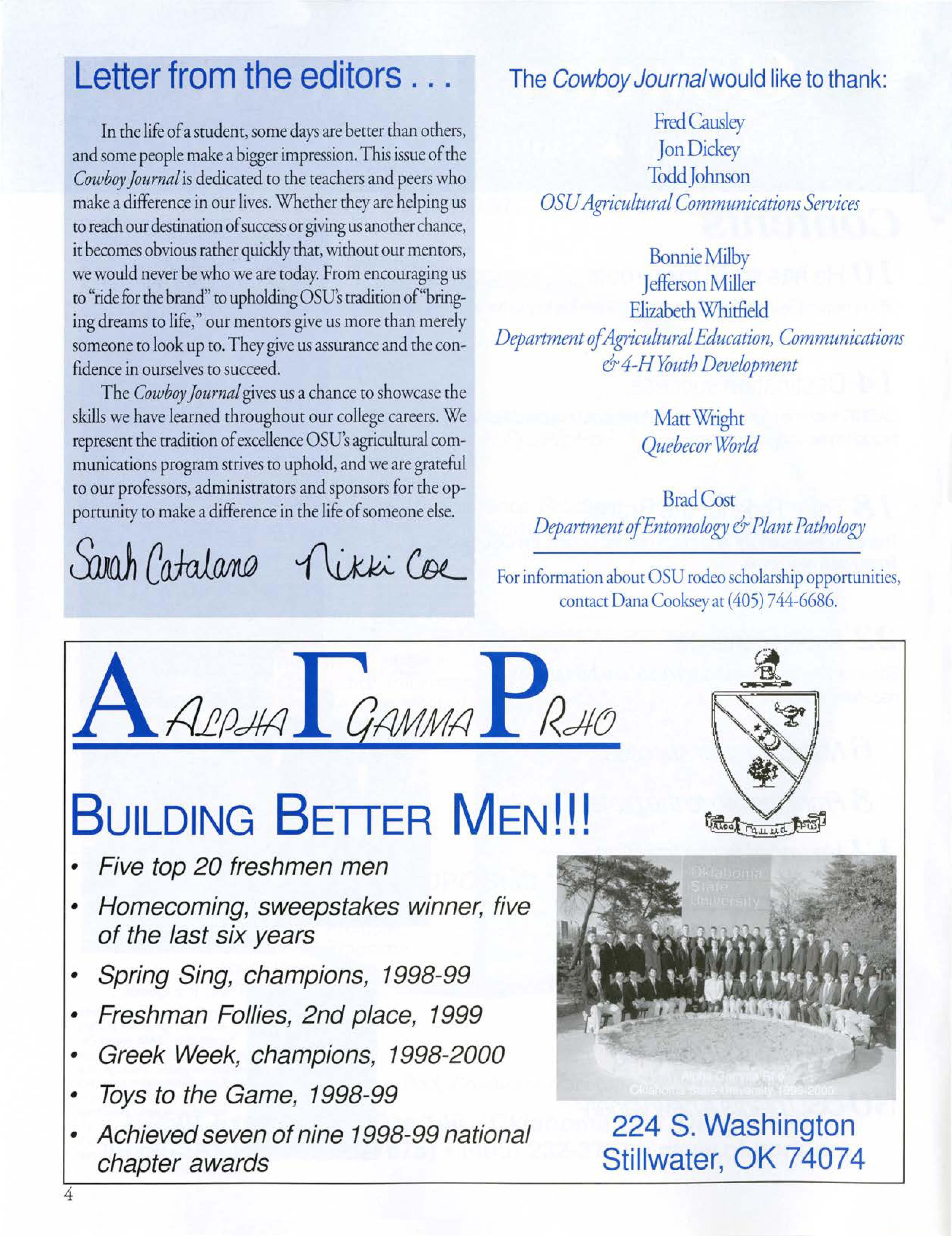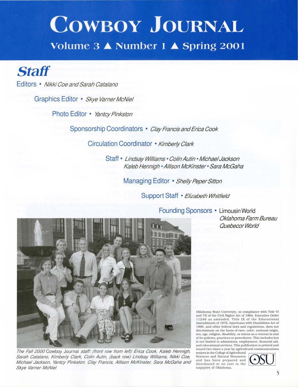The Cowboyjournalgivesus a chanceto showcaseche skillswe havelearnedthroughout our collegecareers.We representthe traditionof excellenceOSU'sagriculcuralcommunicationsprogramstrive to uphold,and wearegrateful to our professors,administratorsand spon ors for the opportunityro makea differencein the lifeof someoneelse.