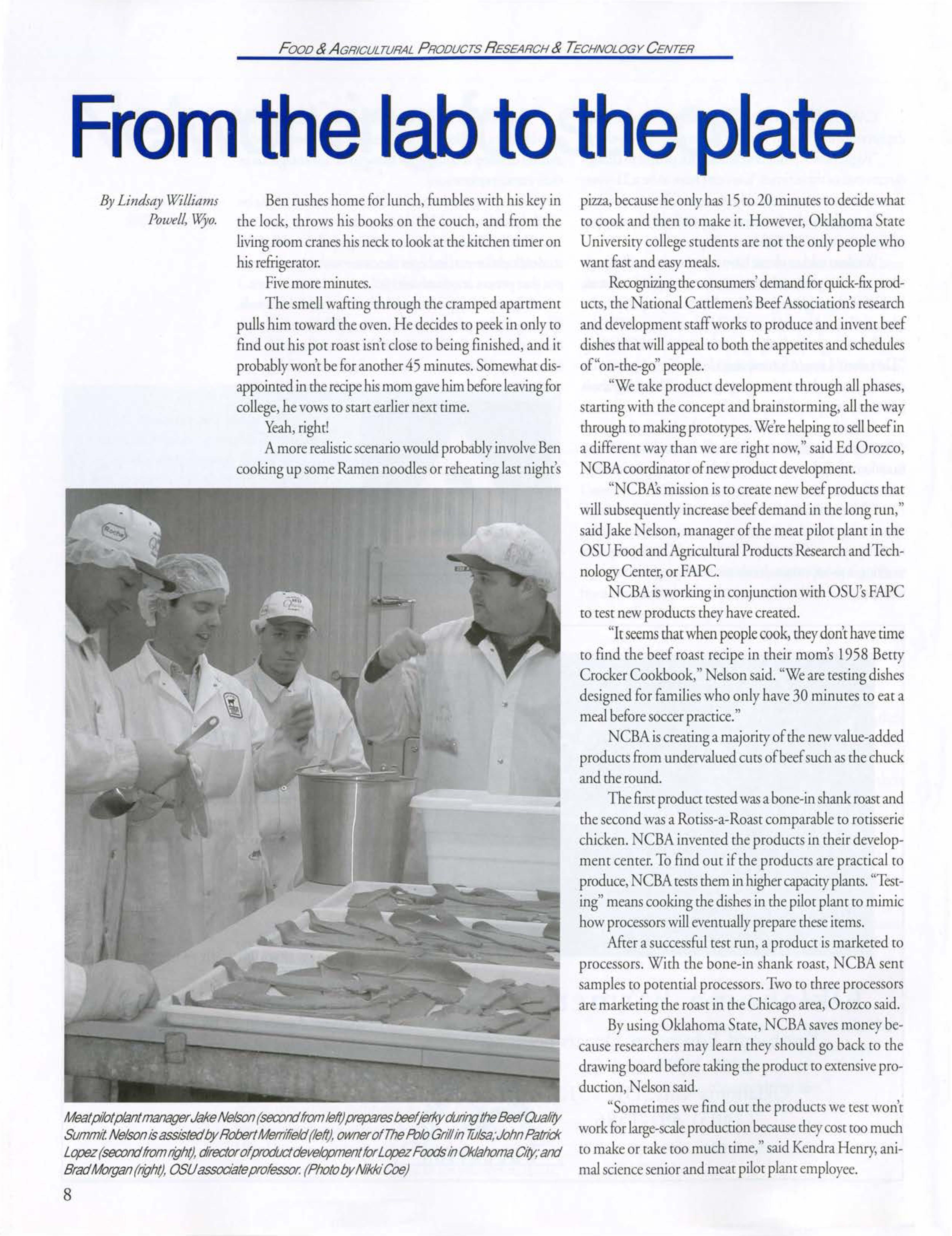" CBA'smissionis to createnewbeefproduct char willsubsequentlyincreasebeefdemandin the longrun," aidJake el on, managerof the meatpilotplant in the 0 U FoodandAgriculturalProductsResearchandTechnologyCencer,or FAPC.