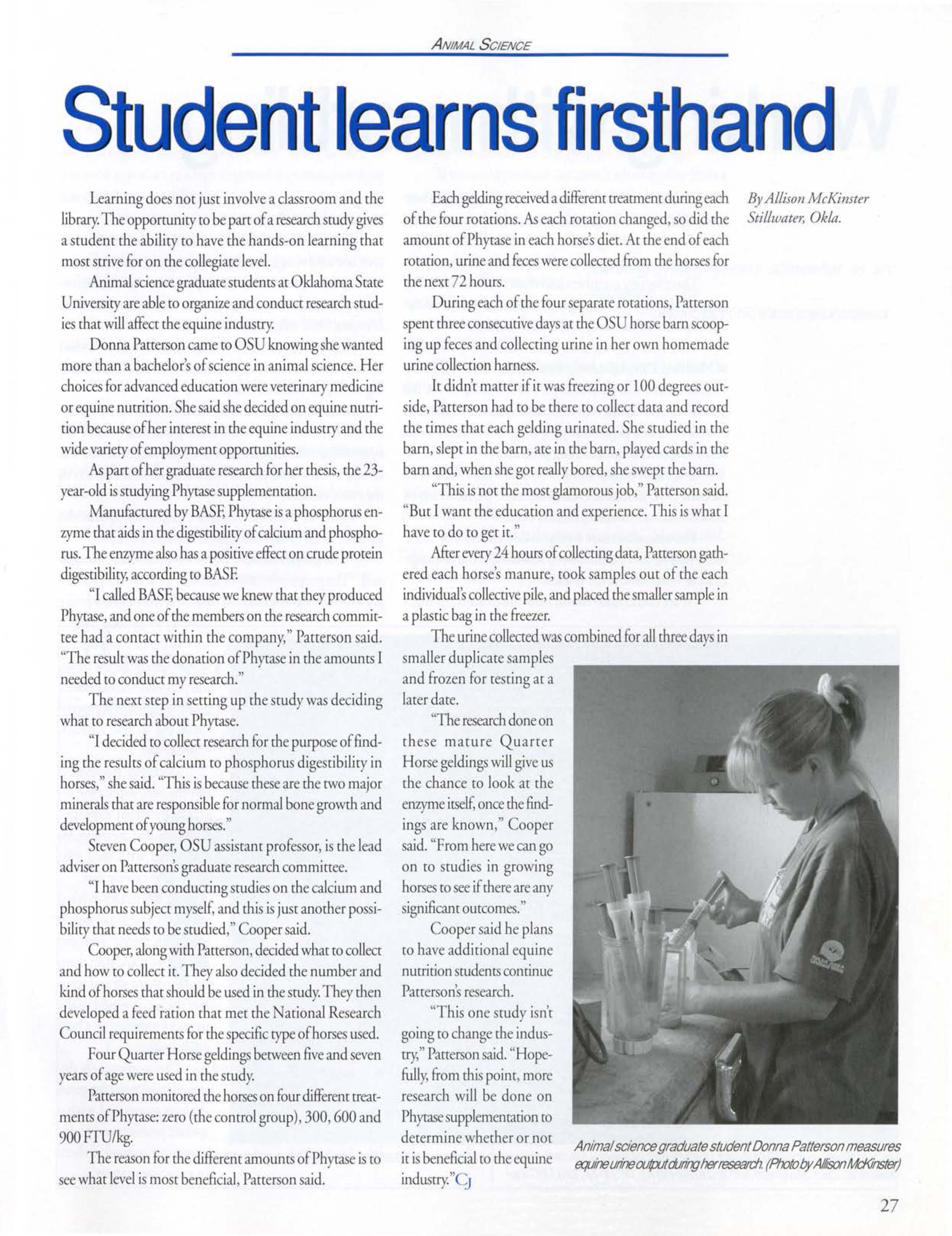 AnimalsciencegraduatestudentDonnaPa/tersonmeasures equineudneCK.JlpJ/duniyherresea!U7.(PhotobyAl!iscnMcKinster)