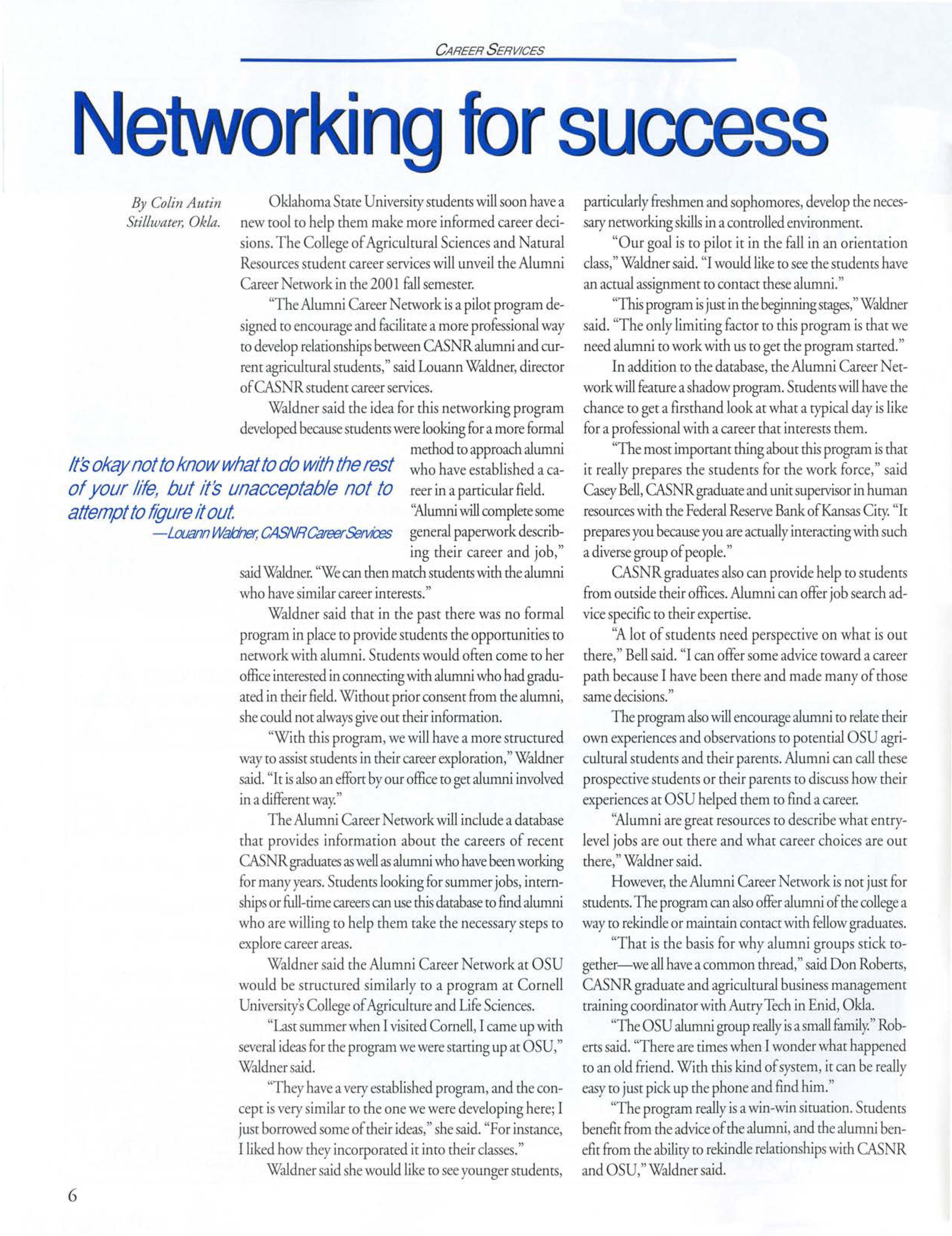 "TheAlumniCareerNerworkisa pilotprogramdesignedcoencourageand facilitatea moreprofessionalway to developrelationshipbetweenCASNRalumniandcurrenragriculruralstudents," aid LouannWaldner,director ofCA NRsrudenrcareerservices.