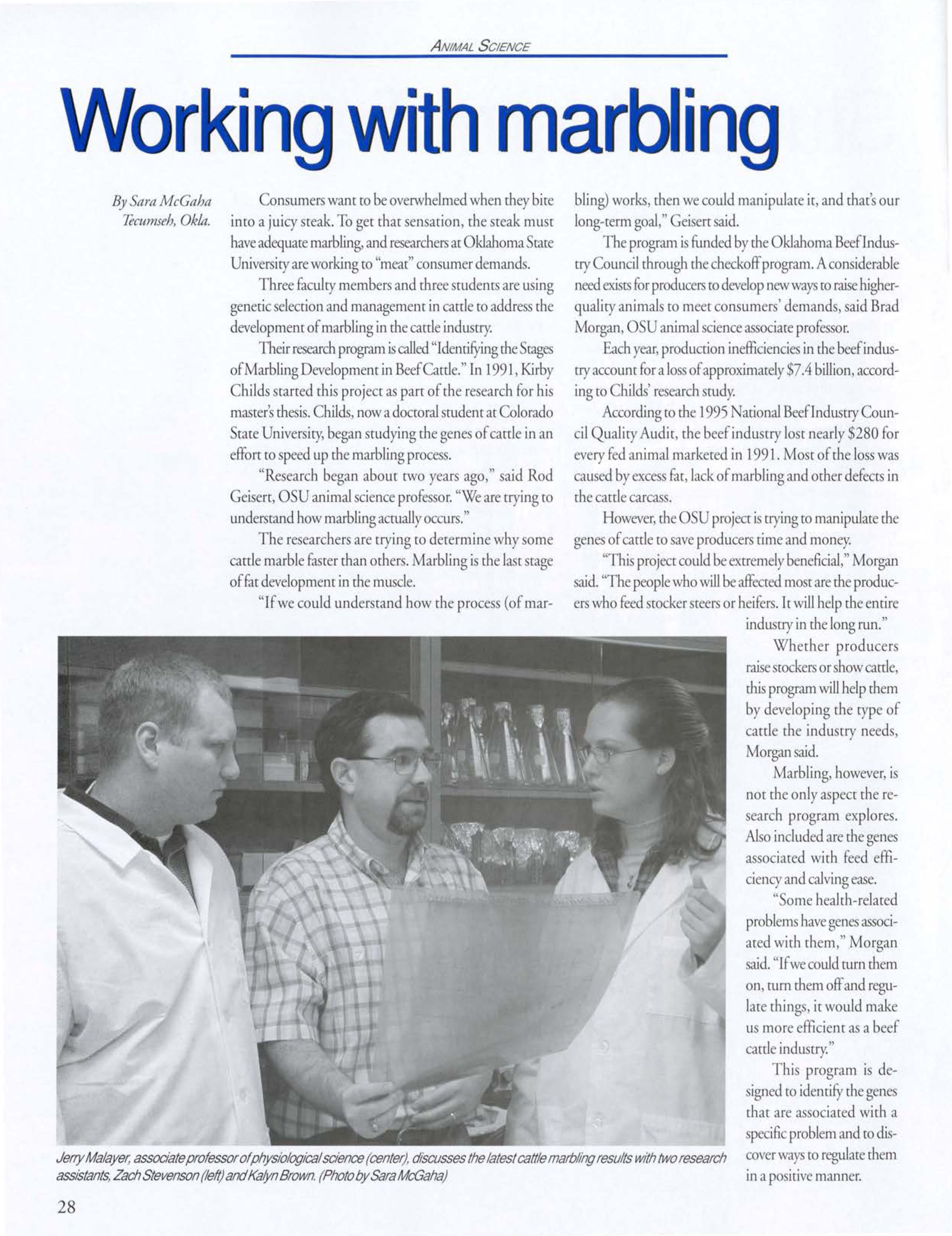 Theirr~ h programiscalled"Identifyingthe ~oes of MarblingDevelopmentin BeefCaccle."1n1991,Kirby hild tarredchi projecta pareof the re earchfor hi mascer'rhesis. hilds,no\ a doctoralsrudencat olorado tate niver icy,beganstudyingthe gene of cacdein an effonrospeedup rhcmarblingprocess.
