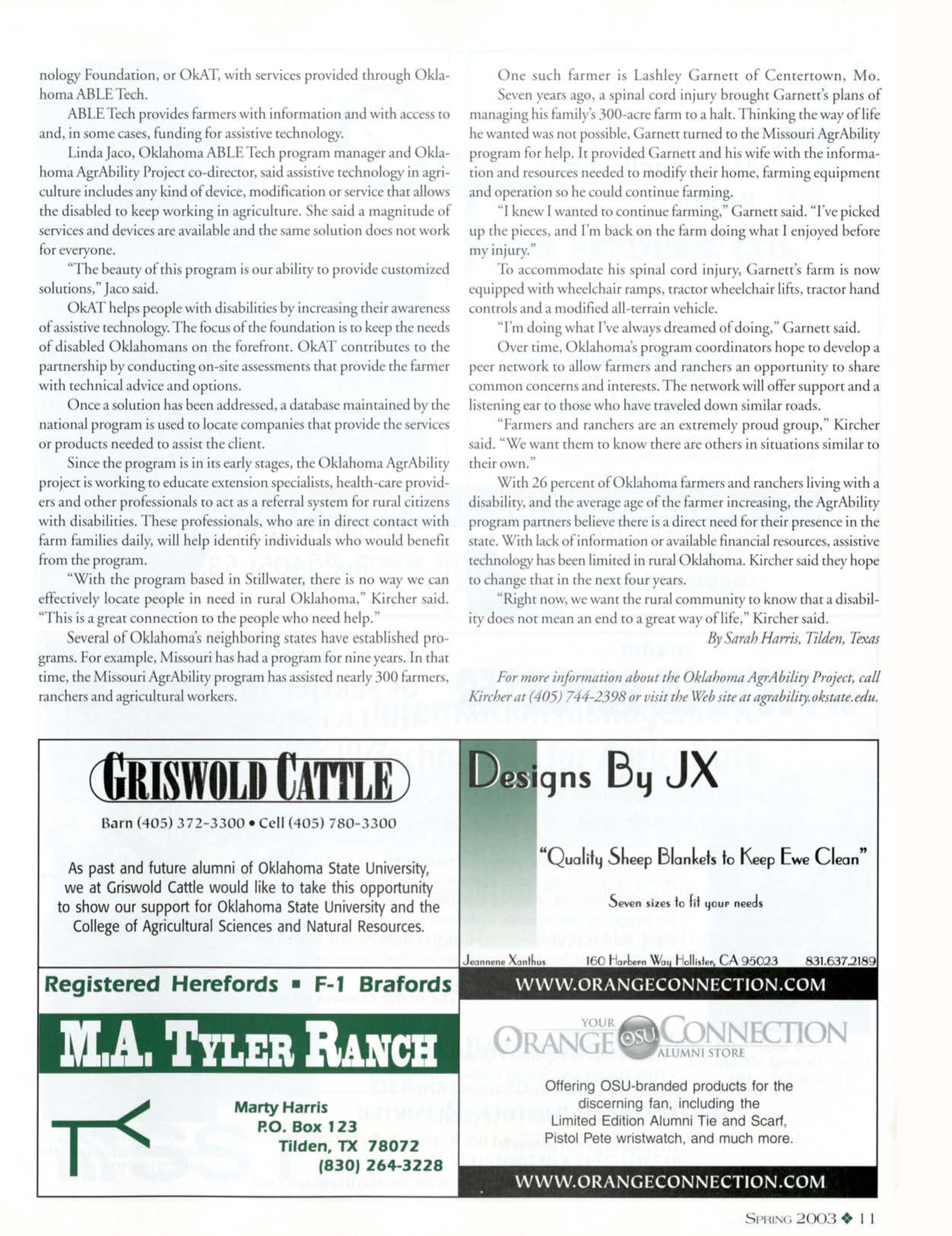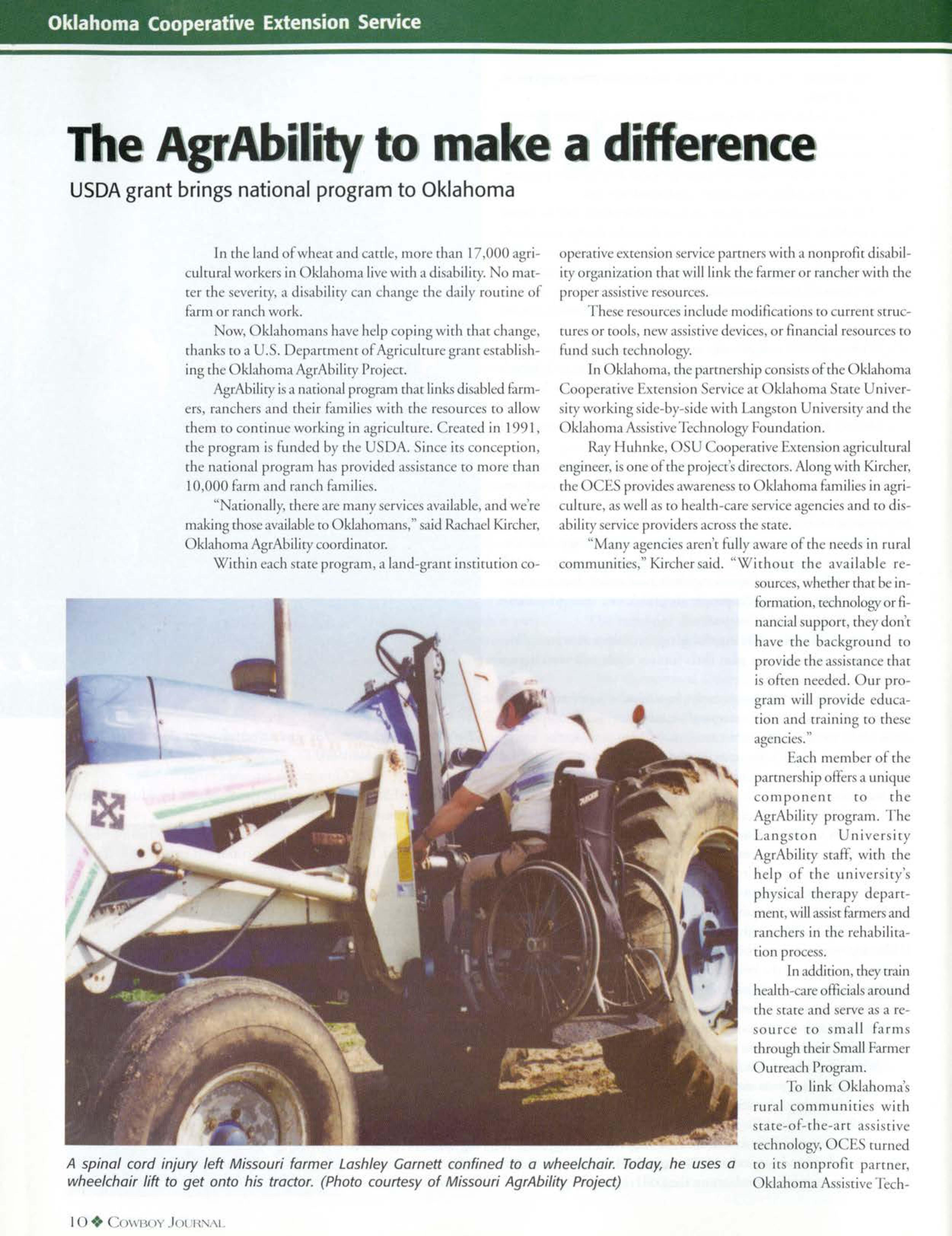 ow, Oklahomans have help oping wich rhat change, dunk ma U .. Deparrmenr f gri ulruregrance cabli hing che klahoma AgrAbilityProje L grAbiliryi an, ci nal pr gram cha lin disabledFarmer , ranchers and their famili wirh the resource· co allow chem co continue working in agriculture. reared in 1991, rhe program i Funded by the D in e ic con eprion, rhe nari nal program has pr vided a i cane c m re chan I 0,000 farm and ran ·h familie.-,. " arionally,th rear many ervi available,, nd we'r making choseavailablero Oklahomans," saidRachael Kircher, klahoma grAbilicy oordinaror.