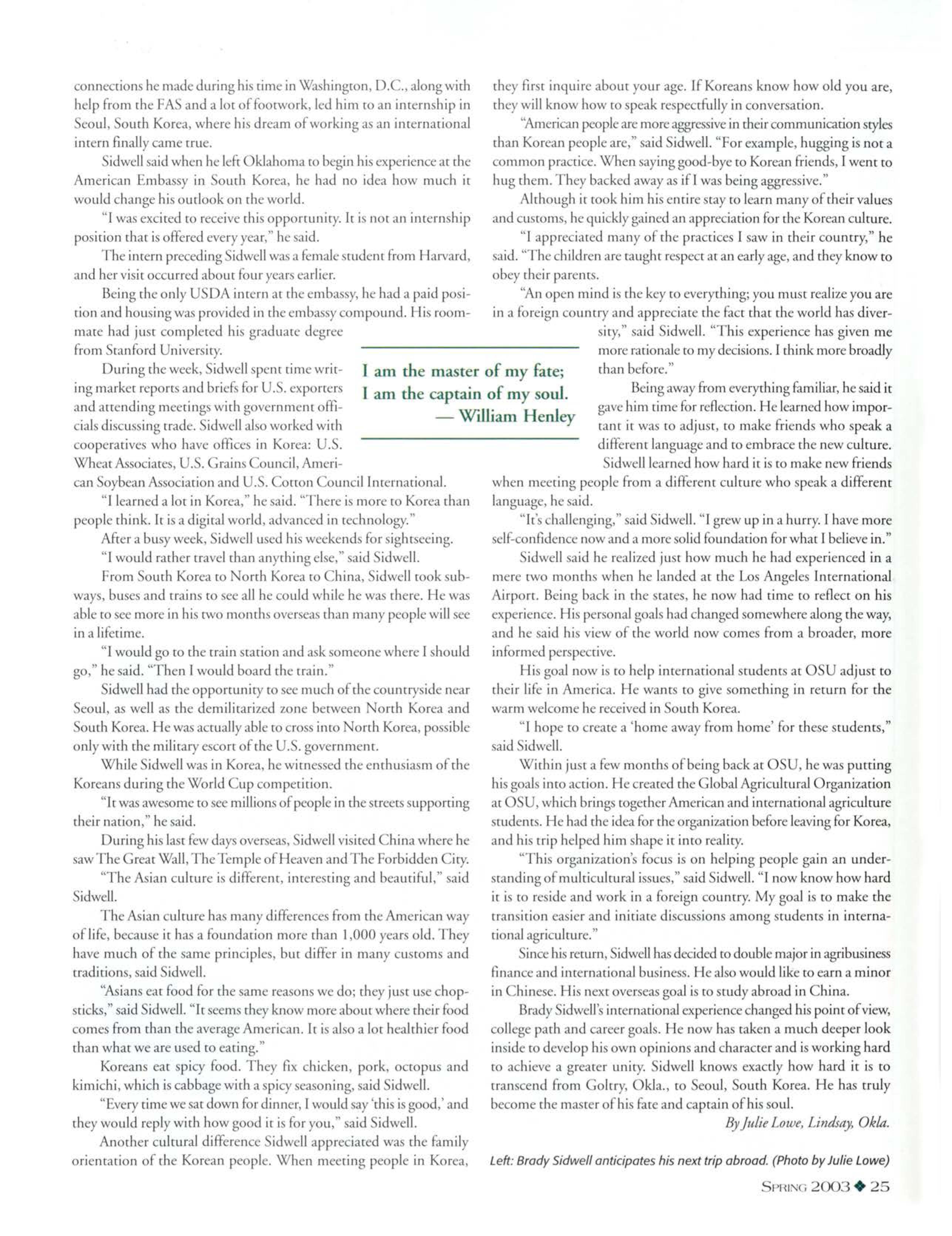 "I became much more aware of the bread ch and ·cope of agricLLlture,of how dynamic the field of agriculture is and rhe incerdepeodence of the various componems of rhe industry," Marcin said.