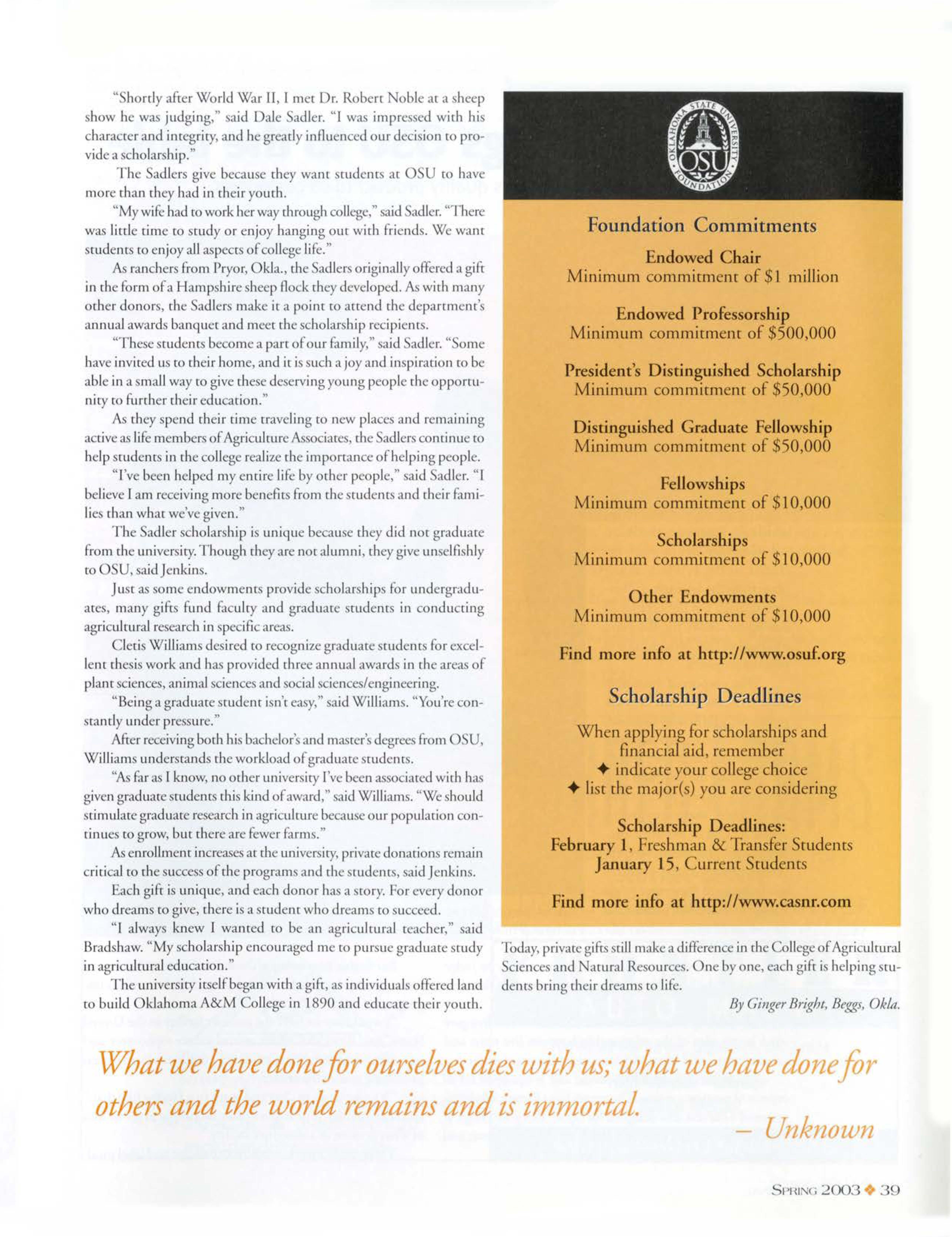 " horcly afrer Wi rid War II, I mec Dr. R ben oble ac a heep show he wru.judging," ·aid Dale adler. "I was impressed wich hi character and integrity, and he greatly inOuencedour decision ro provide a scholar hip."