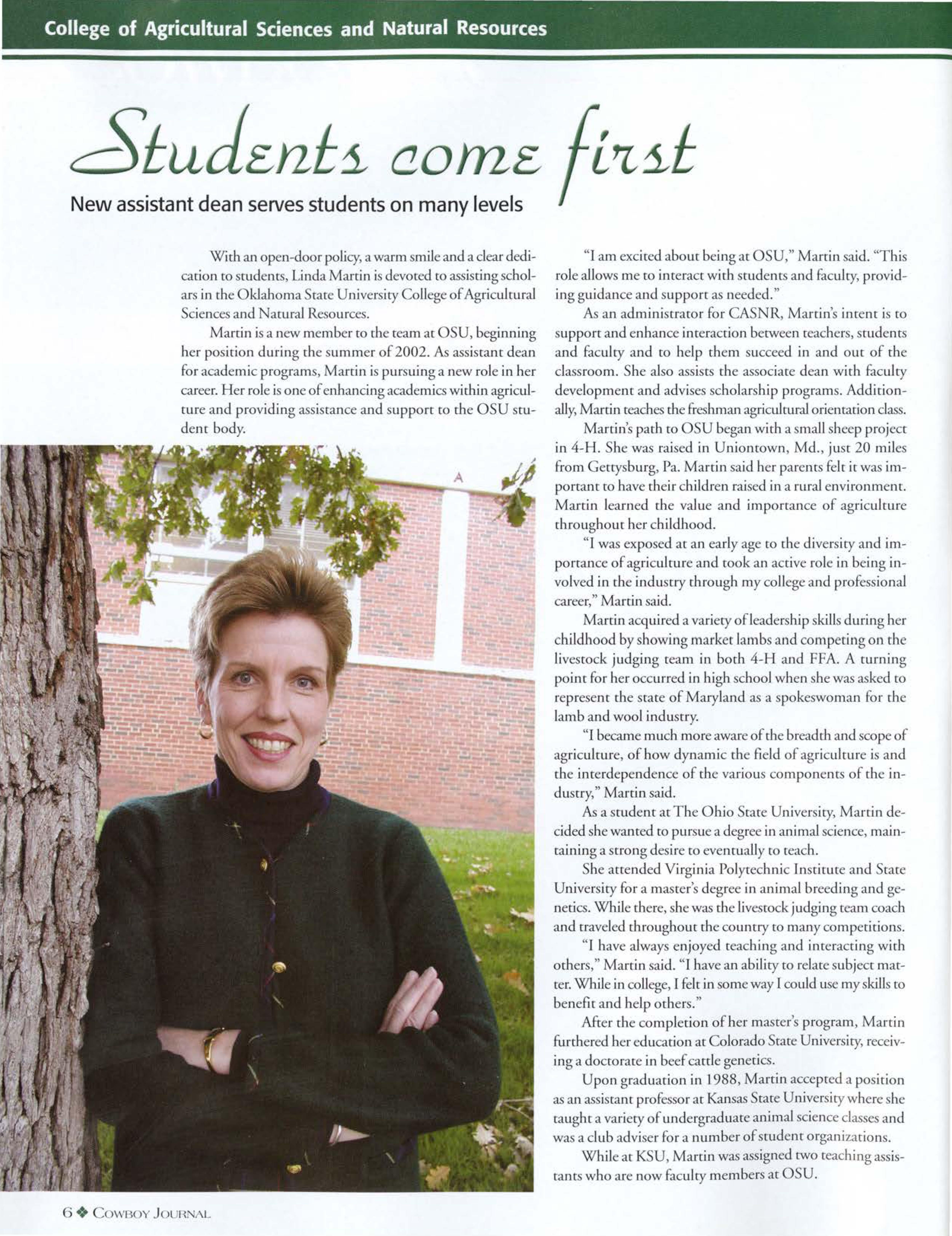 With an open-door policy, a warm smile and a clear dedicacion co srudencs, Linda Martin is devoted ro assisting scholars in che Oklahoma rate niver iry College of Agri uJcural ciences and a.rural Resources.