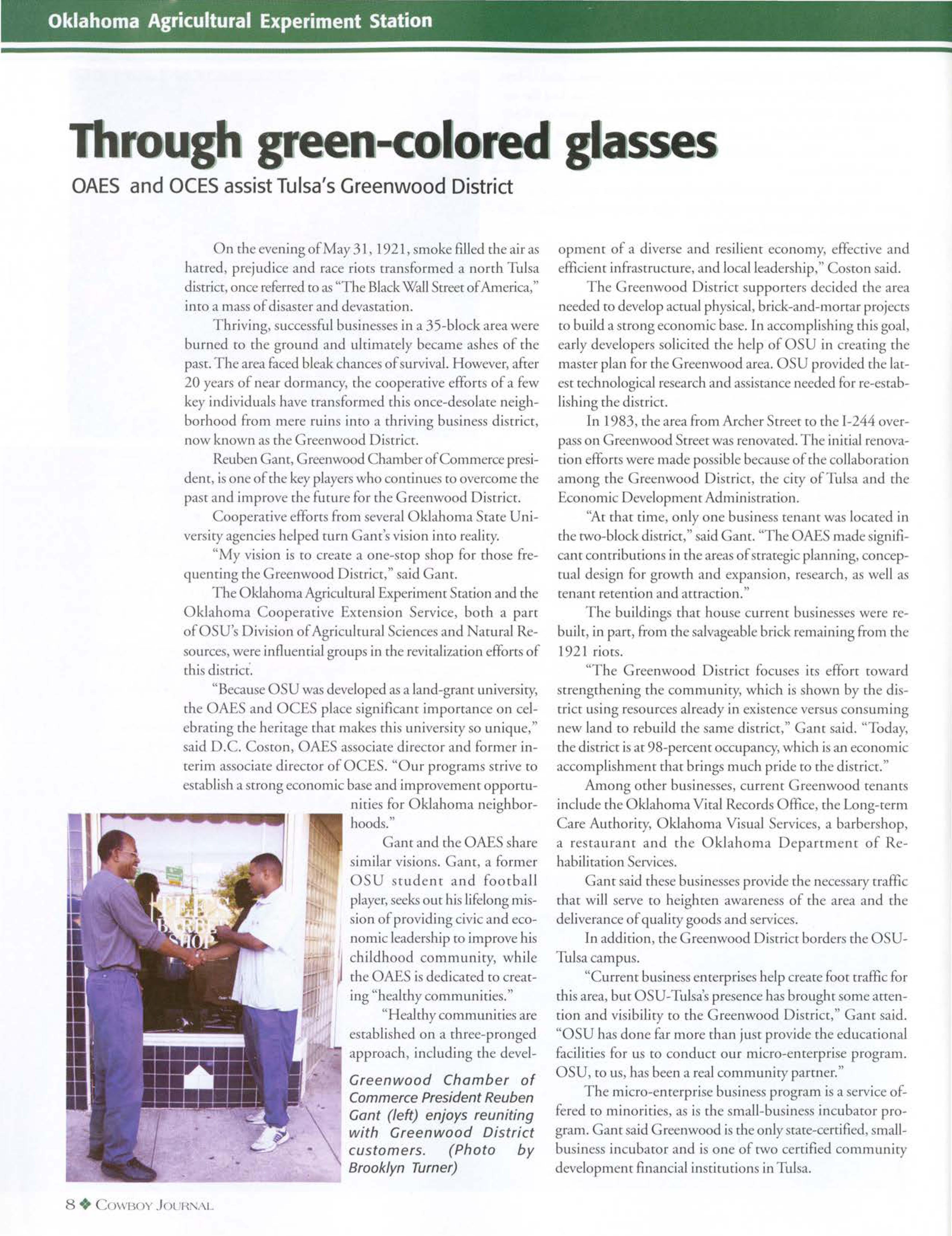 The Greenwood District is just one example of a former OSU student, Reuben Gant, being dedicated to serving others through his lifelong commitment of improving his Oklahoma community. OSU's Division of Agricultural Sciences and Natural Resources allows and challenges students to envision their local Oklahoma communities through "green-colored" glasses in much the same way Gam sees the Greenwood District. As a result, OSU students will continue becoming romorrow's leaders - today.