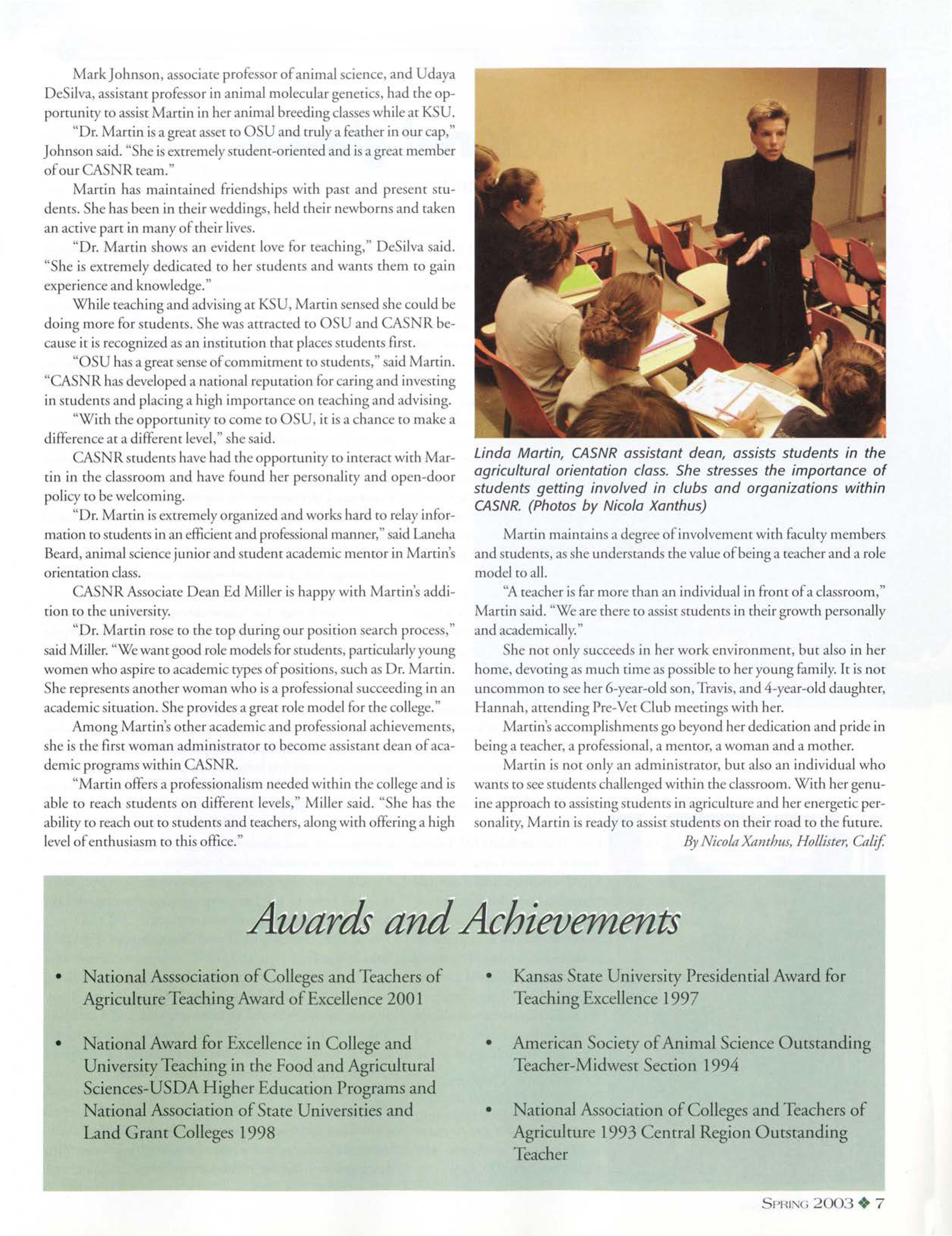 "Dr. Marcin is extremely organized and work hard to relay information to srudenrs in an efficient and professional manner," aid Laneha Beard, animal science junior and srudenr academic mentor in Marci n's orienrarion cla