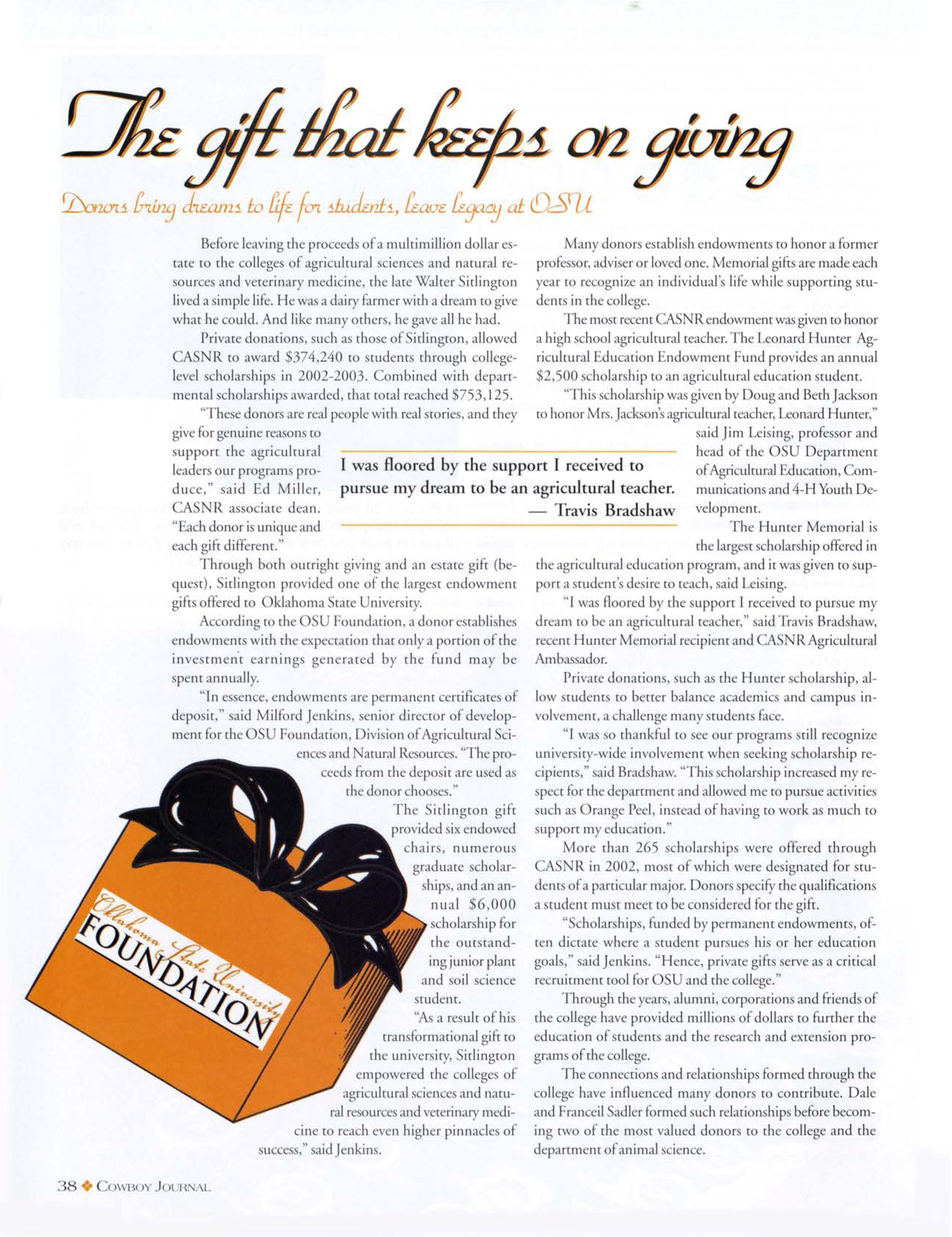 "Thi scholar.hip wasgiven by Doug and BechJa , on to honor Mrs.Jackson'sagriculruralreacher Leonard Huncer" said Jim Lei ing, professor and upp rt rhe agriculrurnl leadersour program produ e." aid 'd Miller, I was floored by the upport I received to