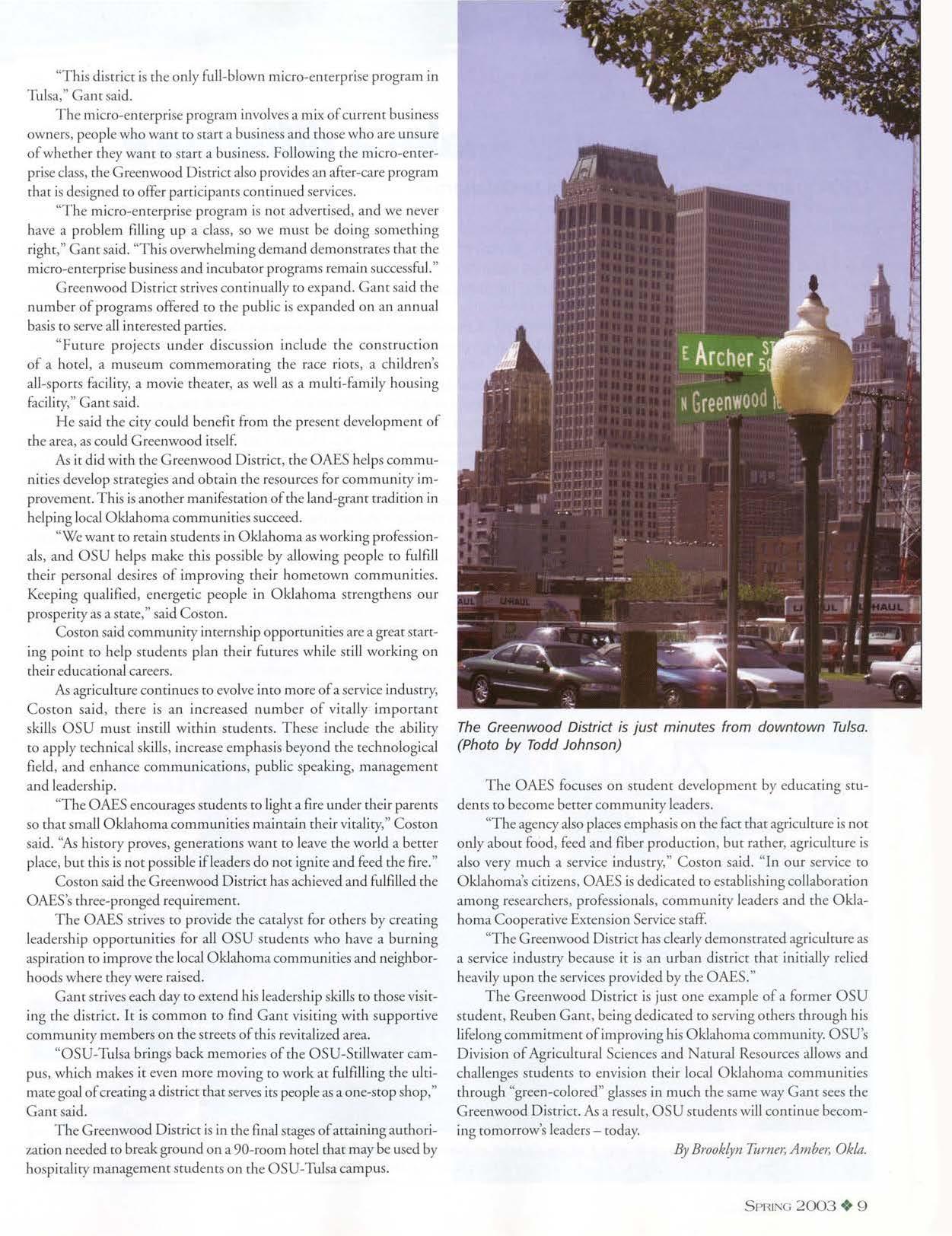 As it did wirh the Greenwood District, rhe OAES helps communiries develop strategies and obtain rhe resources for community improvement. This is another manifestation of the land-grant tradition in helping local Oklahoma communities succeed.