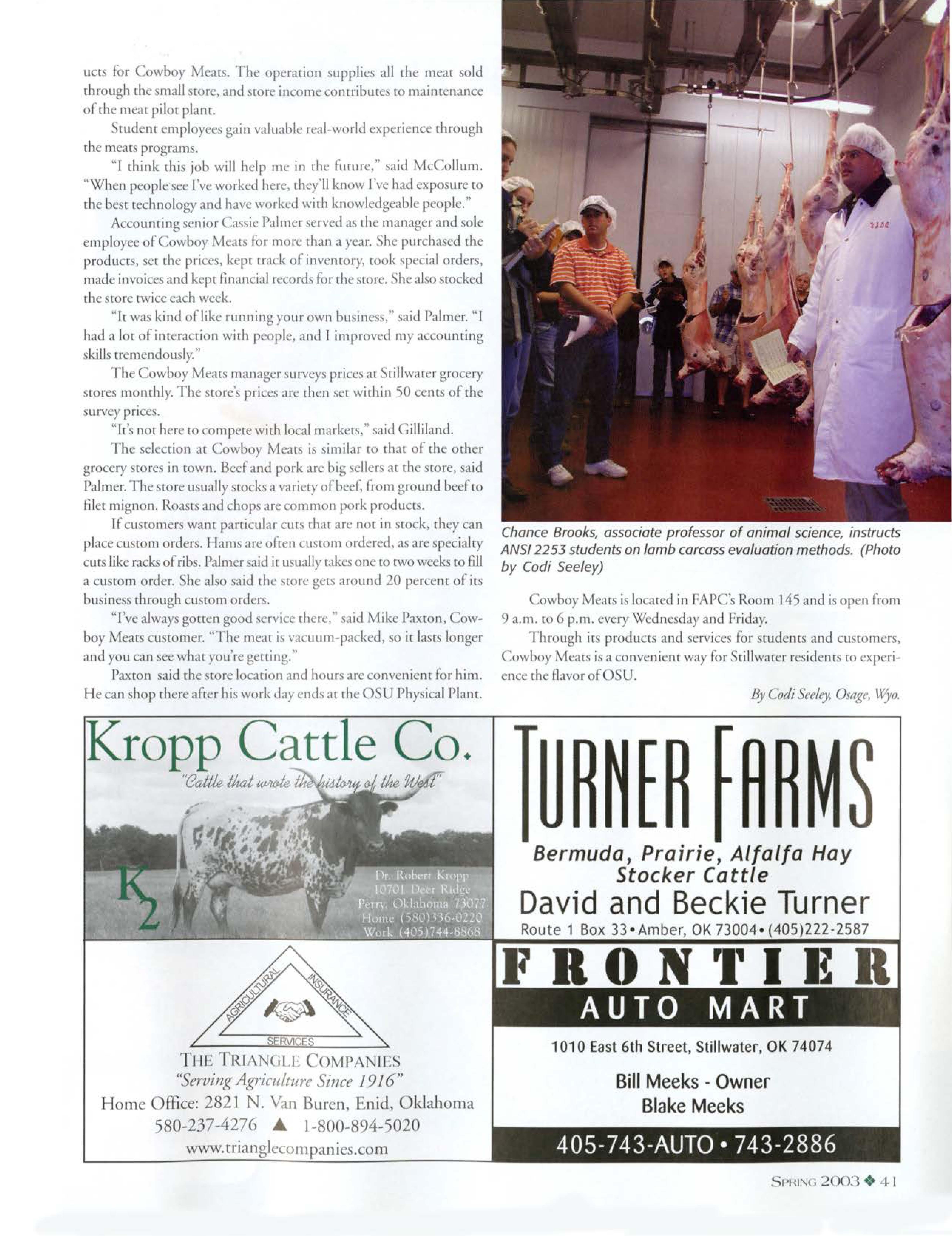 MosLo the produ t old rhrough owboy Mears come from canle, heep and wine rai ed in O U's live rock program , and all of Lhemeal i proe. cd chr ugh FAP rudem u e fa iliries in the enccr to gee hand -on experiencein meat and carcas evaluation. fn fact, cudents in A I 2253, meat :rni-