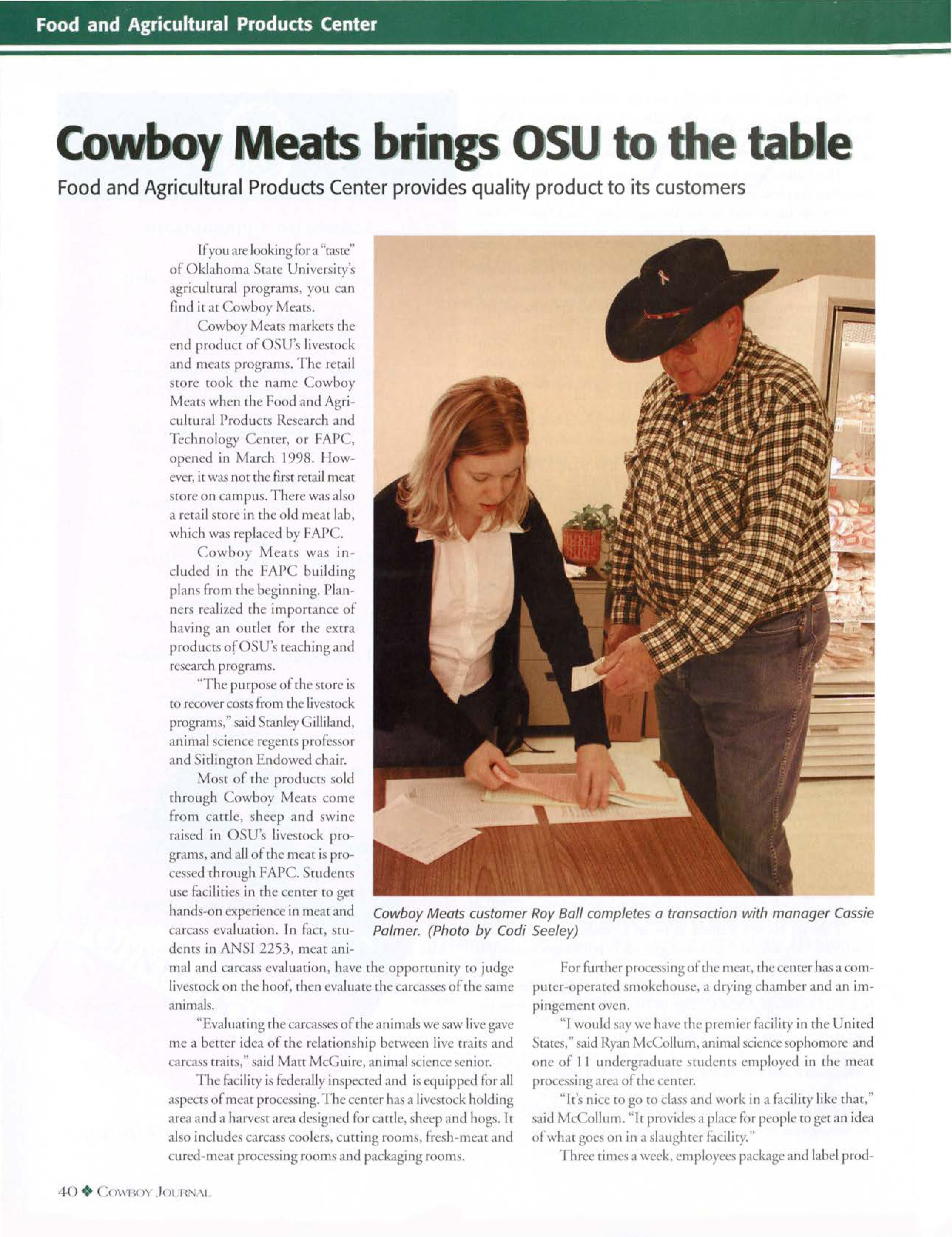 I you arc lookingfora "taste" of klahoma rare Univer iry' agriculrural program·, you can rind icat owboy Meal . owboy Meals markersthe end producr of 's live co k and meal program . The retail t re r ok che name owboy Mcacswh n chc Food and Agriulrnral Produ t Re earch and echnology pcned in ever,icwas nonhe fir t rerailmcac rorcon campu There wa al o a retail tore in rhe Id meaclab, which was replaced by FAP . owboy ea wa included in lhe FAP building plan fr m rhe beginning. Planners realized rhe imporran c of ha ing an ouclcr for rhc extra producrsof 'reahingand re ·ear h pr gram . "The purpo e of the. tore i • tO r ver o r fr m the livescok progmms,"said, can! y illiland, animal cien e regents profe or and irlington • n<lowedchair.