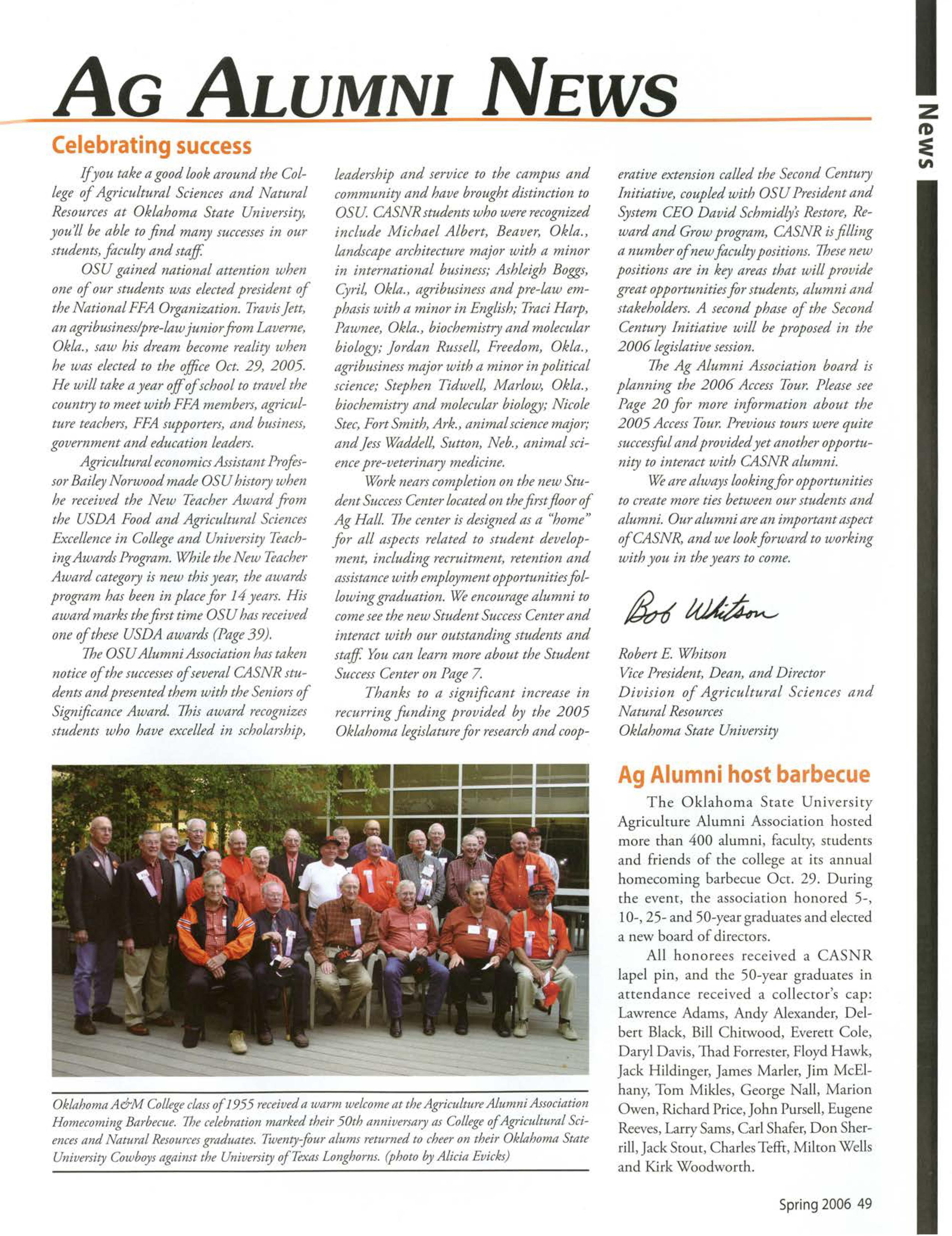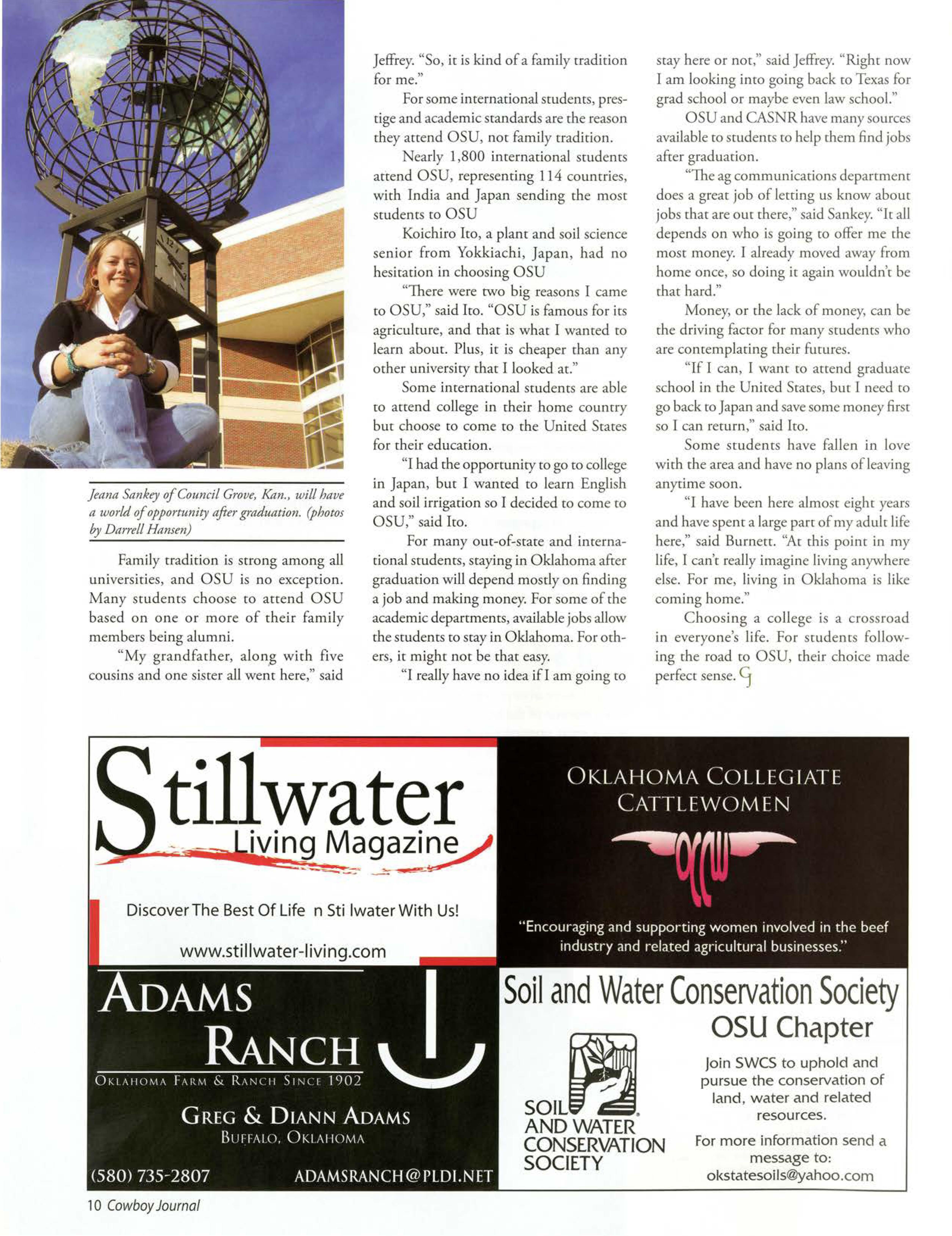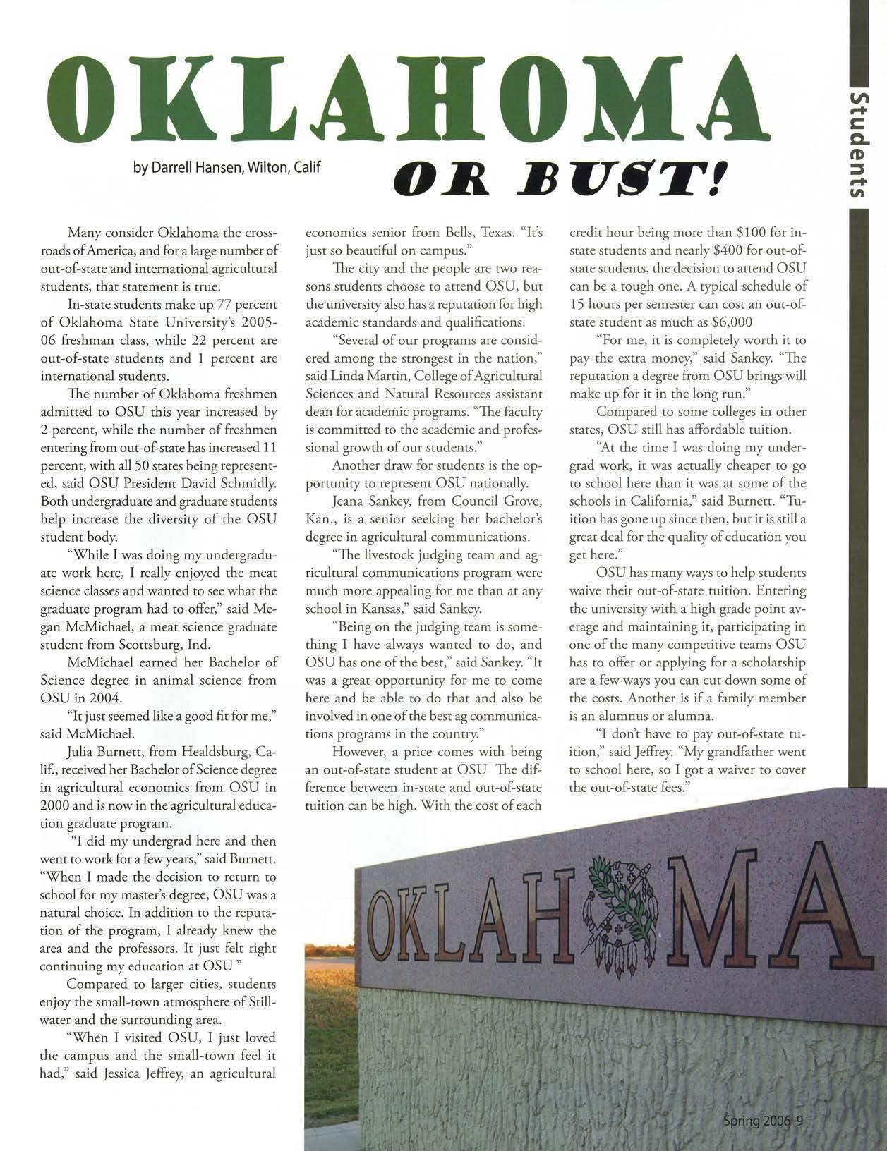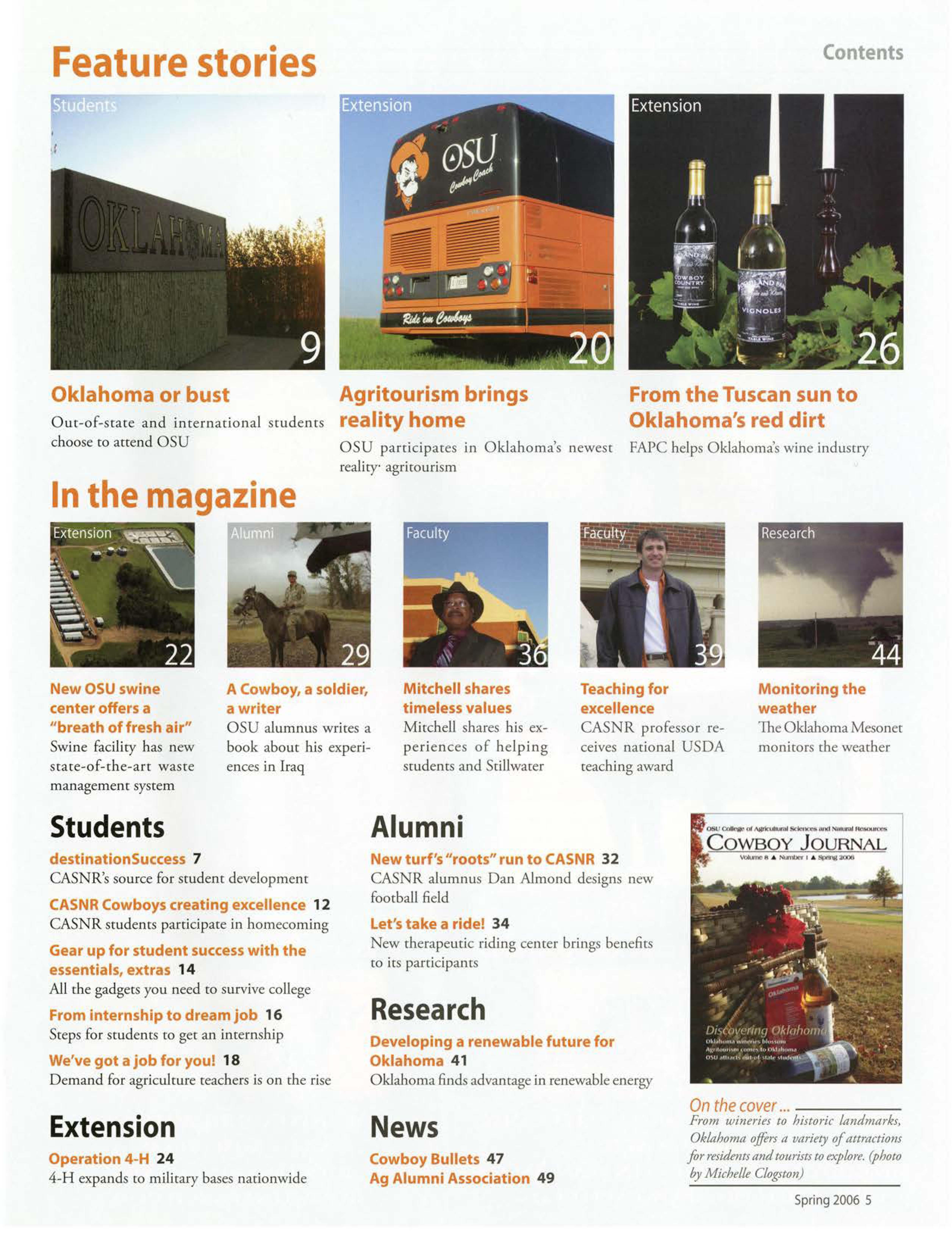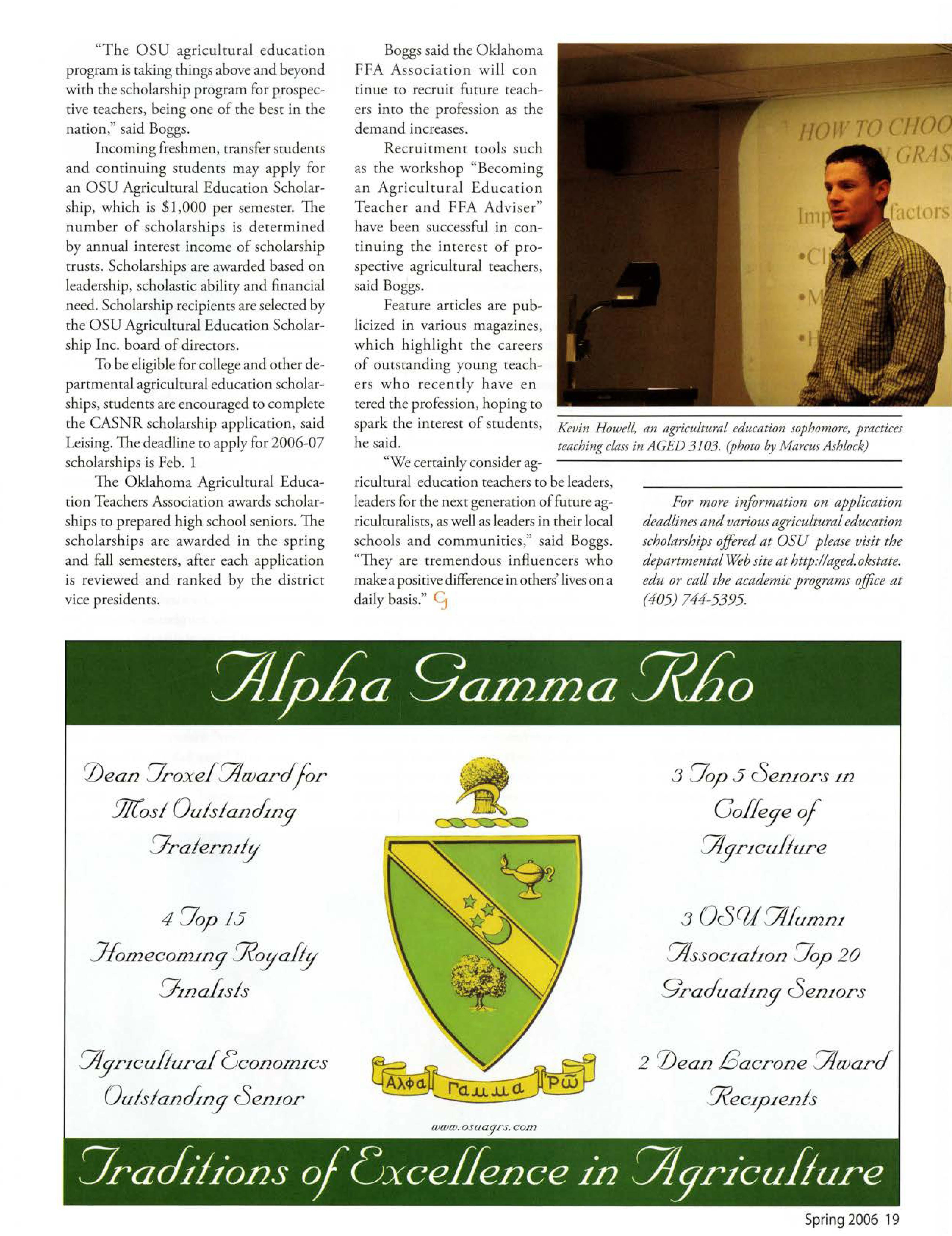 OSU gained national attention when one of our students was electedpresident of the National FFA Organization.TravisJett, an agribusiness/pre-lawjunior from Laverne Okla., saw his dream becomereality when he was electedto the office Oct. 29, 2005. He will take a year off of schoolto travel the countryto meet with FFA members,agricultitre teachers,FFA supporters,and business, governmentand educationleaders.