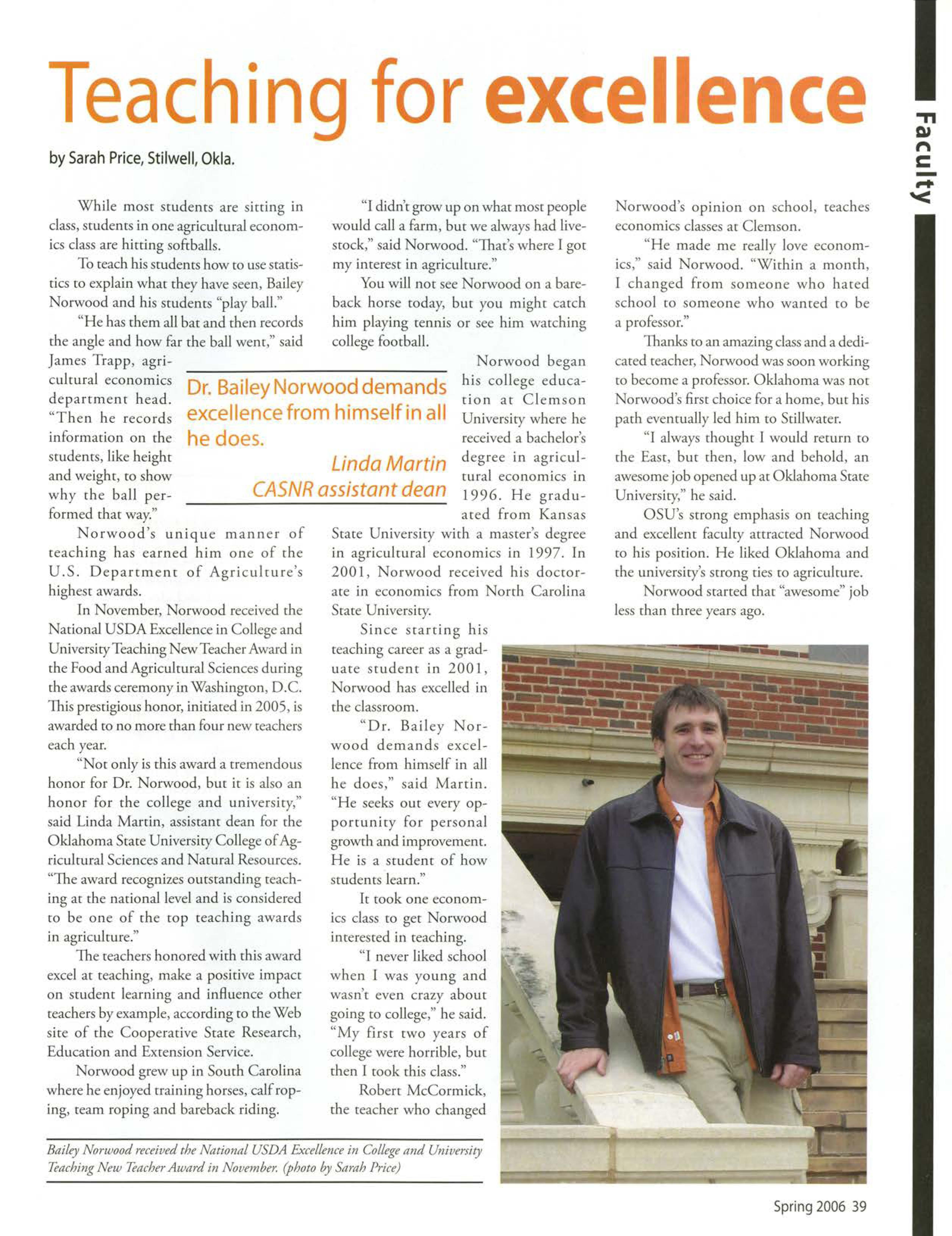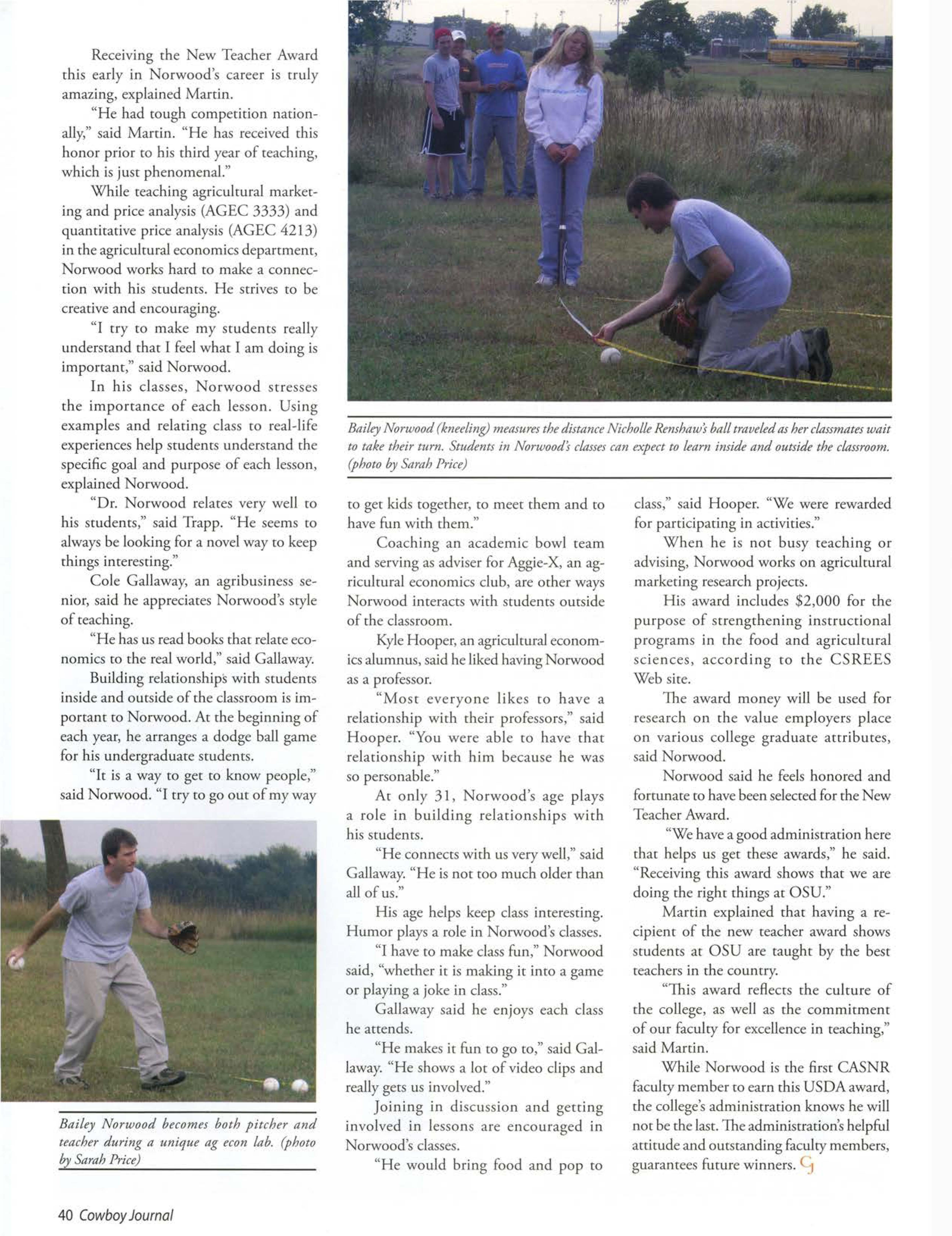AgriculturaleconomicsAssistantProfessorBaileyNorwoodmade O U historywhen he receivedthe New TeacherAward from the USDA Food and Agric.t!tural cienw Excellencein Collegeand Univmity TeachingAwardsProgram.While the New Teacher Award categoryis new thisyear; the awards programhas been in placefor 14 years.His award marksthefirst time OSU has received one of these USDA awards (Page39).