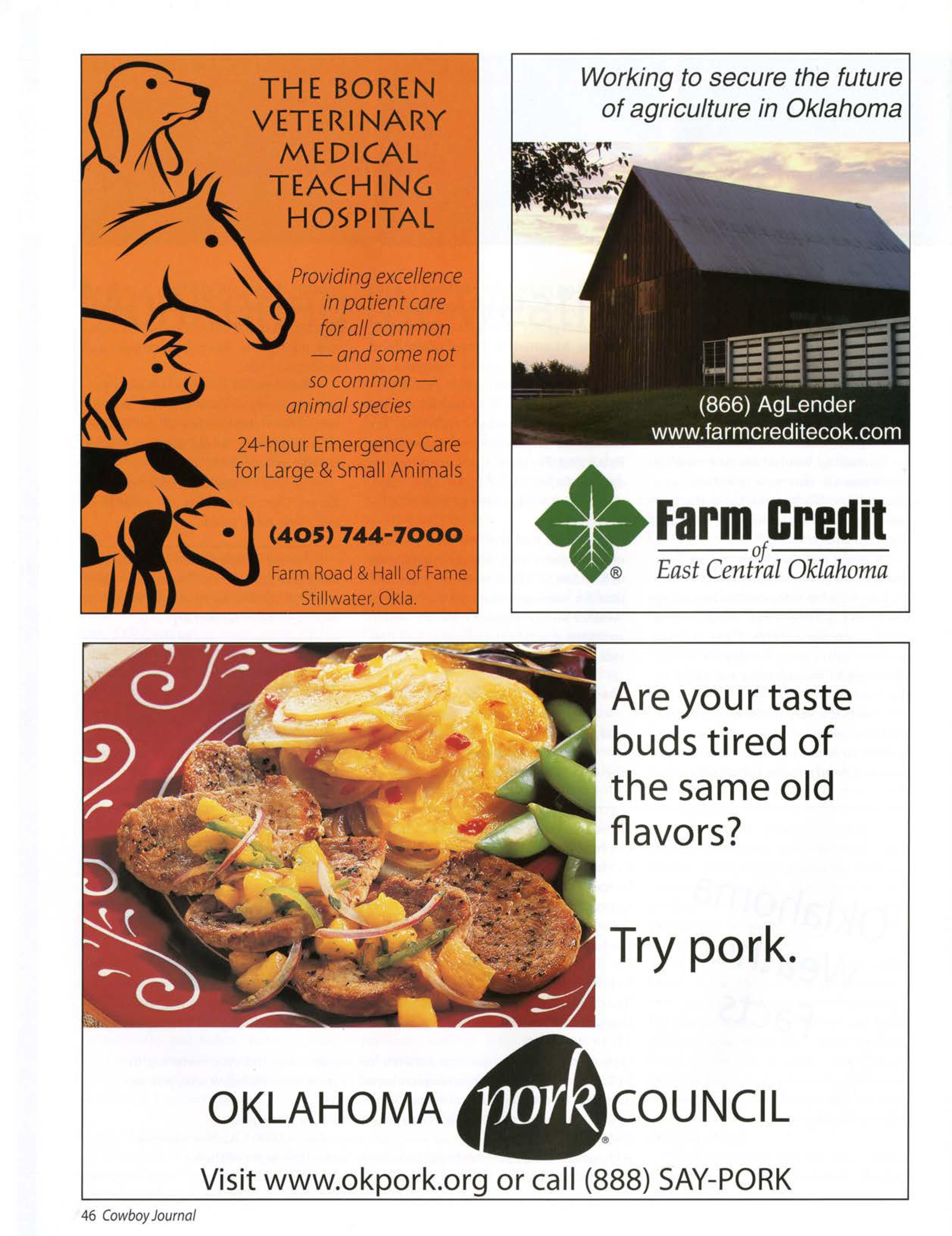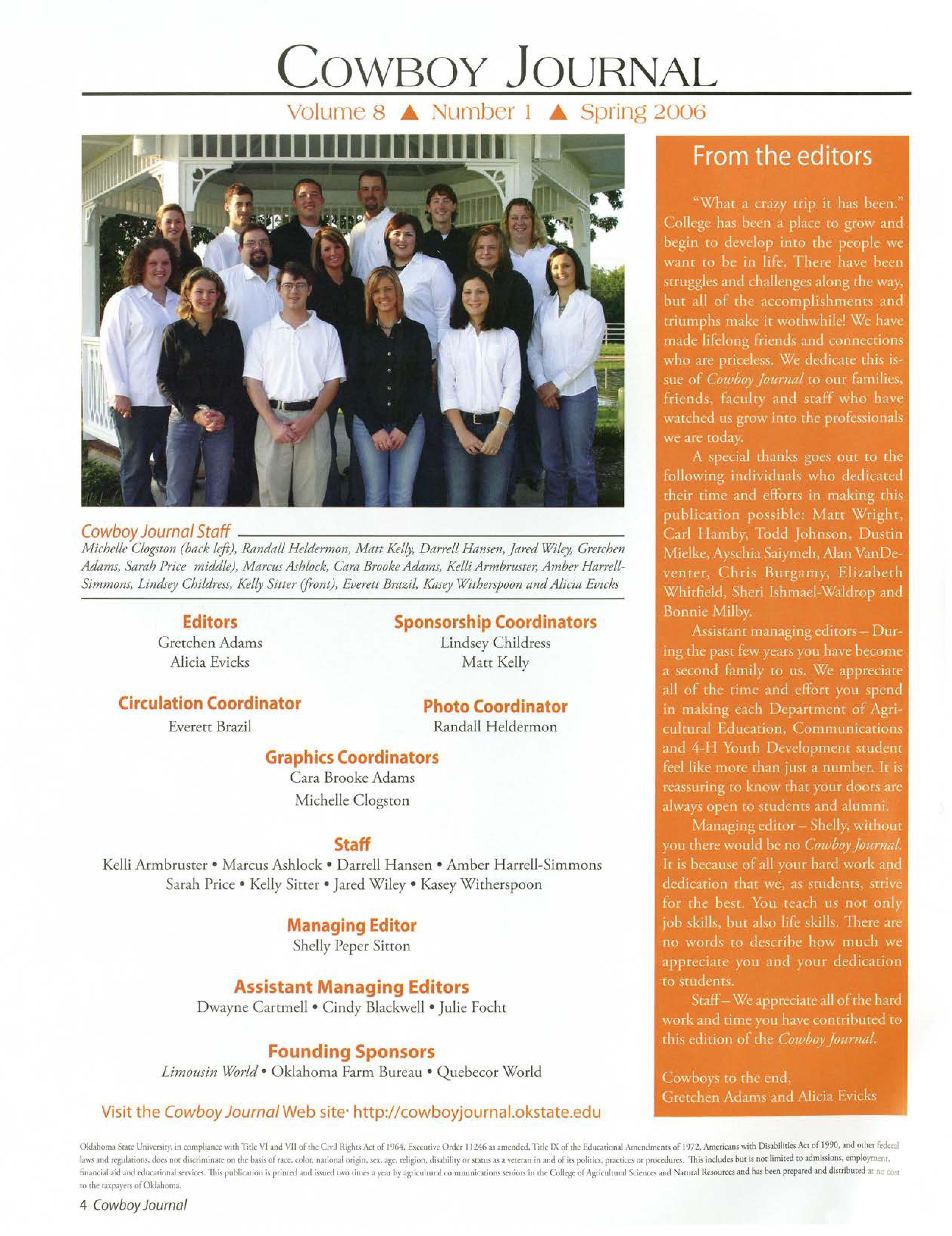 Visit the Cowboy Journal Web site· http://cowboyjournal.okstate.edu Oklahoma~r.ue-Uni\~r!iiry,in compli=-oo::withTitleVI Jnd Vil of the C!YURlght.S1kt of 1964,b«uth•e Or<ler11246:;is .;imi:nded.·nt1cIXof rhc-EdtK',.uion.:JAmcndmenuof 1972,Amt:ricamwith DisabililiCliAn of 1990,and o,hcr f~e':.i bw,:1nd regul:ation!,d~ n,ordiscrimin:atton the \wilsof me, coto,.n:111on:1l0nJin .sex.i1!J;C:,religion,disabili'}·or scams~ a ,,.-ner.m in and o iu.poli1ta.pr,1cti~or procedu~- "fhi.sincludesbut is not limi1~ m admissions,c:mploymcn,. fin:inti.da.it.I;andtduc.uionJIii:nices.Thi~p1.1hlia1io11is-print~i ,;am.Ii~i:<I two rimesJ ,,earby J.Sriculmnlcommunlc.uioruscniol'!iin 1hc >lli:geof Agrir.uhunlxicnce5 Jnd N':ituralRc:soutUSand h:1$btt:n prepucd and dimib,.m:d,11 no c, 1 to ,n~1apiyeN ofOkl11.hi0ma. 4 CowboyJournal